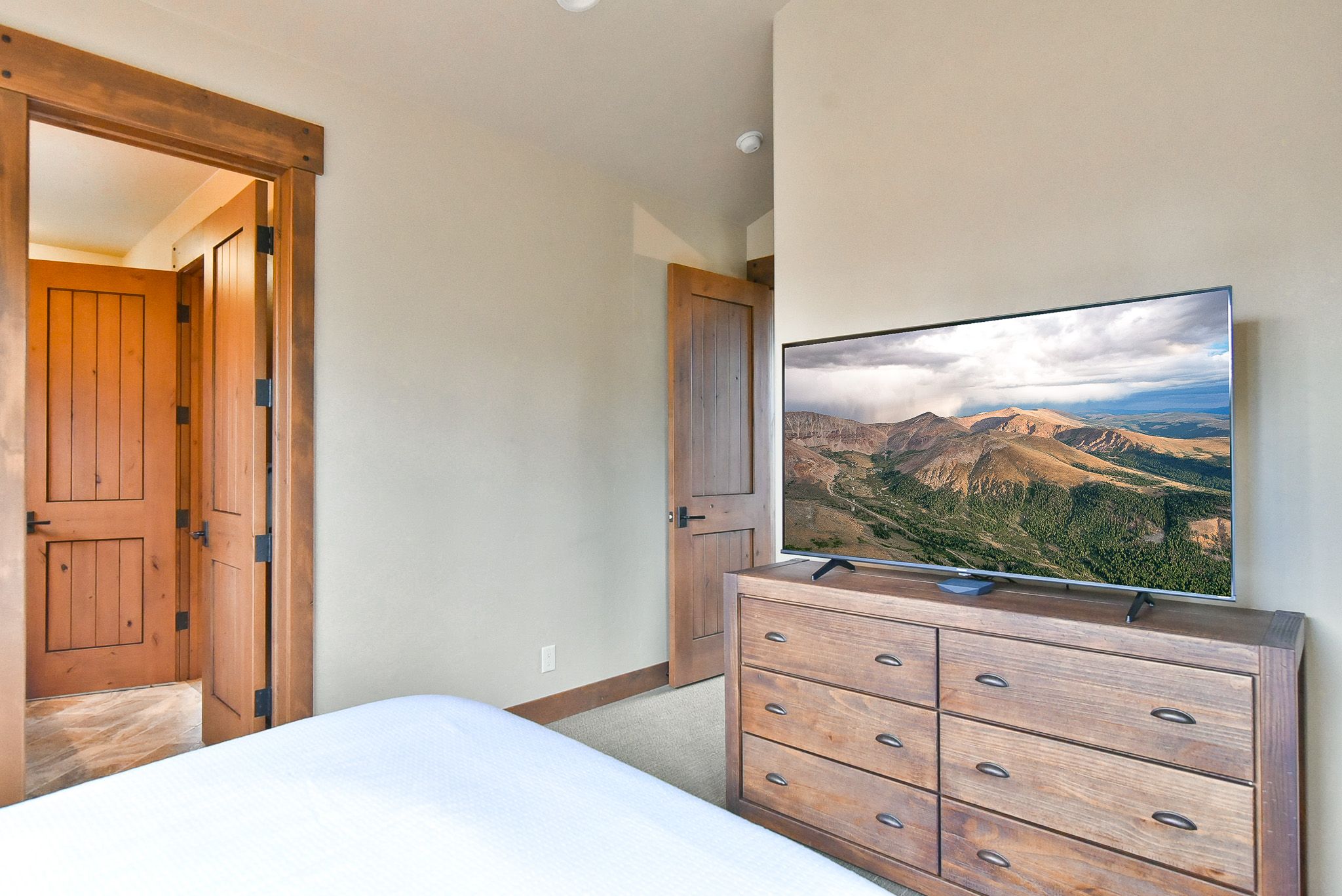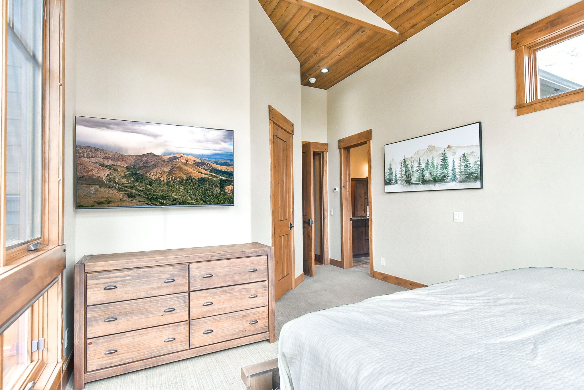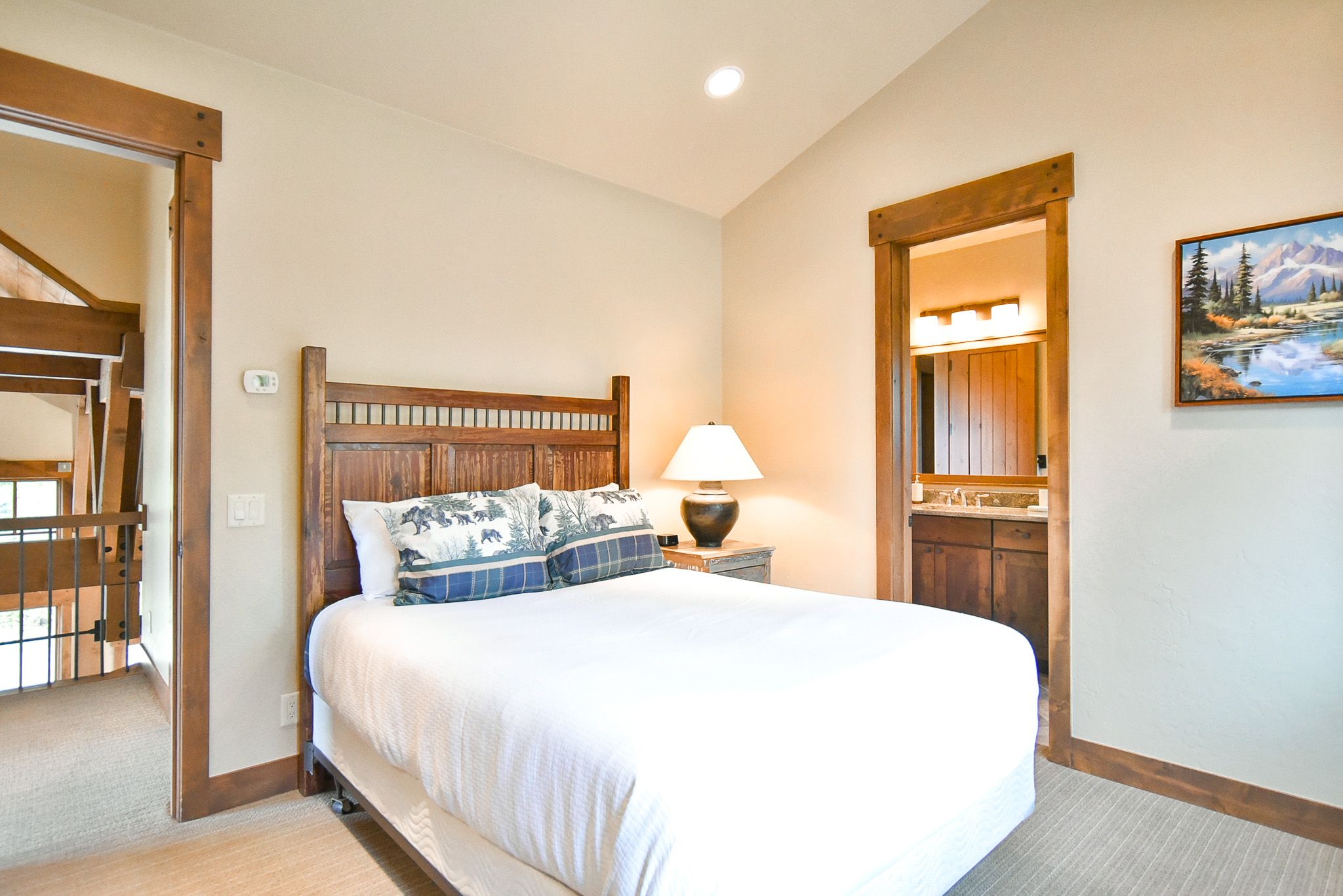 The spacious primary suite serves as a private retreat on the main level, complete with vaulted ceilings, a plush king bed, and an elegant ensuite bathroom with dual vanities, a walk-in tile shower, and a soaking tub. Upstairs, two queen bedrooms—each with vaulted ceilings and one featuring a Smart TV—share a well-appointed full bathroom with a walk-in shower. A cozy bunk bedroom offers the perfect hideaway for kids or additional guests. The lofted sitting area provides extra space to read, relax, or catch up on remote work.