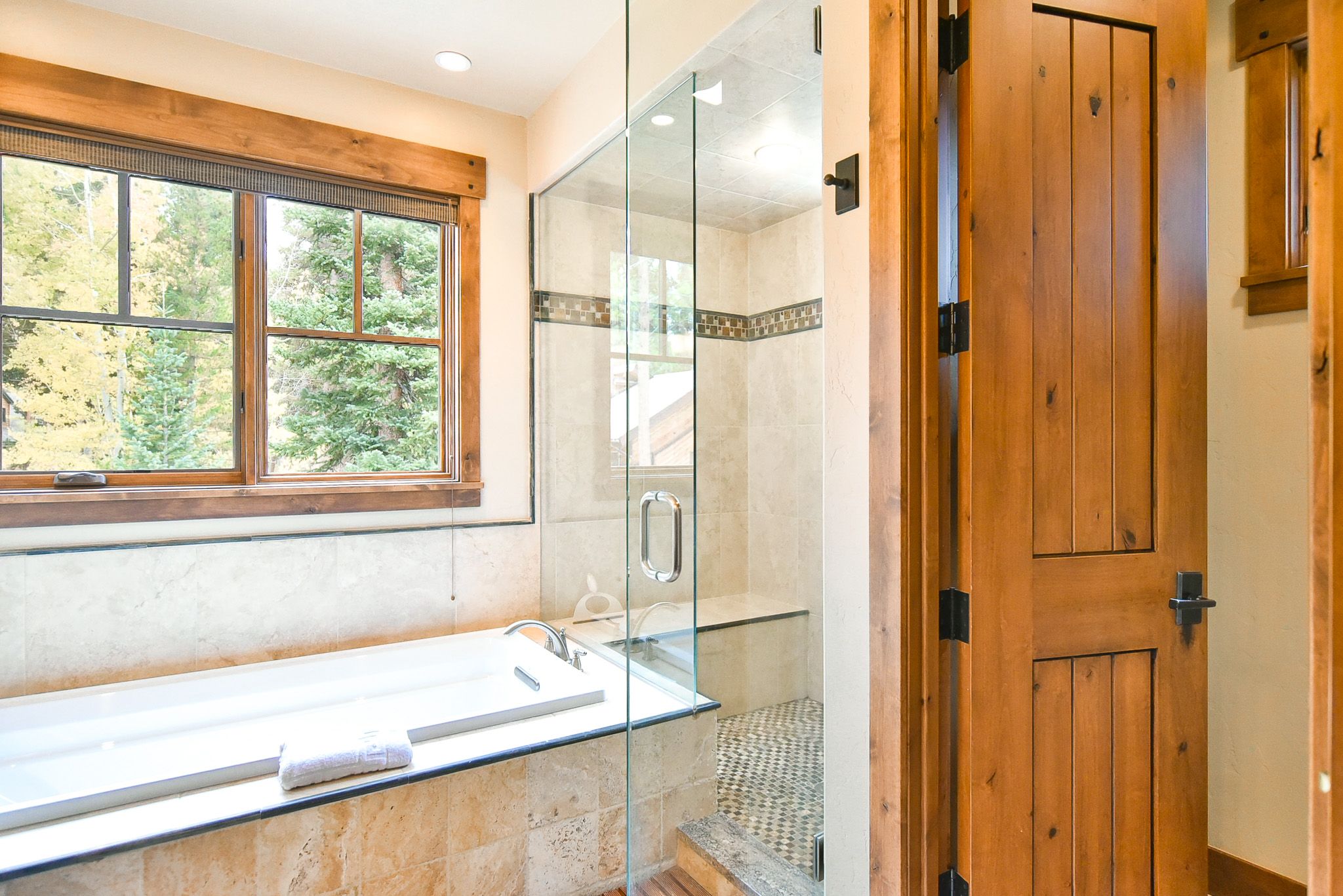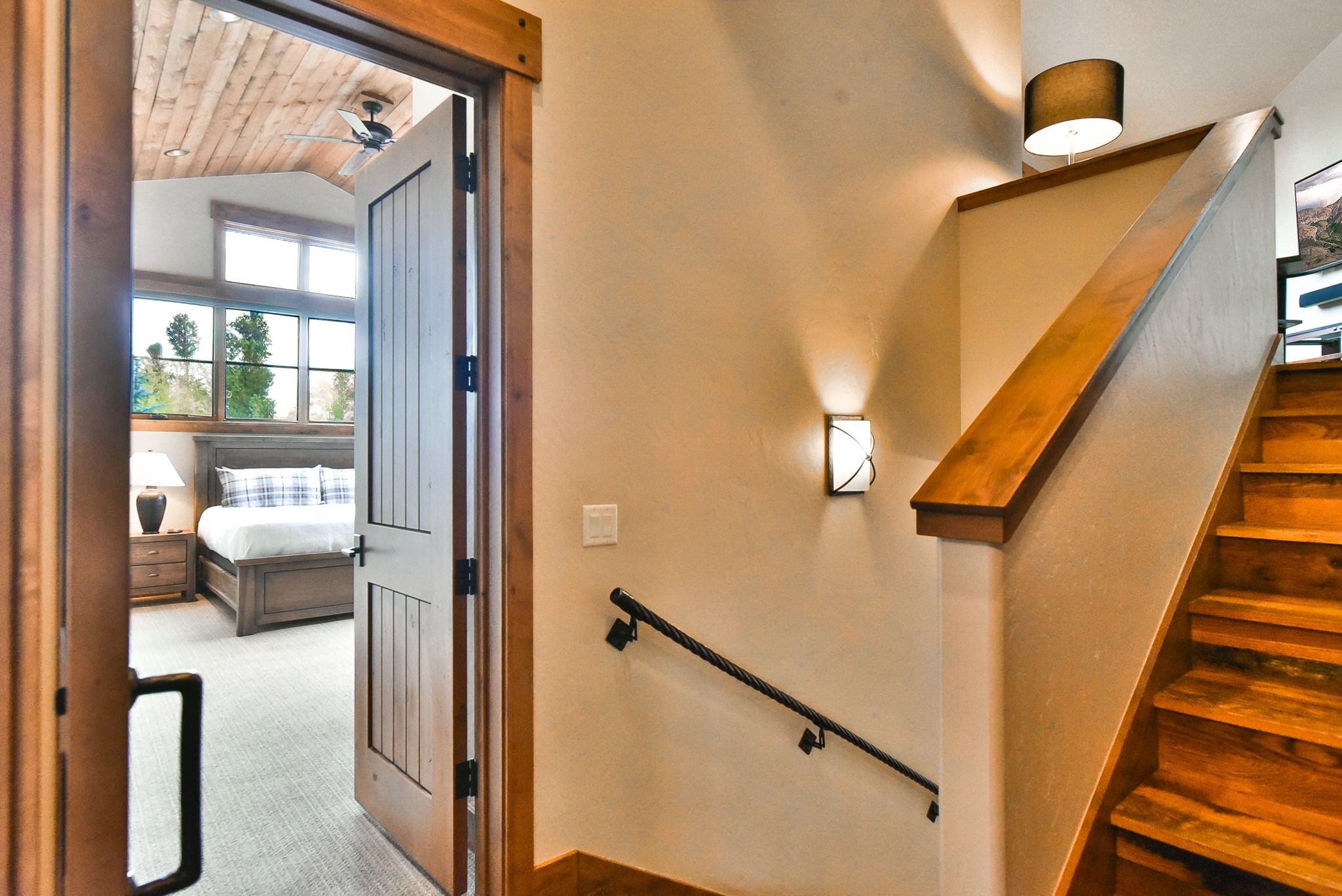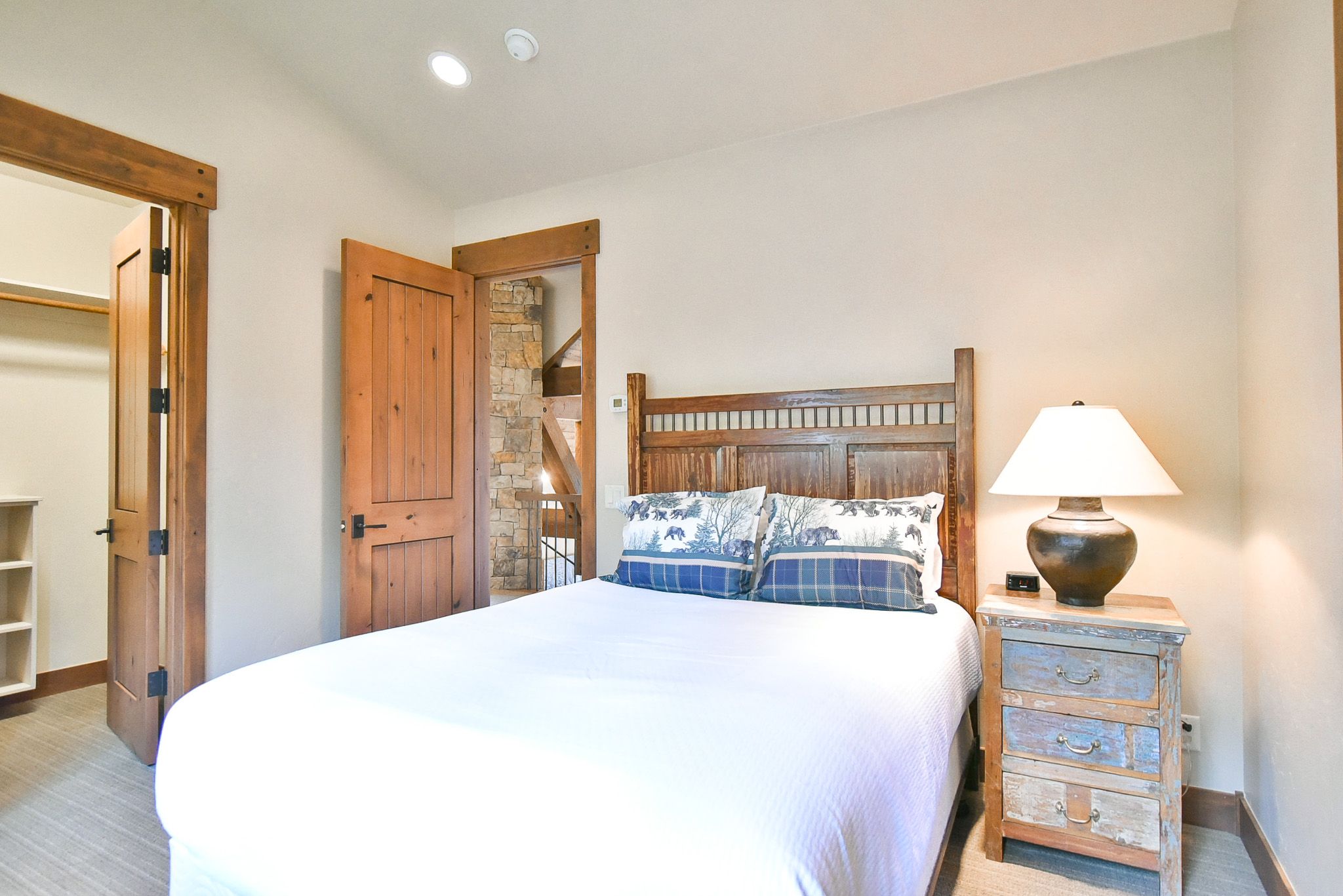 The spacious primary suite serves as a private retreat on the main level, complete with vaulted ceilings, a plush king bed, and an elegant ensuite bathroom with dual vanities, a walk-in tile shower, and a soaking tub. Upstairs, two queen bedrooms—each with vaulted ceilings and one featuring a Smart TV—share a well-appointed full bathroom with a walk-in shower. A cozy bunk bedroom offers the perfect hideaway for kids or additional guests. The lofted sitting area provides extra space to read, relax, or catch up on remote work.