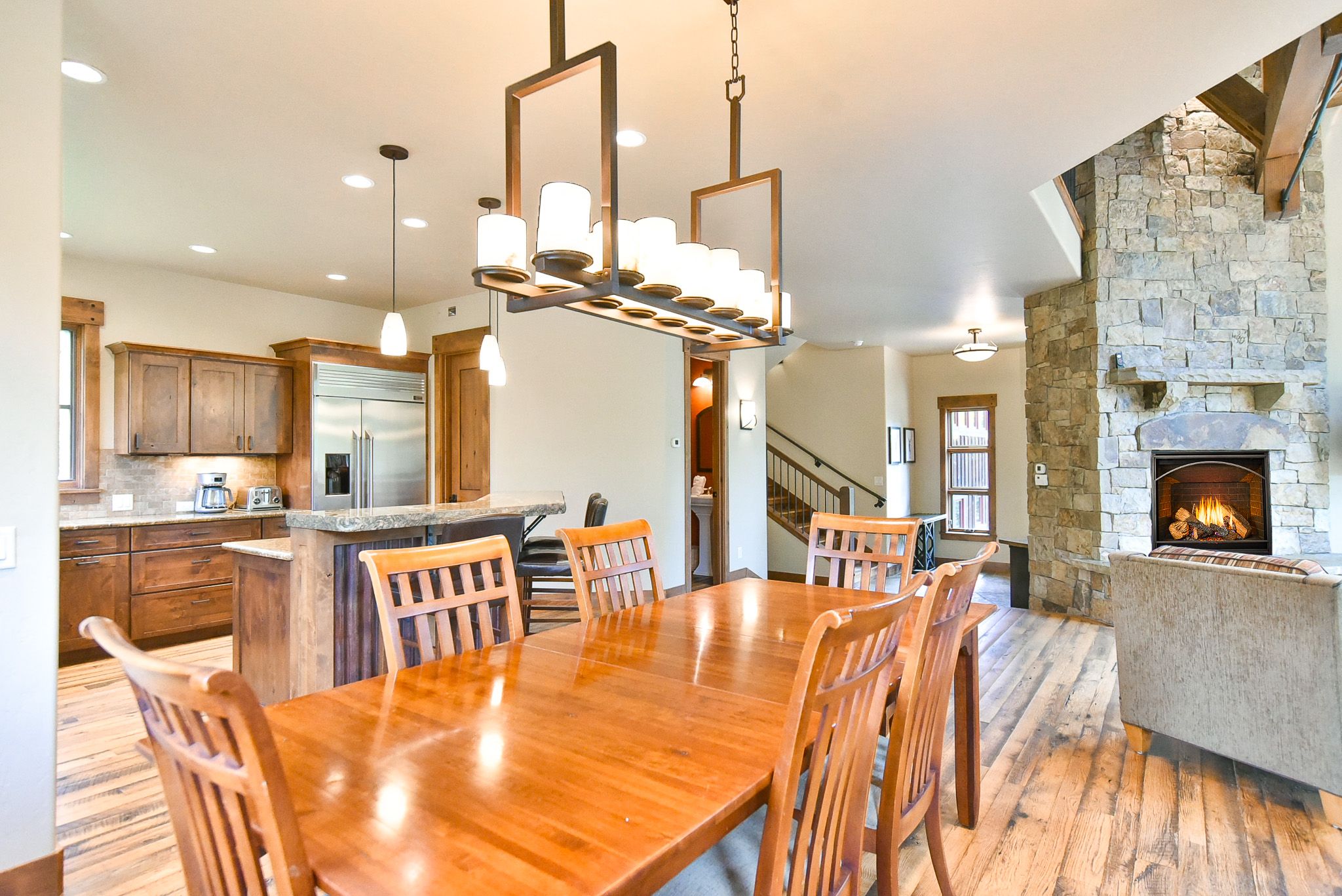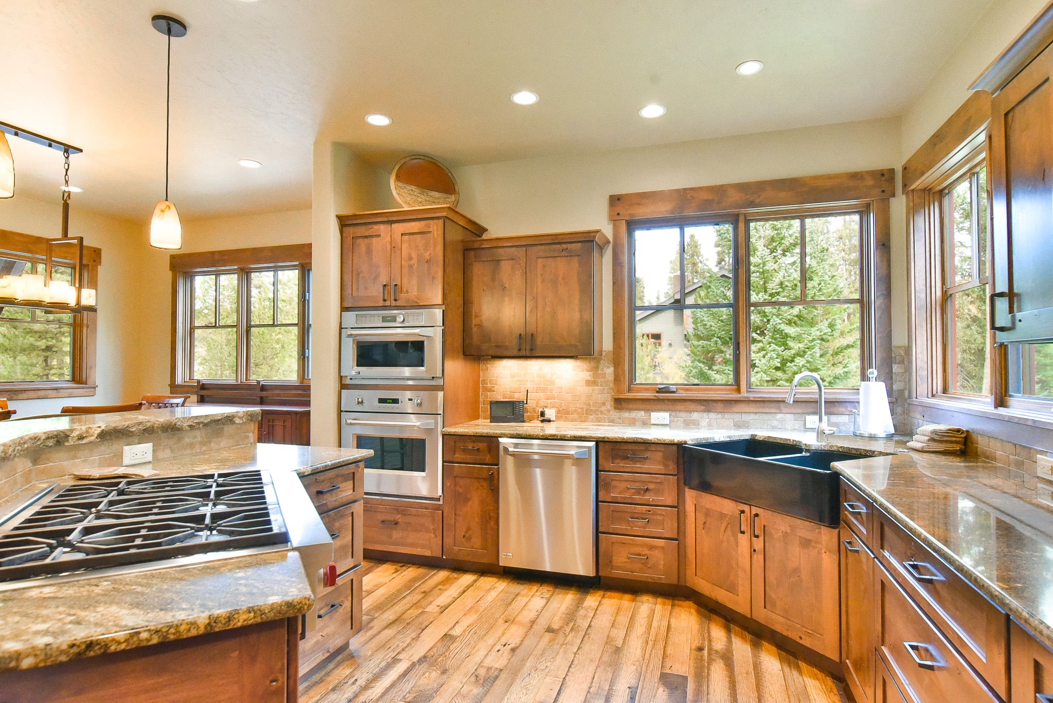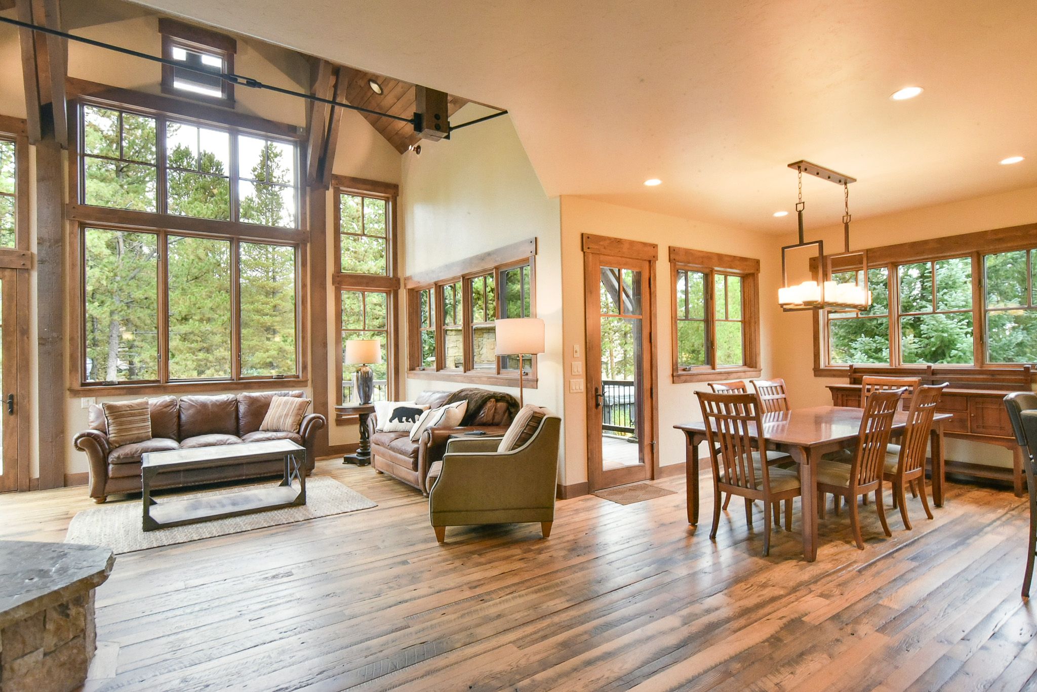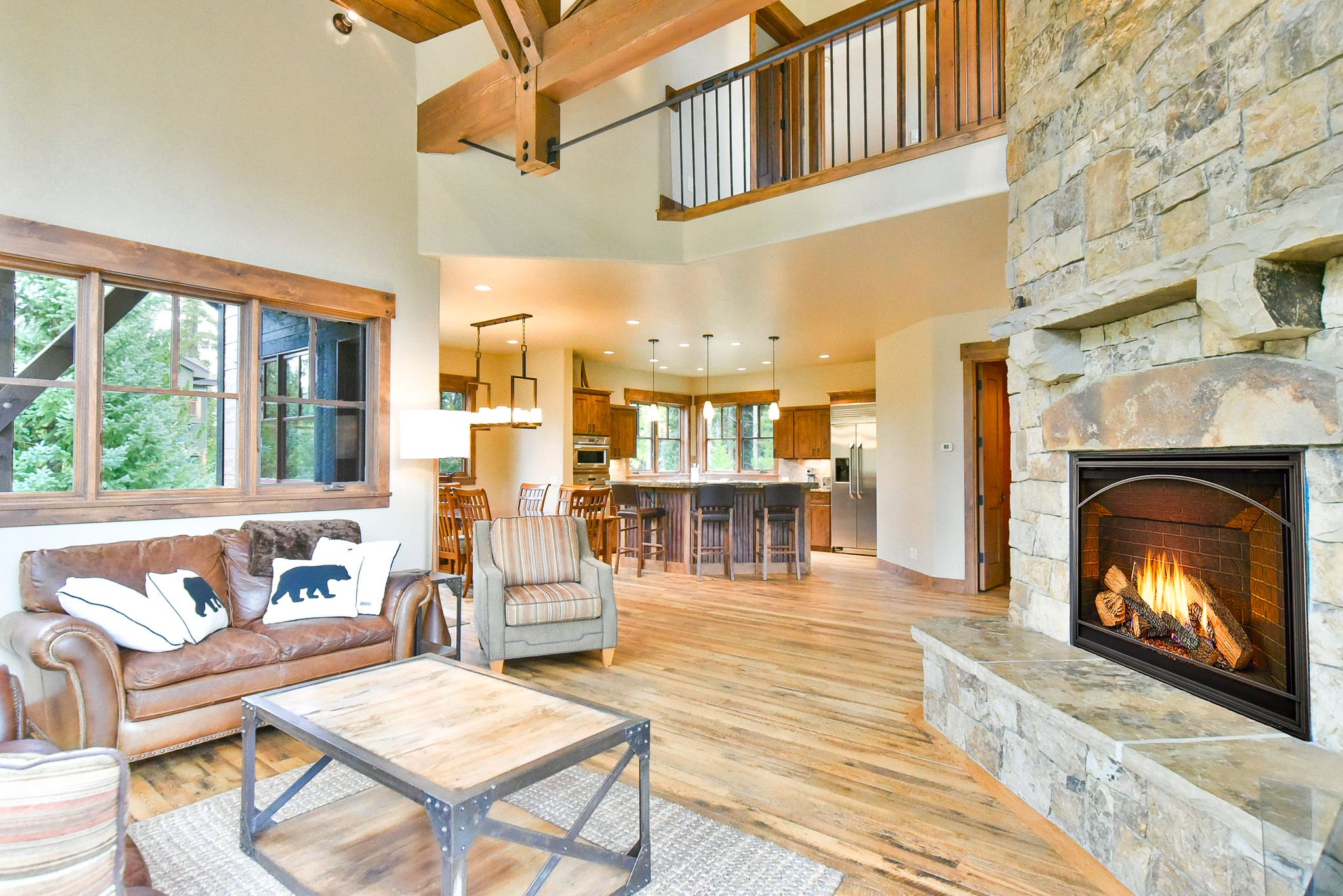The main living area showcases the home’s impressive craftsmanship with soaring vaulted ceilings, floor-to-ceiling windows, and a striking gas fireplace anchoring the space. The room’s natural light and forest views set the tone for relaxation, while a plush seating area and smart TV make it the perfect gathering spot after a day outdoors. The adjacent chef’s kitchen is both elegant and functional, featuring granite countertops, stainless steel appliances, a gas range, dual ovens, and a generous breakfast bar. A large dining table sits nearby, perfect for shared meals and conversation long into the evening.
