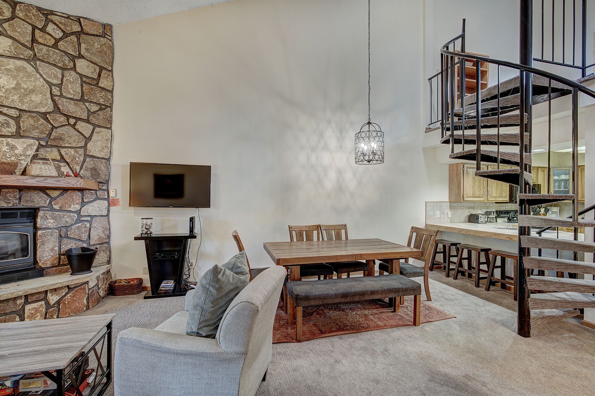Atrium Eagle is a large (1,562 square feet) condo that’s perfect for groups of up to ten people. Vaulted ceilings and plenty of light give this unit an open, spacious feel. On the main level, the living area features a floor-to-ceiling cobblestone gas fireplace and large flat-screen TV — it’s just the place to relax after a long day on the slopes for drinks, conversation and a favorite movie. There’s even a balcony and gas grill right outside the patio door.