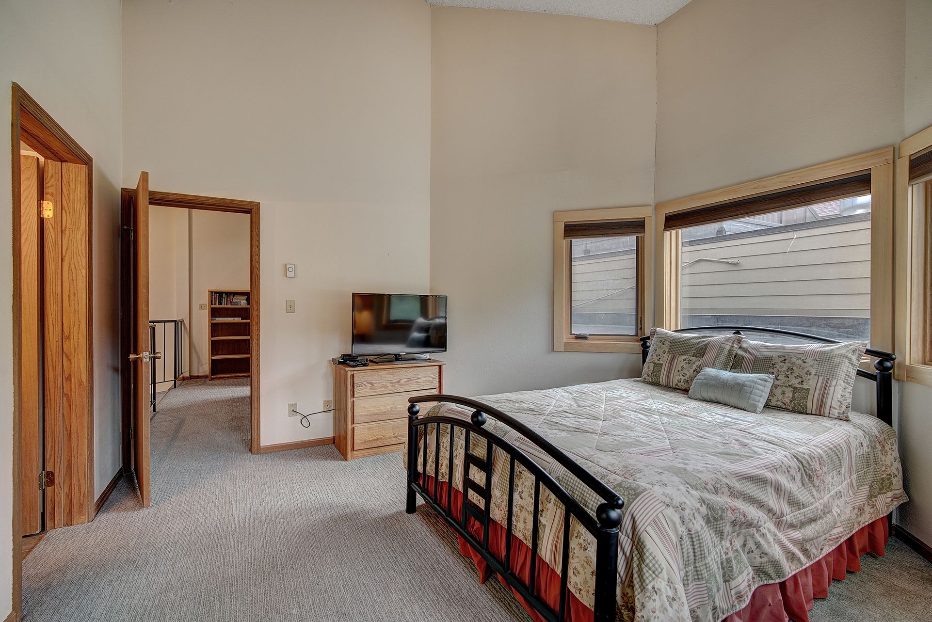 The fully equipped kitchen is ready for whipping up dinner and snacks, with seating for six at the table and 4 more at the bar. There’s a queen master suite on this level, as well as another bedroom with two twin beds. Just up the spiral staircase is the loft and another large queen master suite with a full private bath. The loft area has two twin beds for extra sleeping flexibility.
