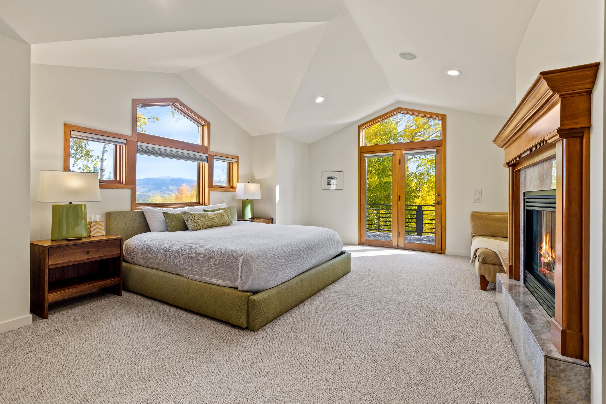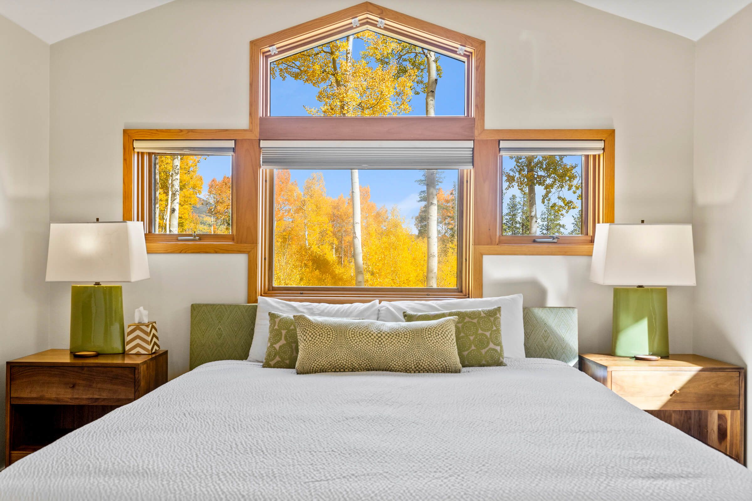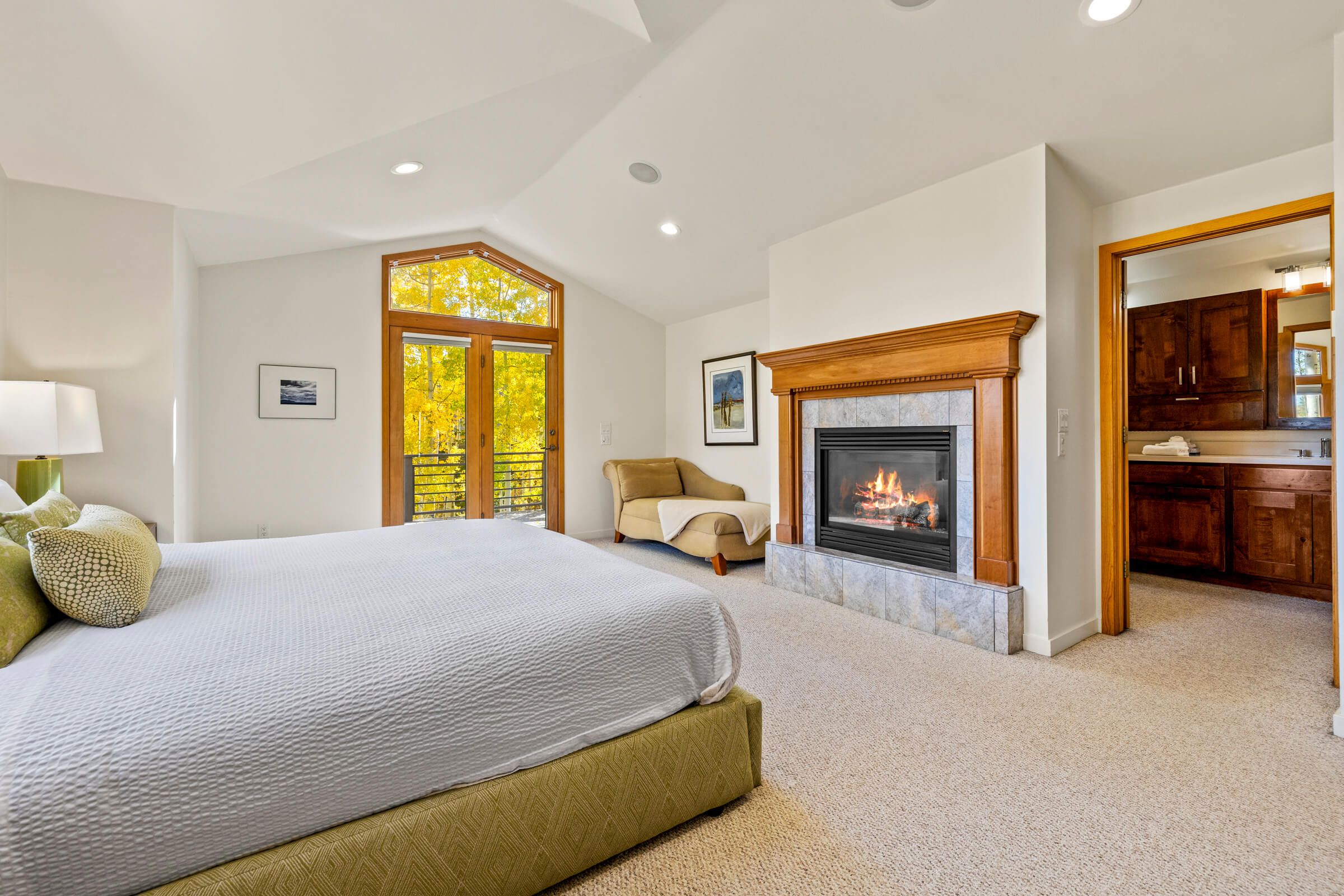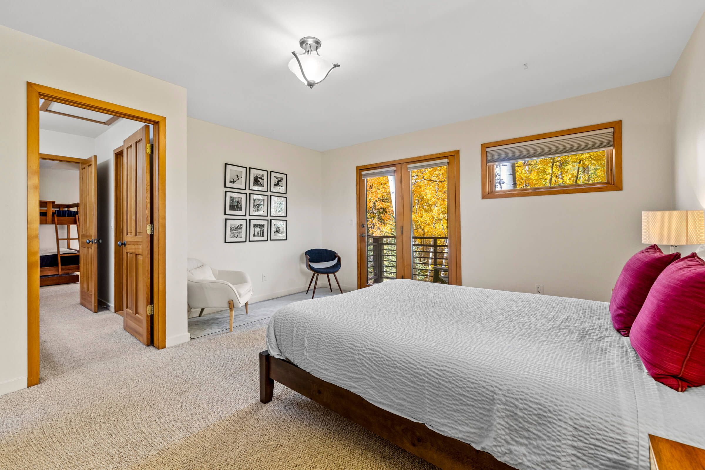 Rest comes easy in four well-appointed bedrooms. The upstairs king master suite features vaulted ceilings, a private patio with seating, mountain views, a gas fireplace, and a spa-like ensuite bathroom with soaking tub and walk-in shower. The upstairs also offers a queen bedroom and bunk room (each with private patios) that share a bathroom, plus another queen bedroom with ensuite bath and patio access. A shared east-facing deck frames mountain views beautifully through the aspens. On the main level, an additional queen master suite includes its own ensuite bath with walk-in shower.