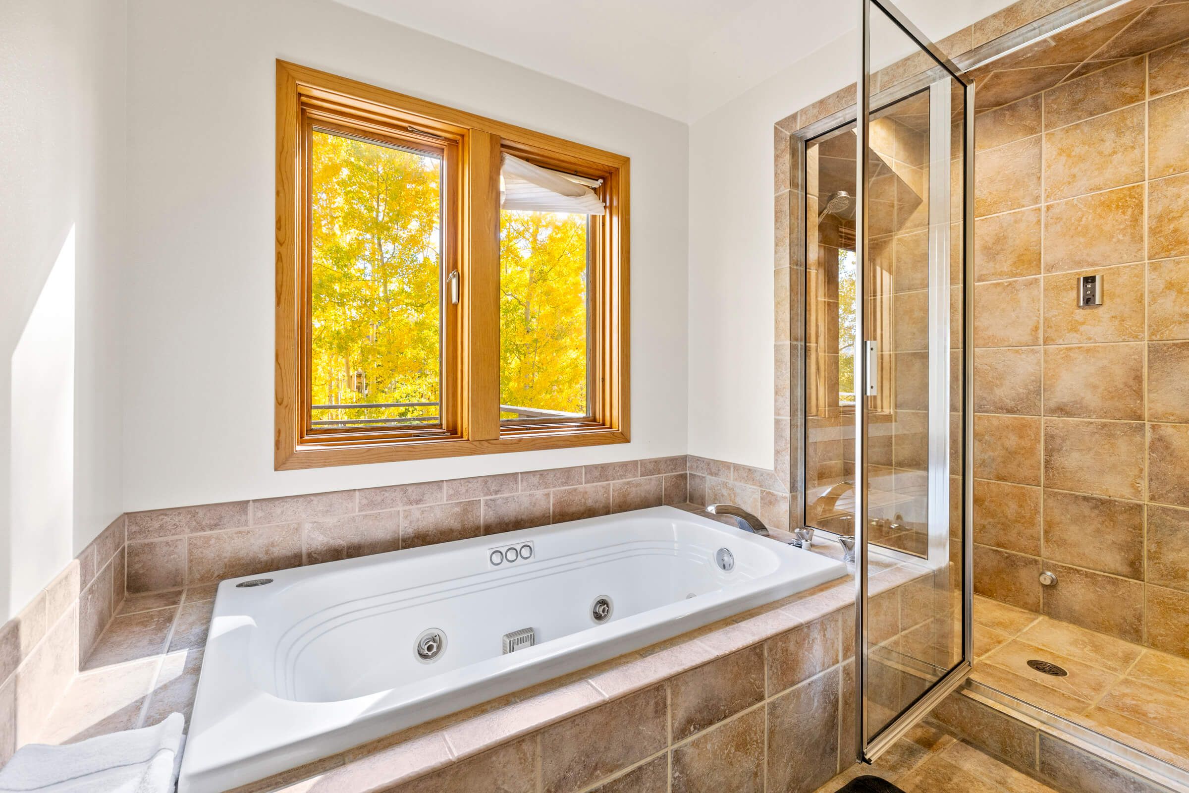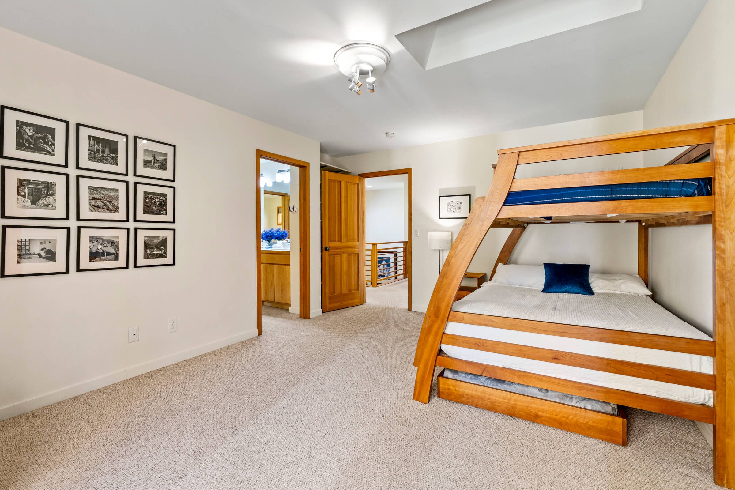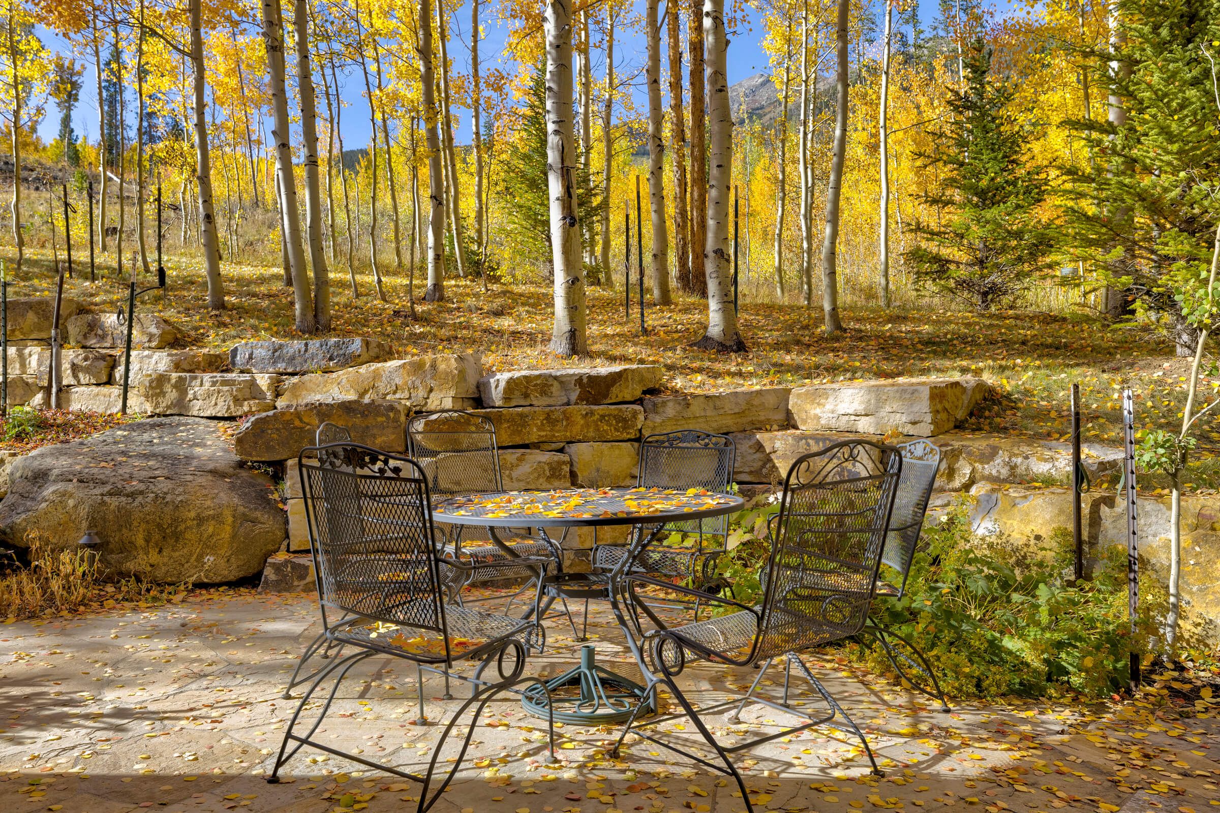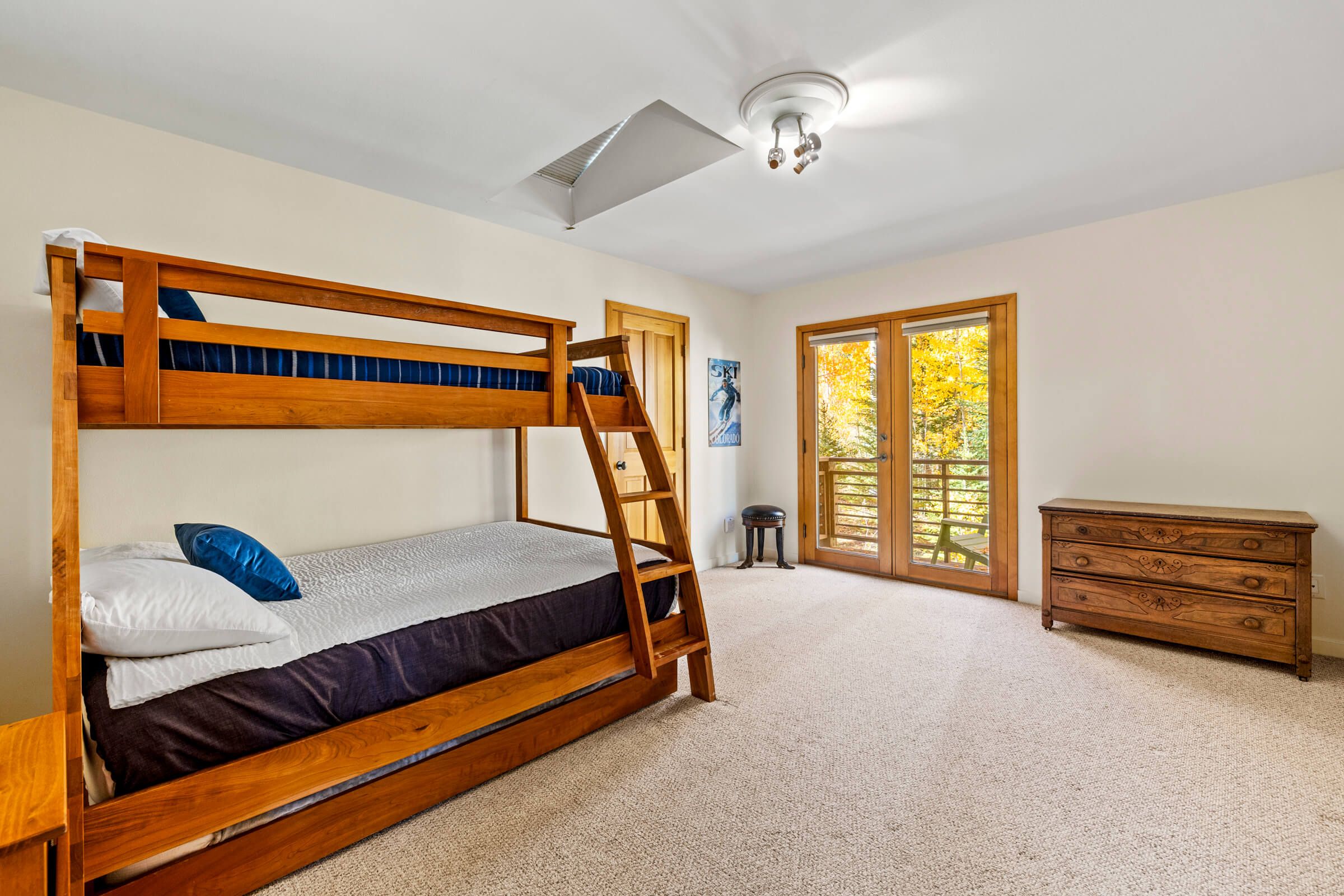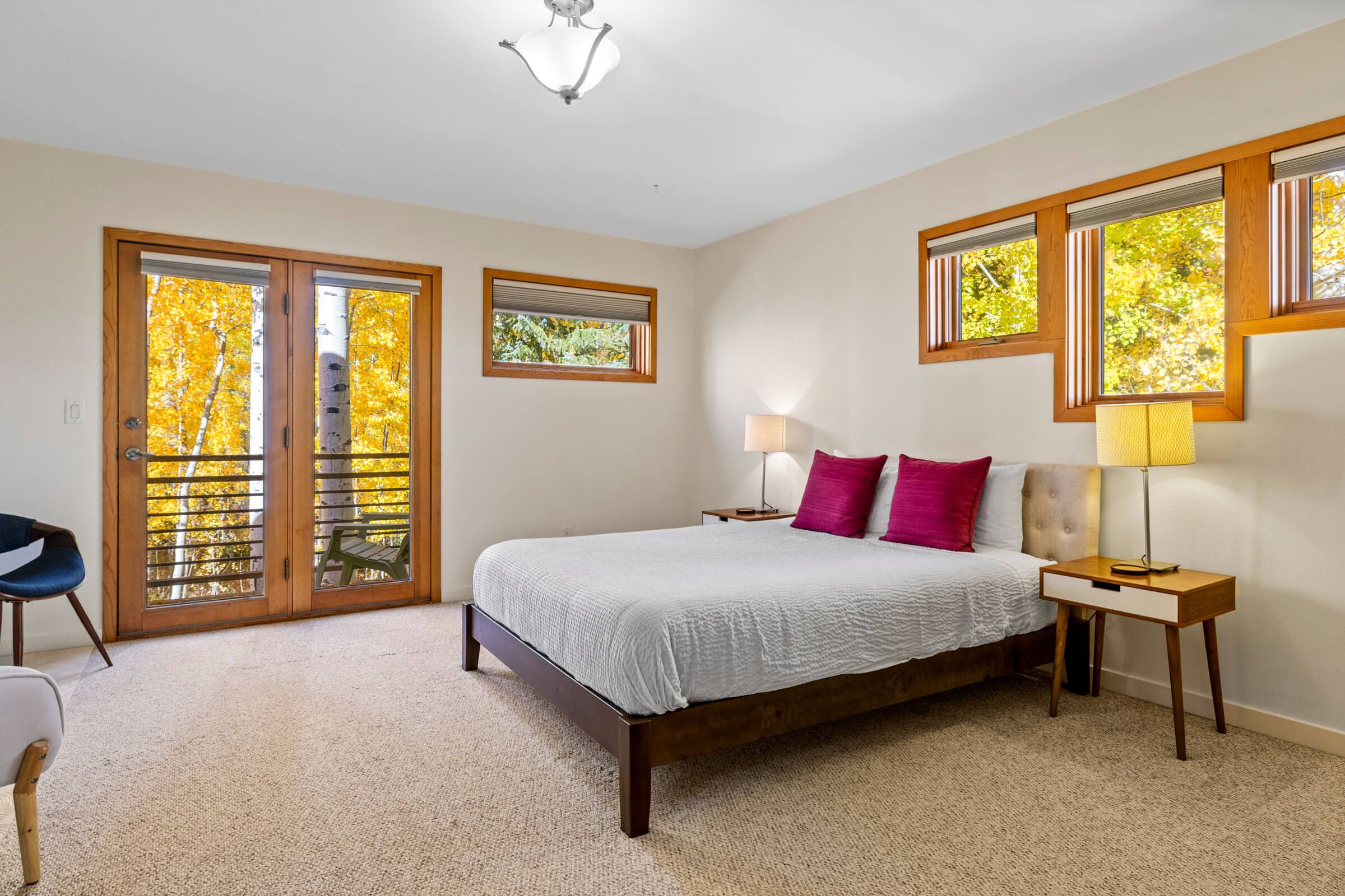 Rest comes easy in four well-appointed bedrooms. The upstairs king master suite features vaulted ceilings, a private patio with seating, mountain views, a gas fireplace, and a spa-like ensuite bathroom with soaking tub and walk-in shower. The upstairs also offers a queen bedroom and bunk room (each with private patios) that share a bathroom, plus another queen bedroom with ensuite bath and patio access. A shared east-facing deck frames mountain views beautifully through the aspens. On the main level, an additional queen master suite includes its own ensuite bath with walk-in shower.