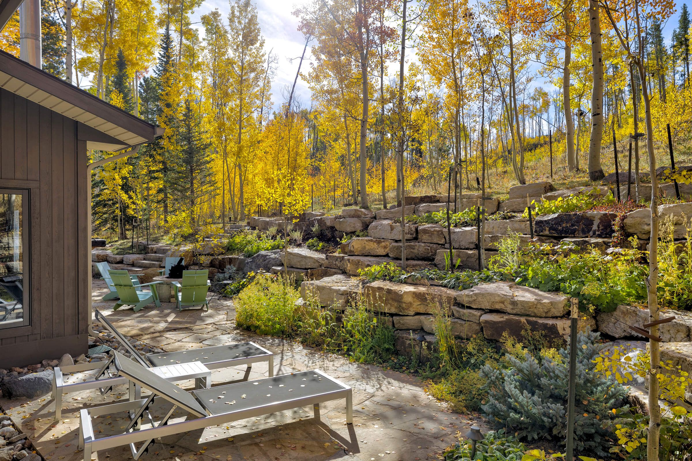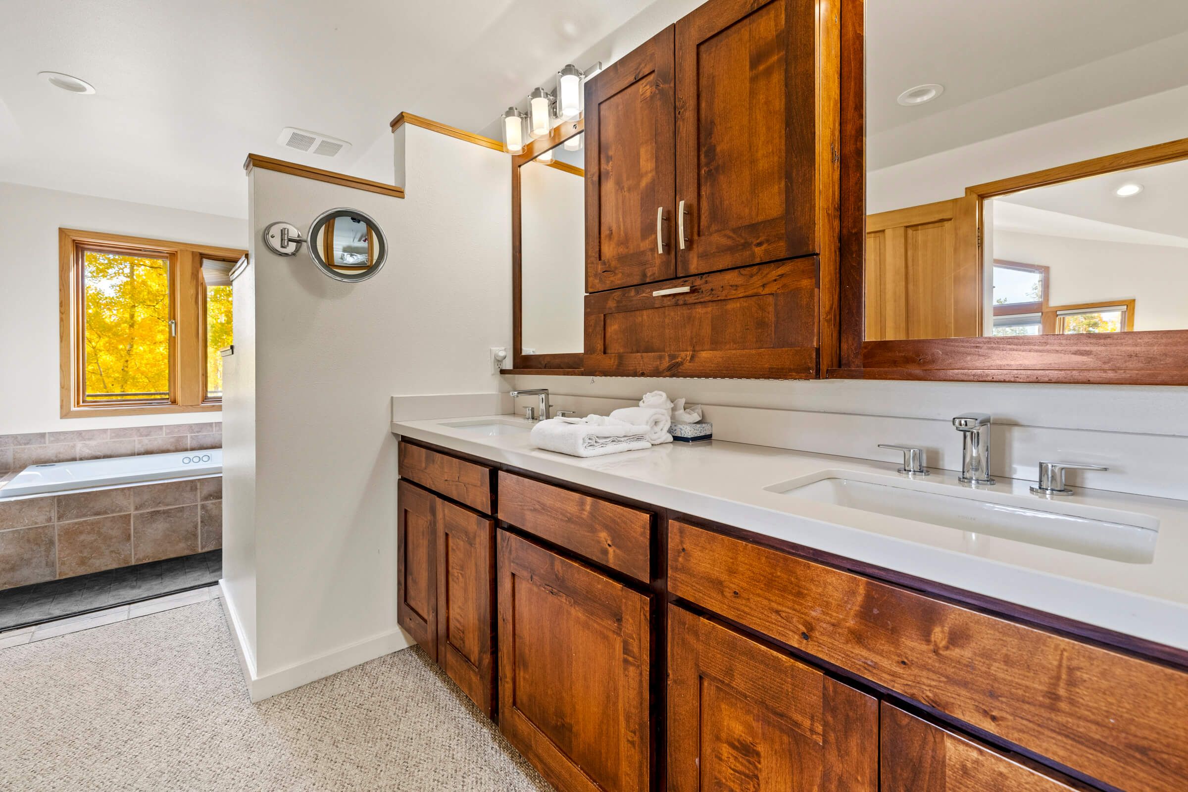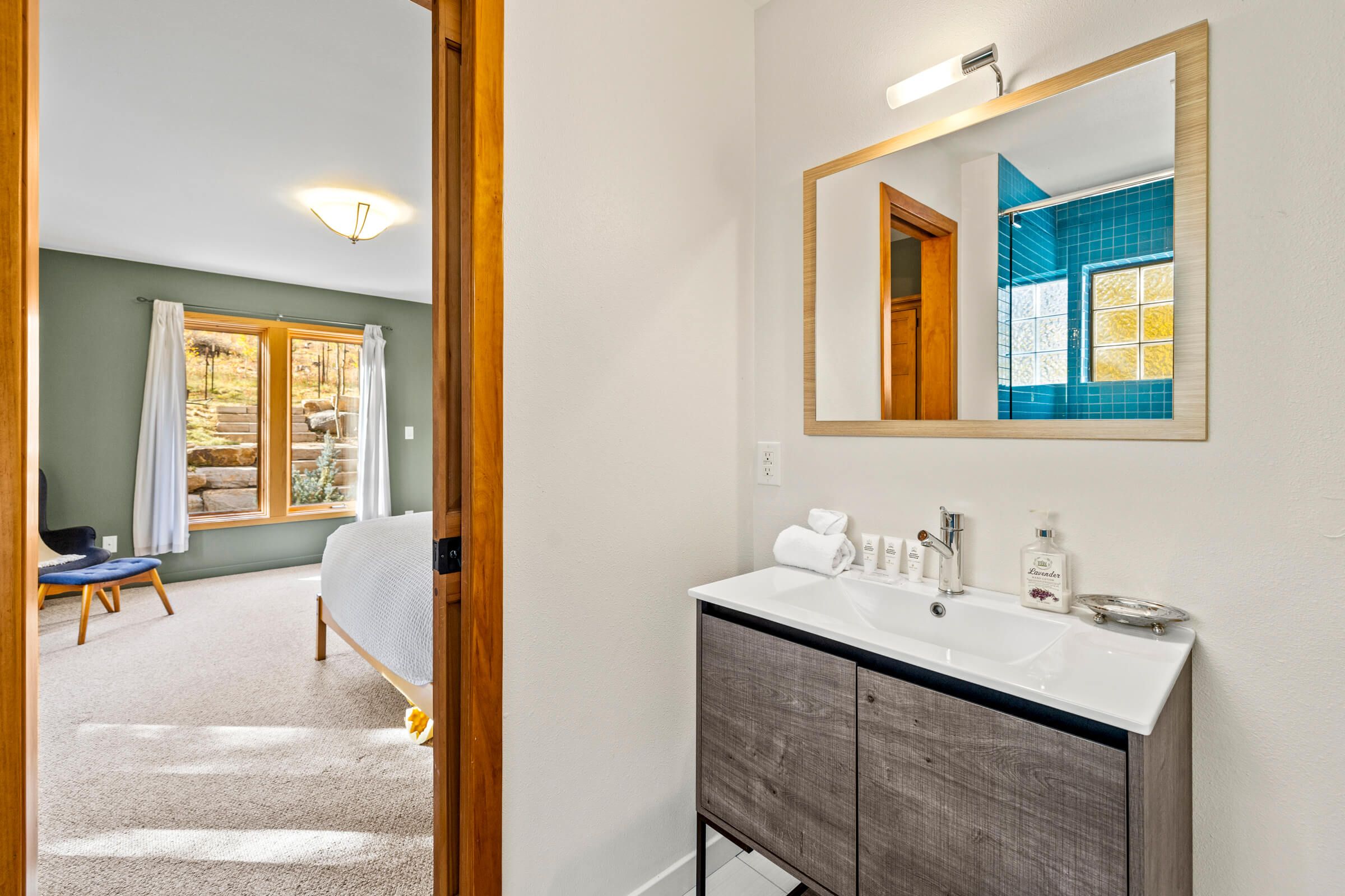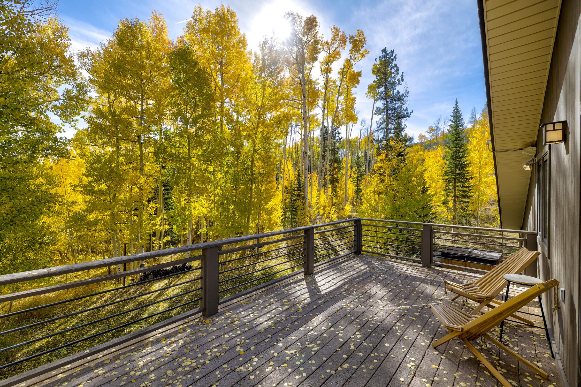 Rest comes easy in four well-appointed bedrooms. The upstairs king master suite features vaulted ceilings, a private patio with seating, mountain views, a gas fireplace, and a spa-like ensuite bathroom with soaking tub and walk-in shower. The upstairs also offers a queen bedroom and bunk room (each with private patios) that share a bathroom, plus another queen bedroom with ensuite bath and patio access. A shared east-facing deck frames mountain views beautifully through the aspens. On the main level, an additional queen master suite includes its own ensuite bath with walk-in shower.
