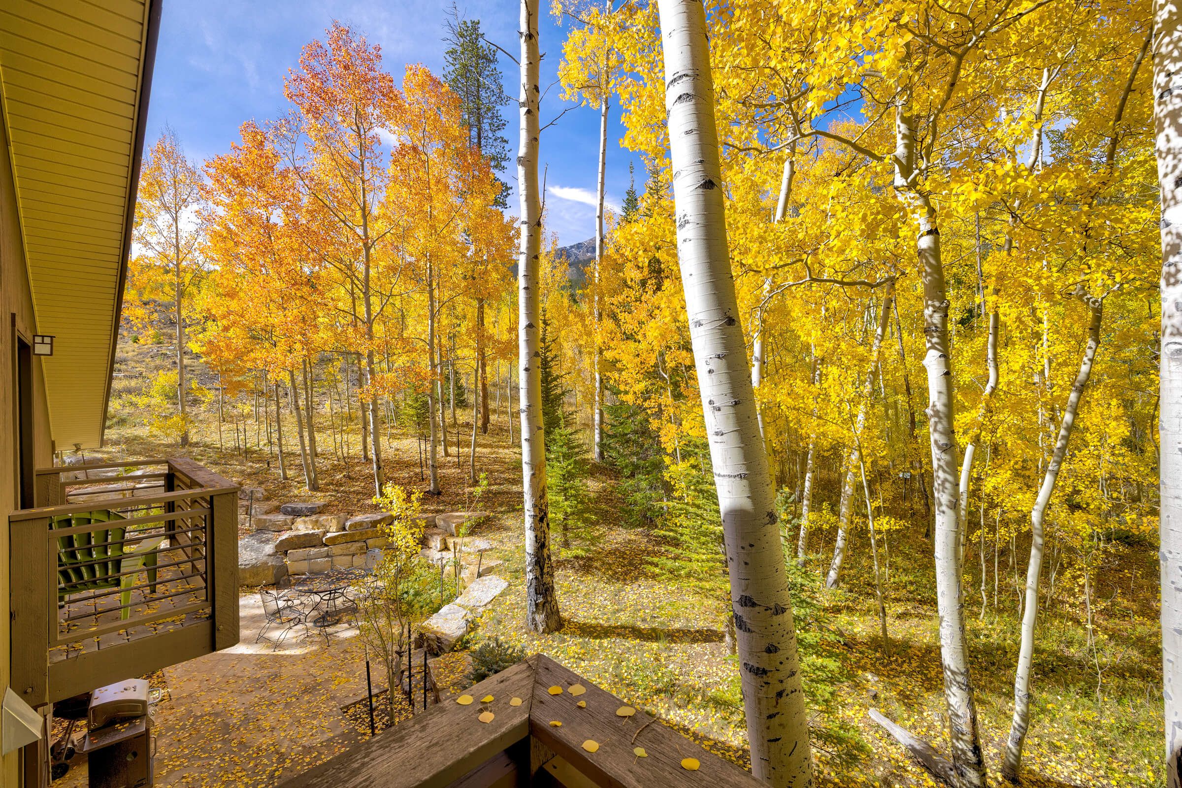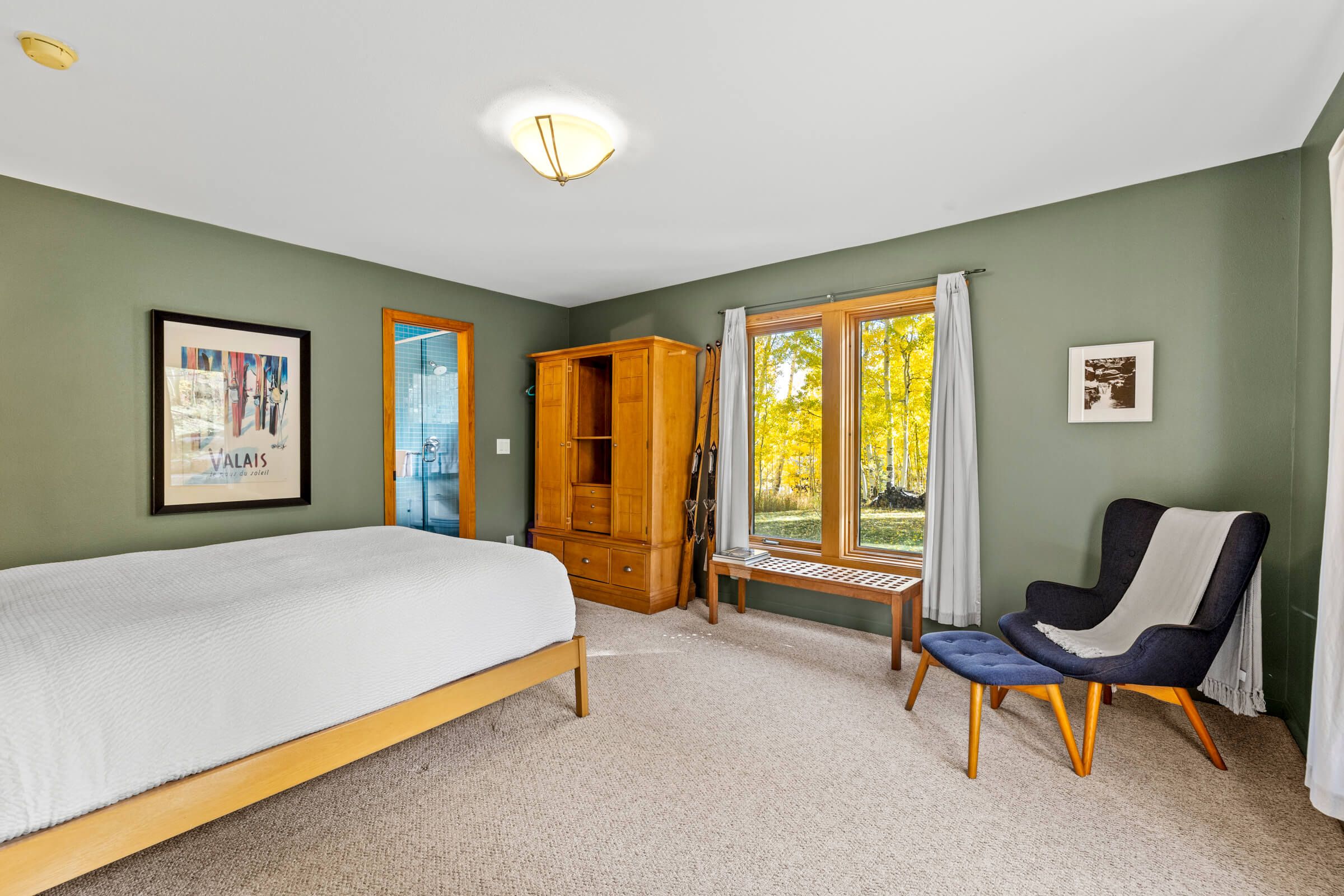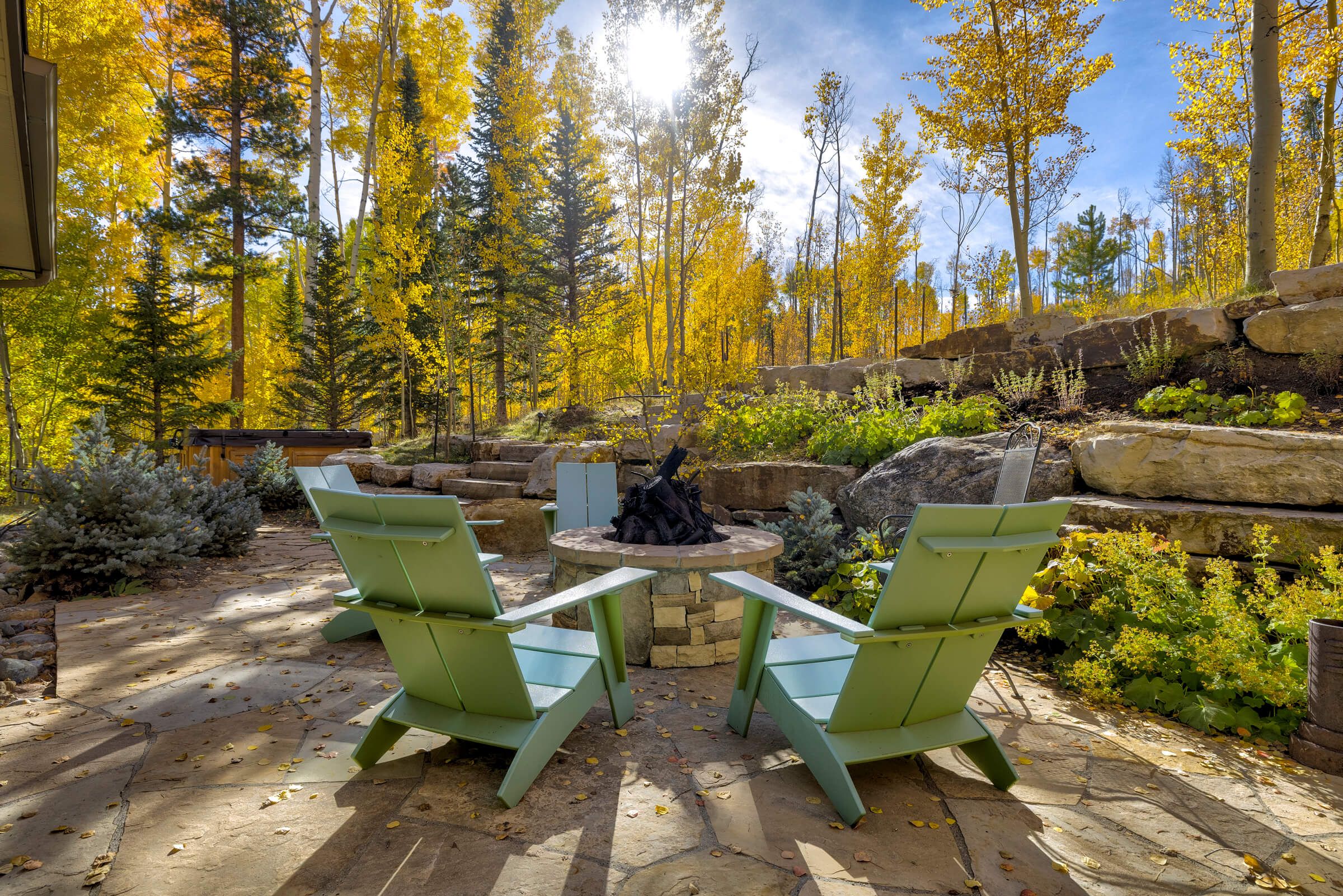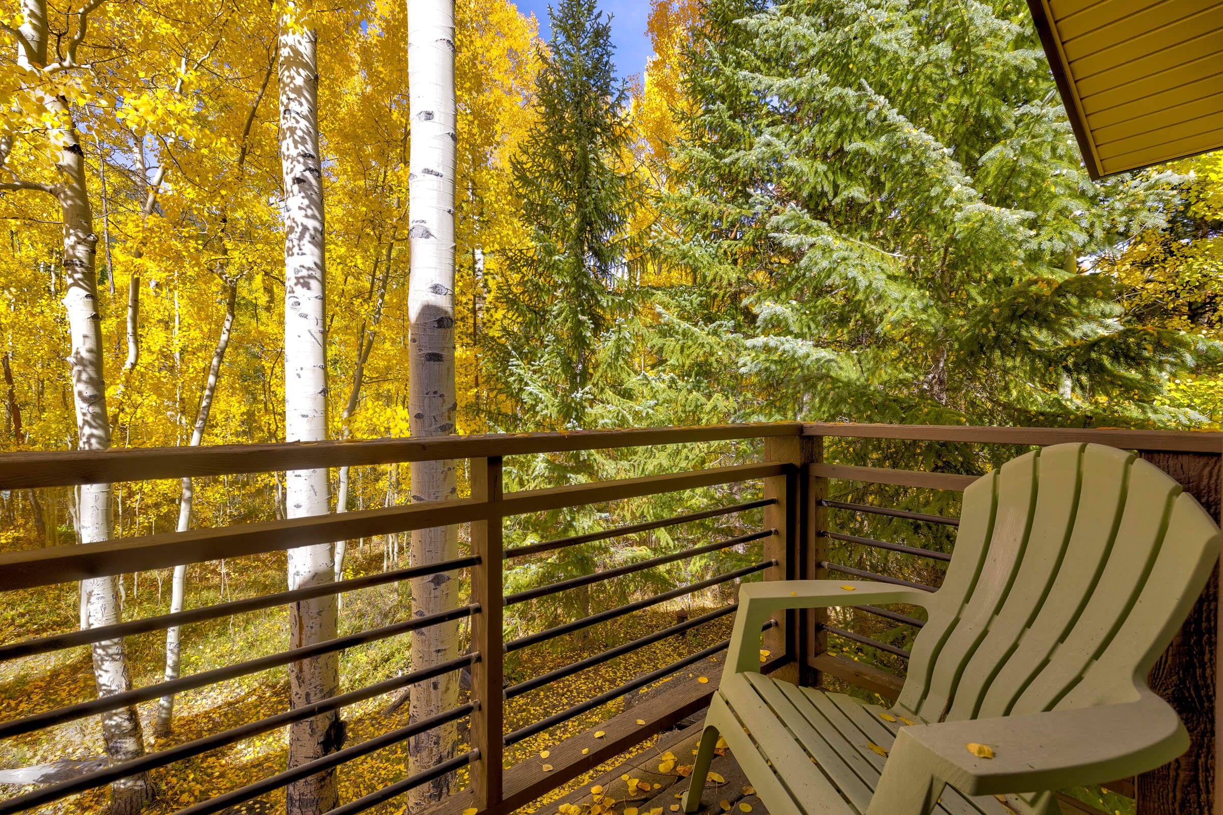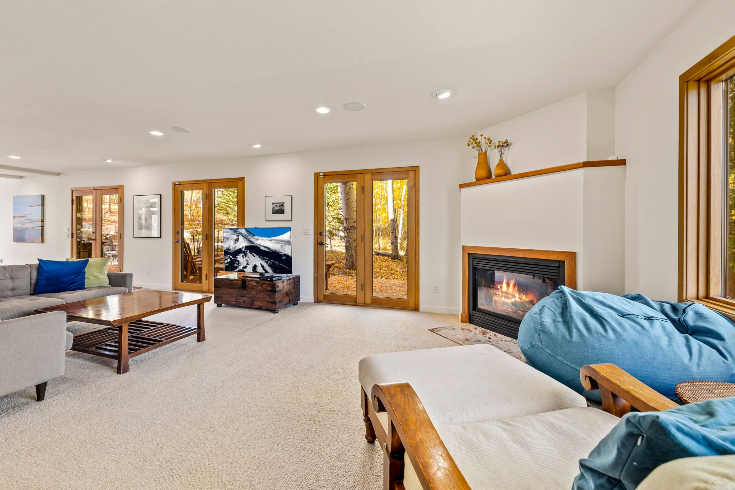 Rest comes easy in four well-appointed bedrooms. The upstairs king master suite features vaulted ceilings, a private patio with seating, mountain views, a gas fireplace, and a spa-like ensuite bathroom with soaking tub and walk-in shower. The upstairs also offers a queen bedroom and bunk room (each with private patios) that share a bathroom, plus another queen bedroom with ensuite bath and patio access. A shared east-facing deck frames mountain views beautifully through the aspens. On the main level, an additional queen master suite includes its own ensuite bath with walk-in shower.