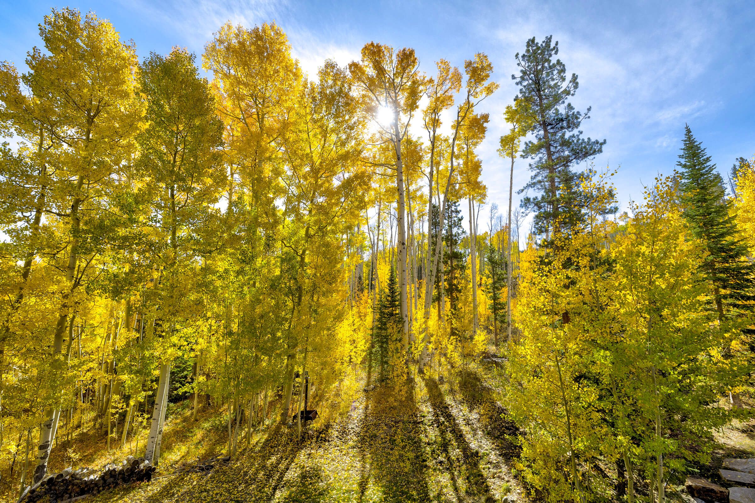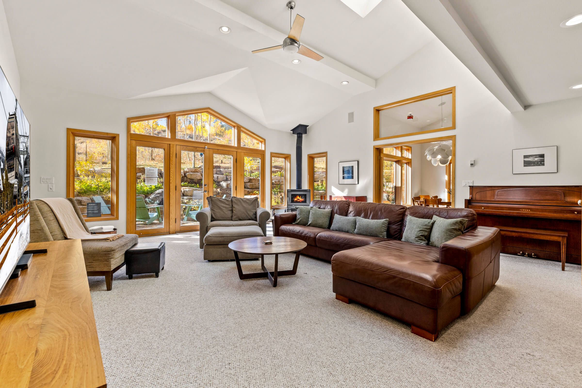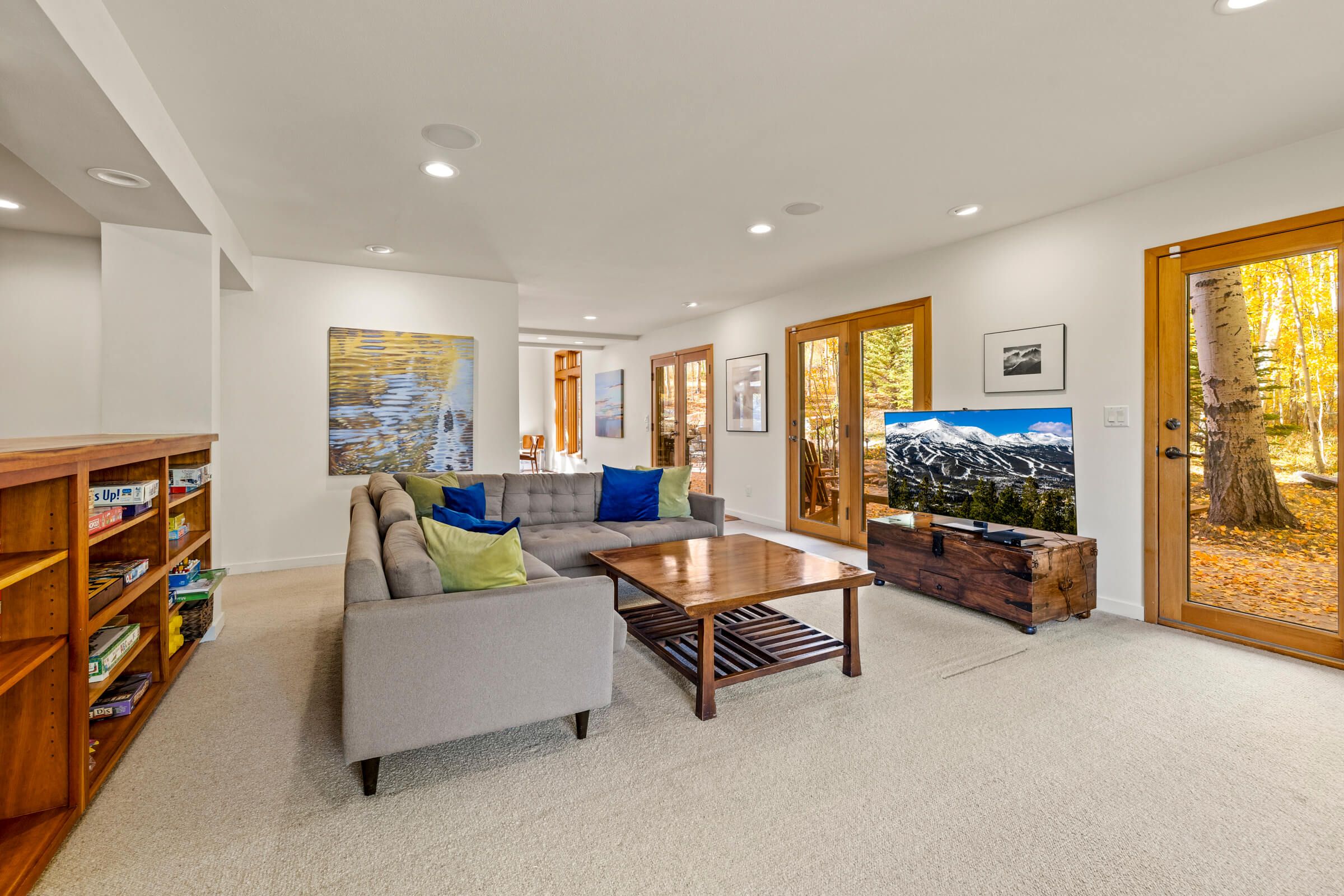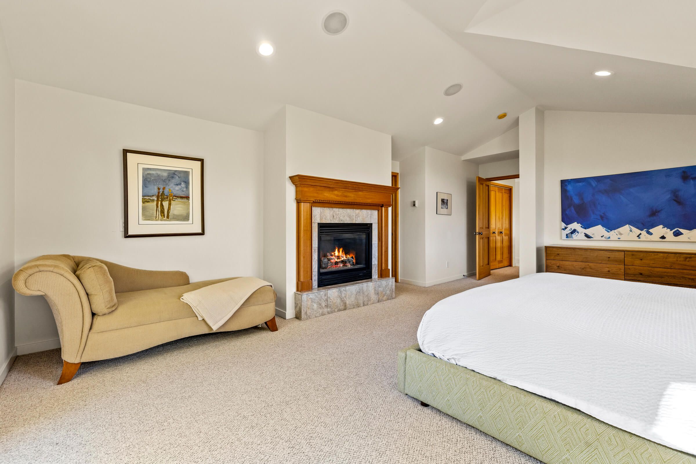 Rest comes easy in four well-appointed bedrooms. The upstairs king master suite features vaulted ceilings, a private patio with seating, mountain views, a gas fireplace, and a spa-like ensuite bathroom with soaking tub and walk-in shower. The upstairs also offers a queen bedroom and bunk room (each with private patios) that share a bathroom, plus another queen bedroom with ensuite bath and patio access. A shared east-facing deck frames mountain views beautifully through the aspens. On the main level, an additional queen master suite includes its own ensuite bath with walk-in shower.