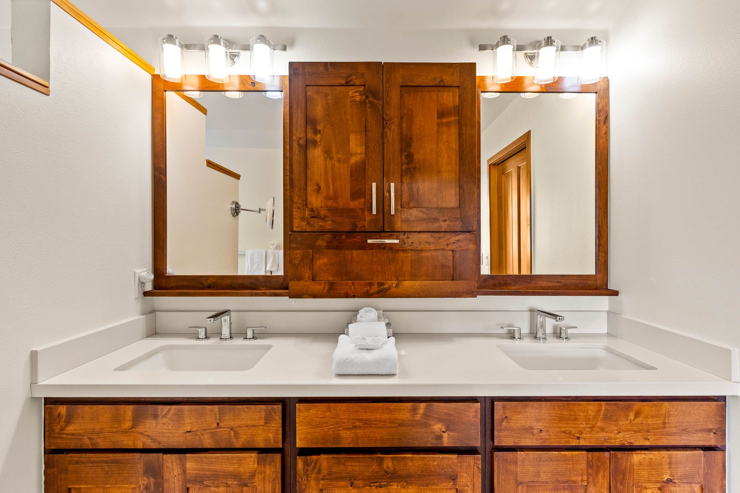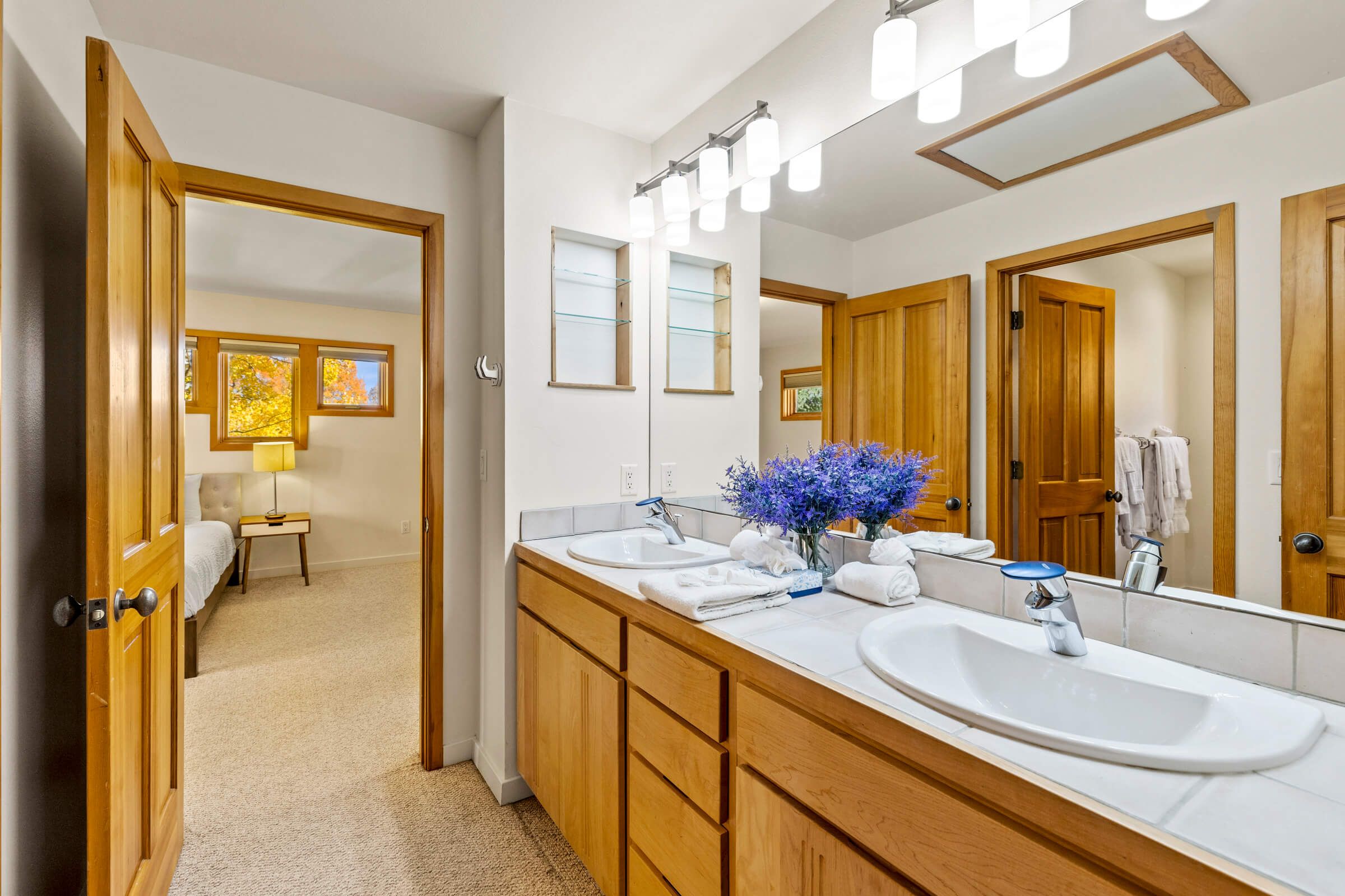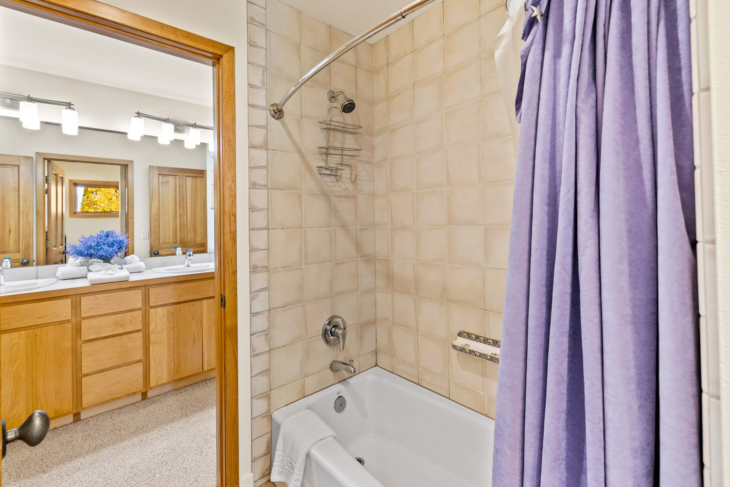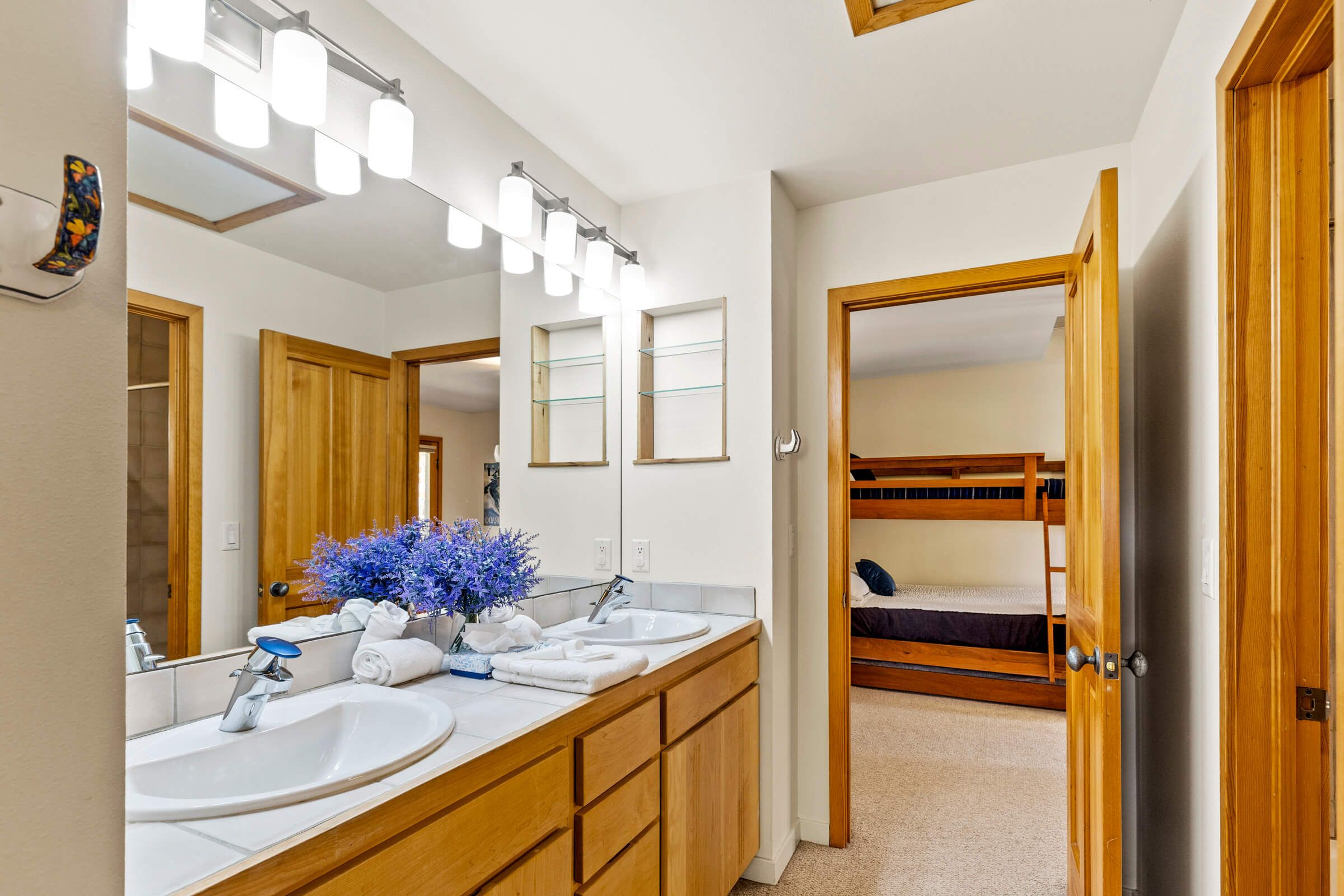 - Full Bathroom: shared bathroom w/ dual vanities and shower tub combo.