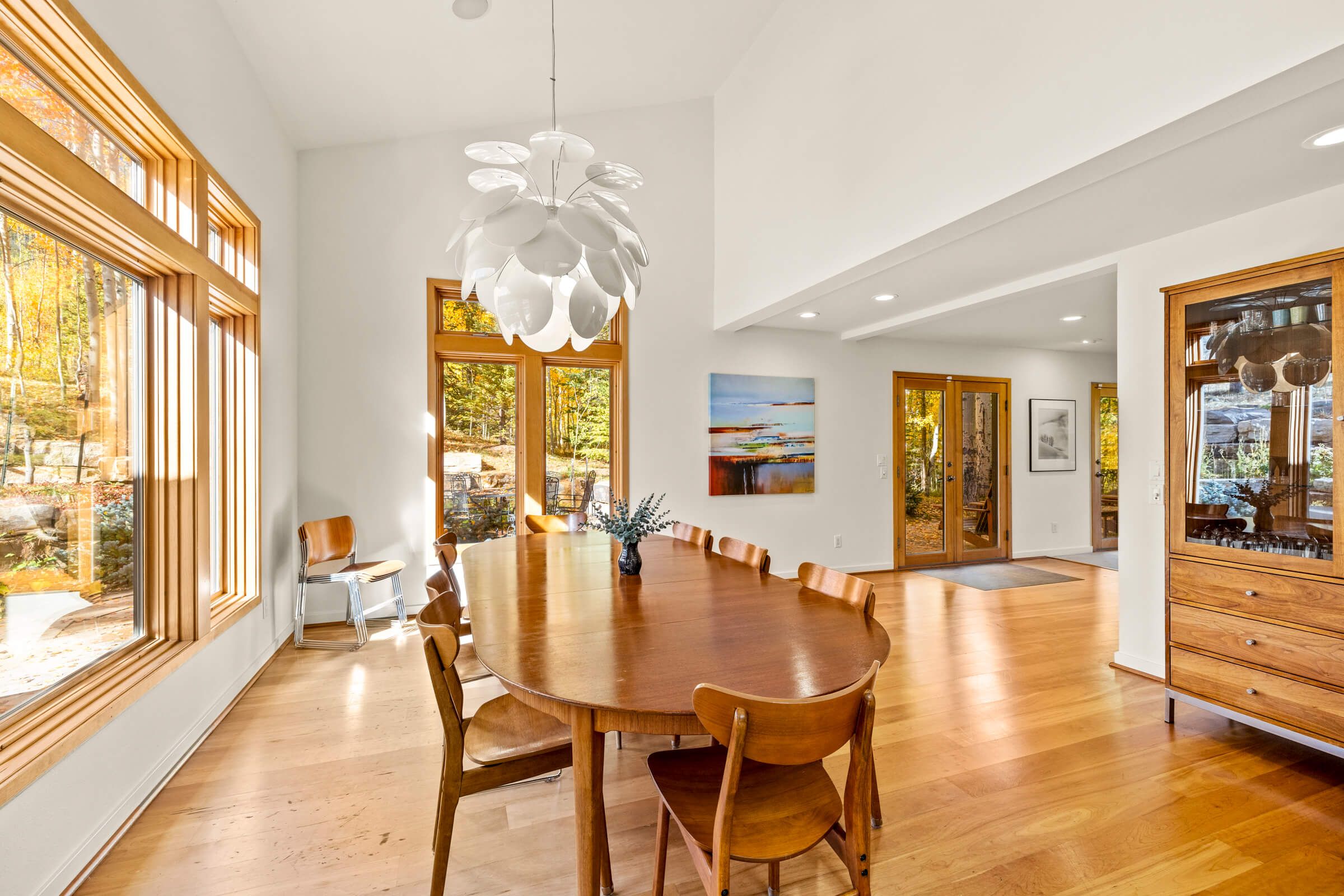 Step into the main living area, where soaring vaulted ceilings, floor-to-ceiling windows, and a beautiful wood-burning fireplace create a warm, inviting space. Gather on the comfortable seating for movie nights on the large Smart TV or simply soak in the natural light and wooded views. Just outside, the rear patio has been thoughtfully transformed into an outdoor oasis with a hot tub, gas fire pit, multiple lounging and dining areas, and a gas grill. Please note: during the winter months, only the walkway to the hot tub and fire pit is maintained, and the rest of the patio may be snow-covered.
