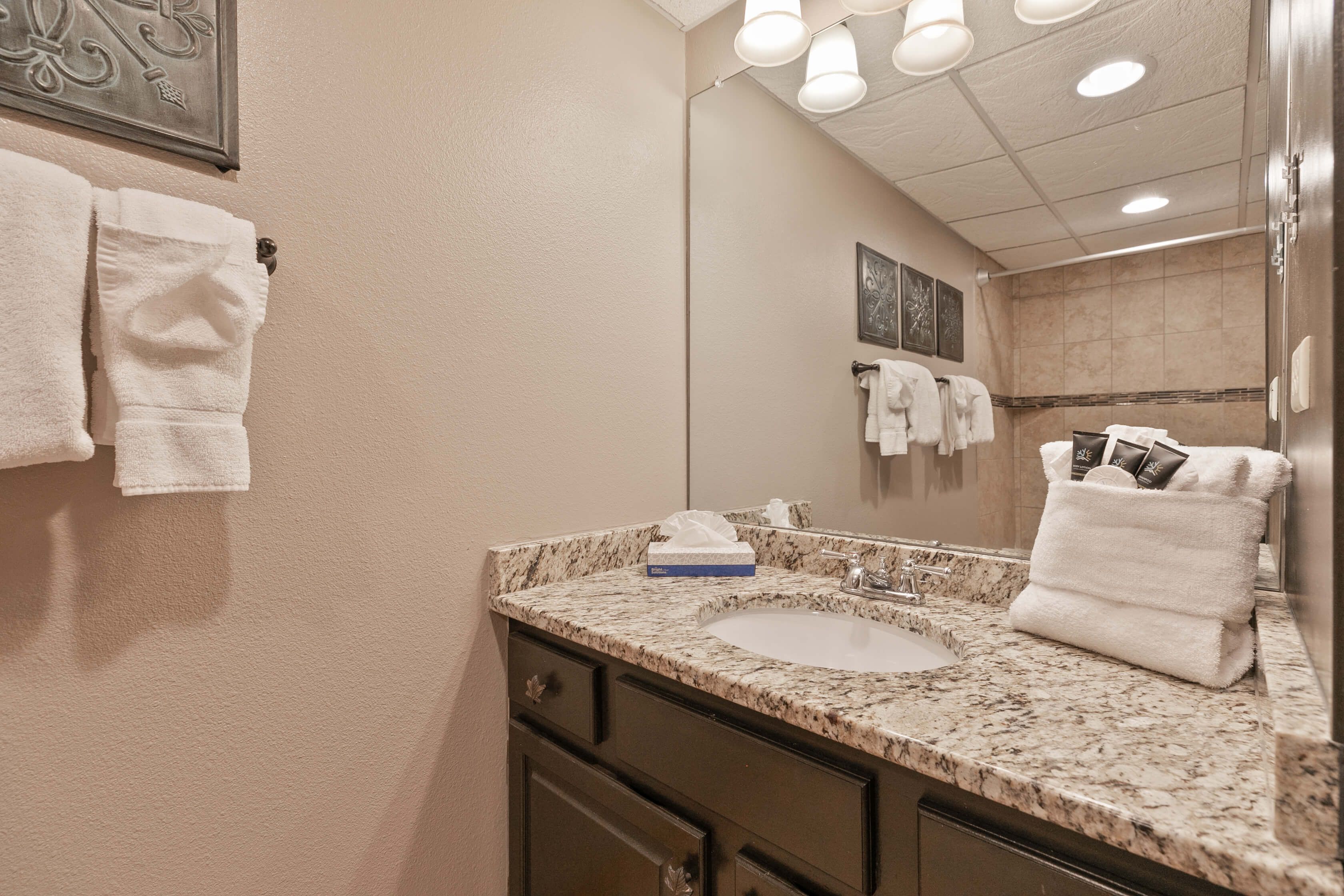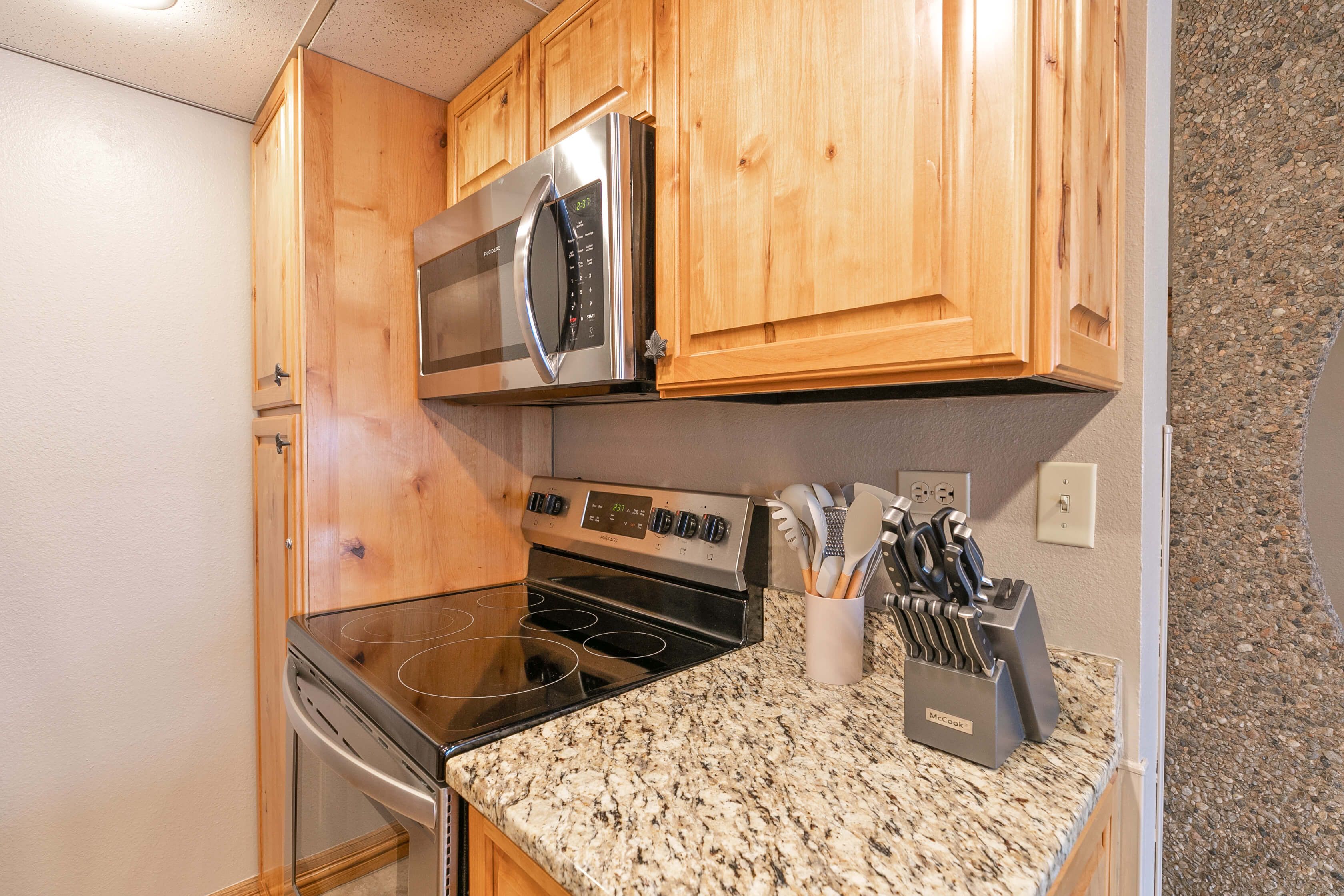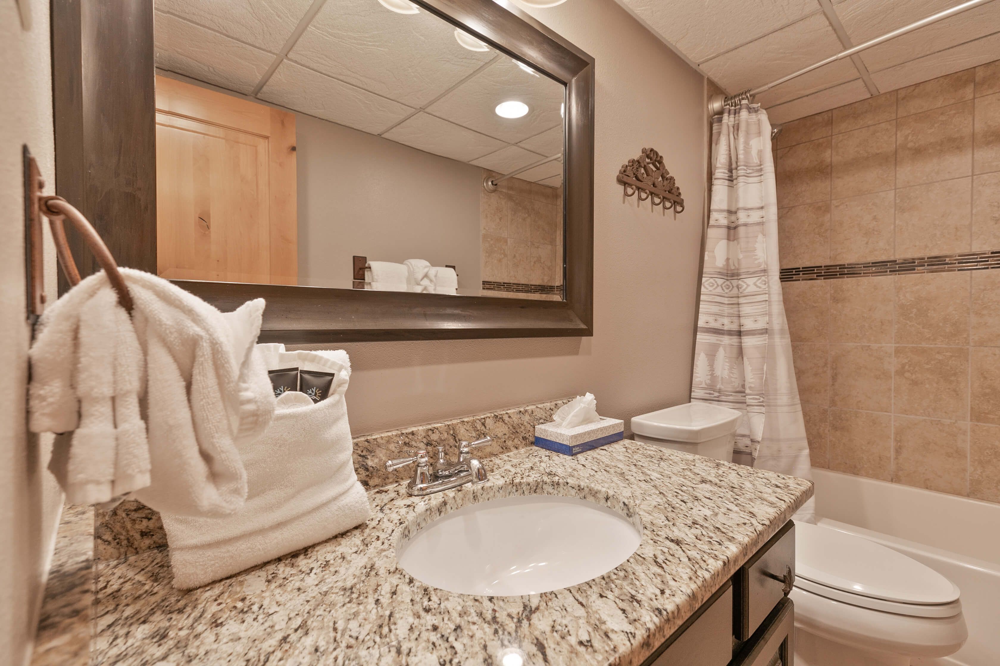 Inside, the living area features vaulted ceilings, a flat-screen TV and comfy seating; it’s perfect for catching the game or watching your favorite movie or show. Or step out onto the patio to enjoy the views of the slopes and lift! The kitchen features granite counters and all the gear you’ll need to keep the troops happy and fed. The dining table seats four, with room for two more at the counter.Â
