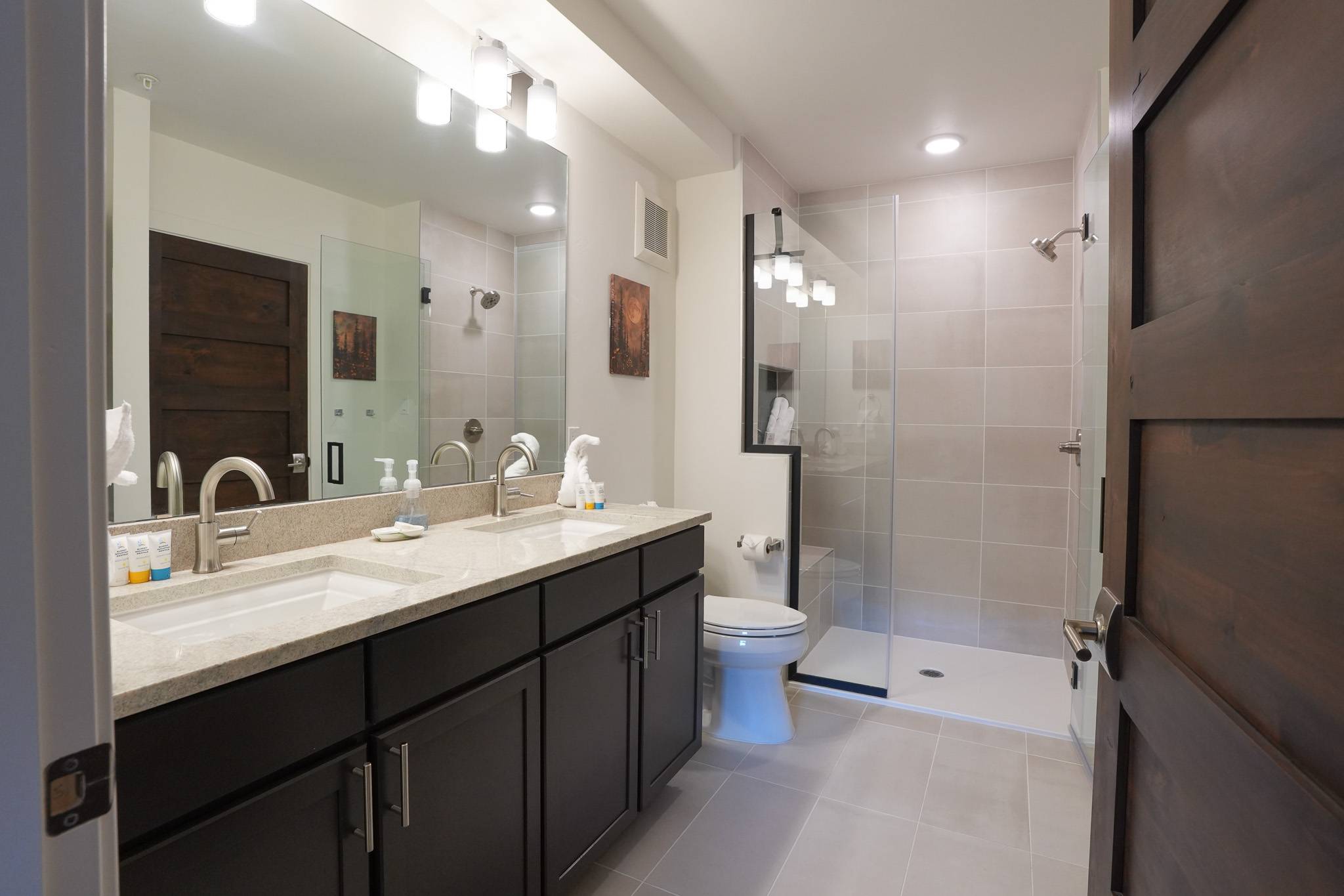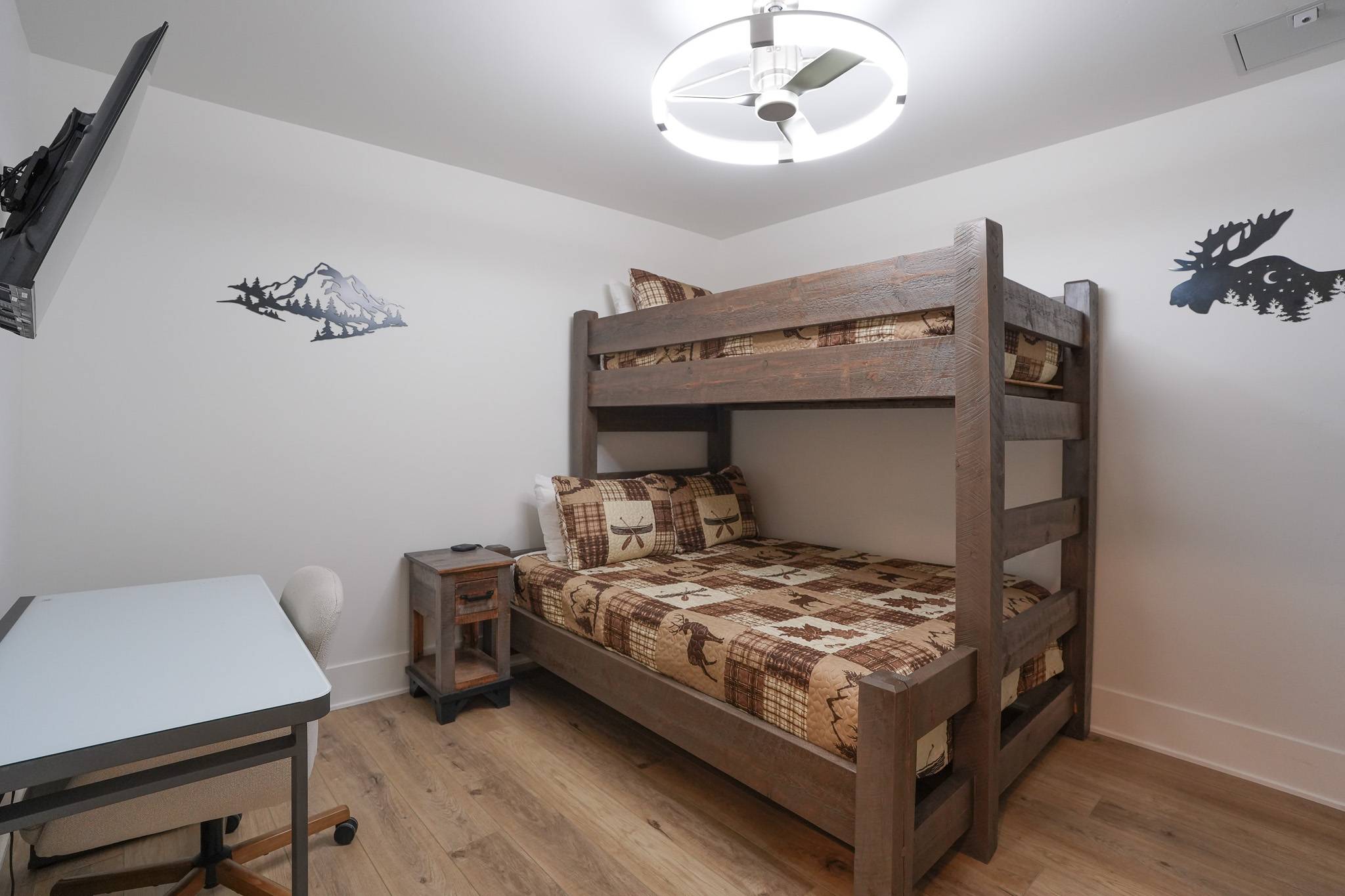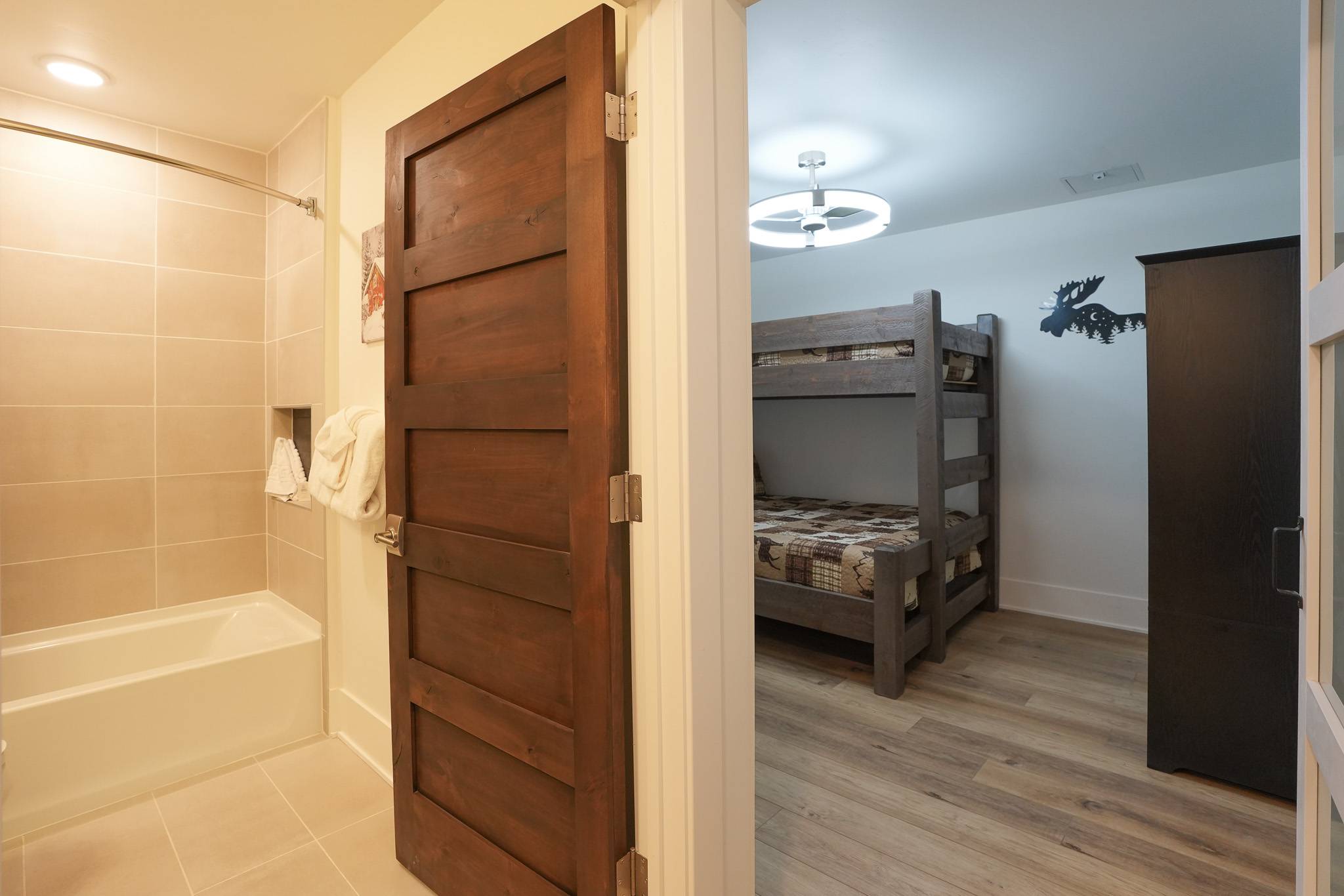 The primary suite offers a king bed, smart TV, and a spacious en-suite bathroom with dual vanities and a walk-in shower. The den functions as a true second sleeping area, featuring an XL twin-over-queen bunk bed, its own smart TV, and an additional desk. A door provides privacy, making it ideal for families or small groups. A second bathroom with a tub/shower combo is located just outside in the hallway.
