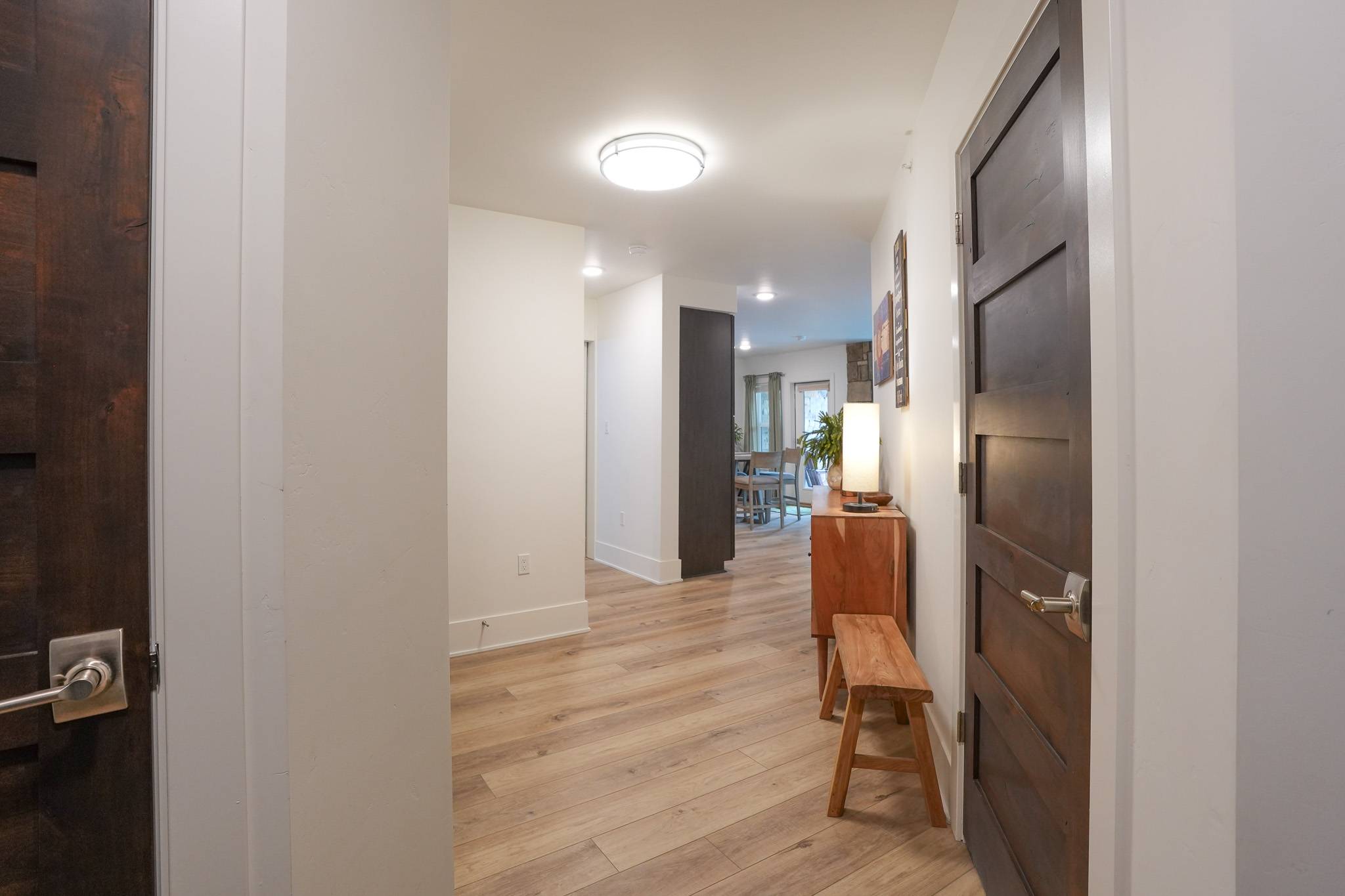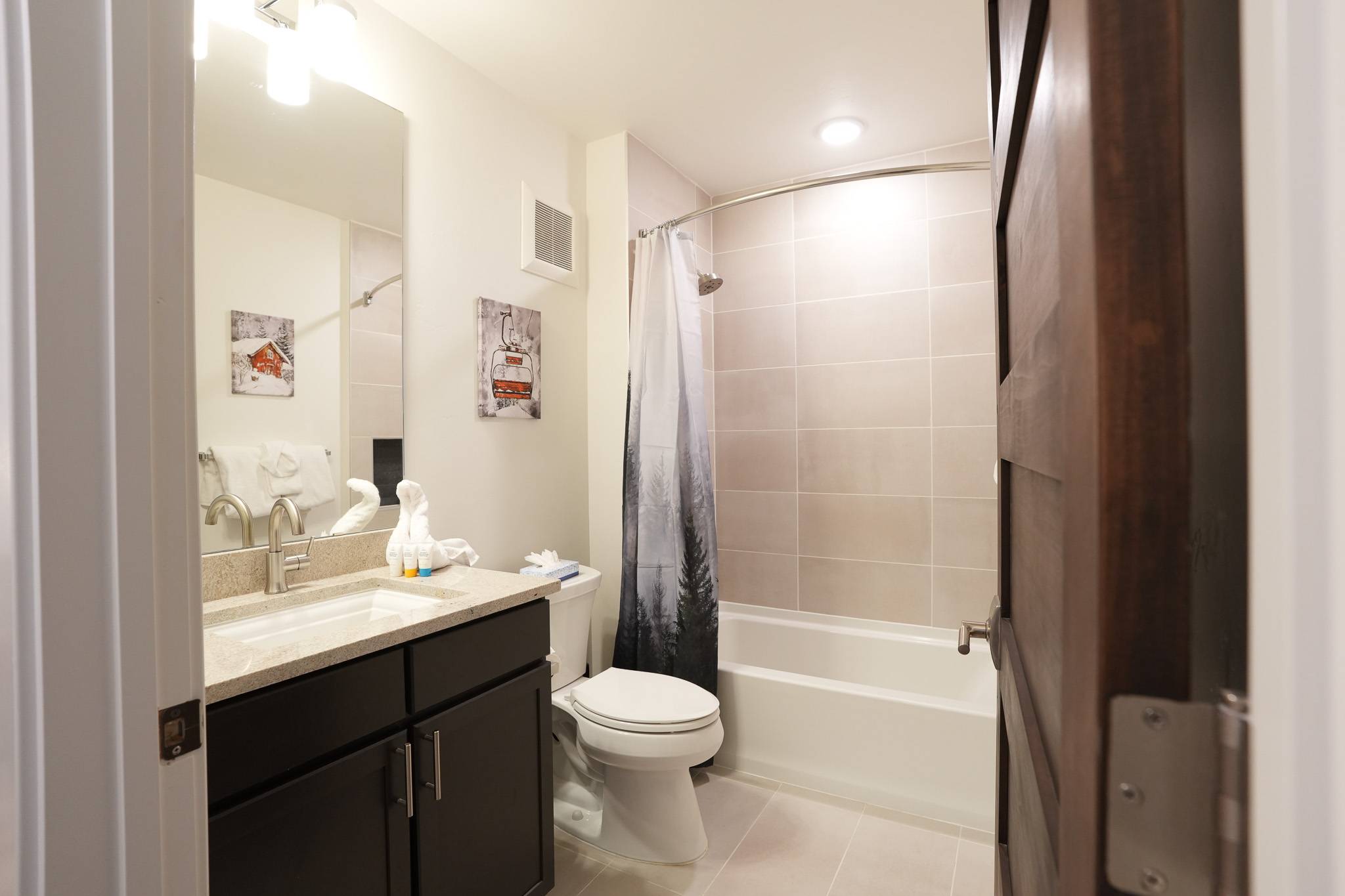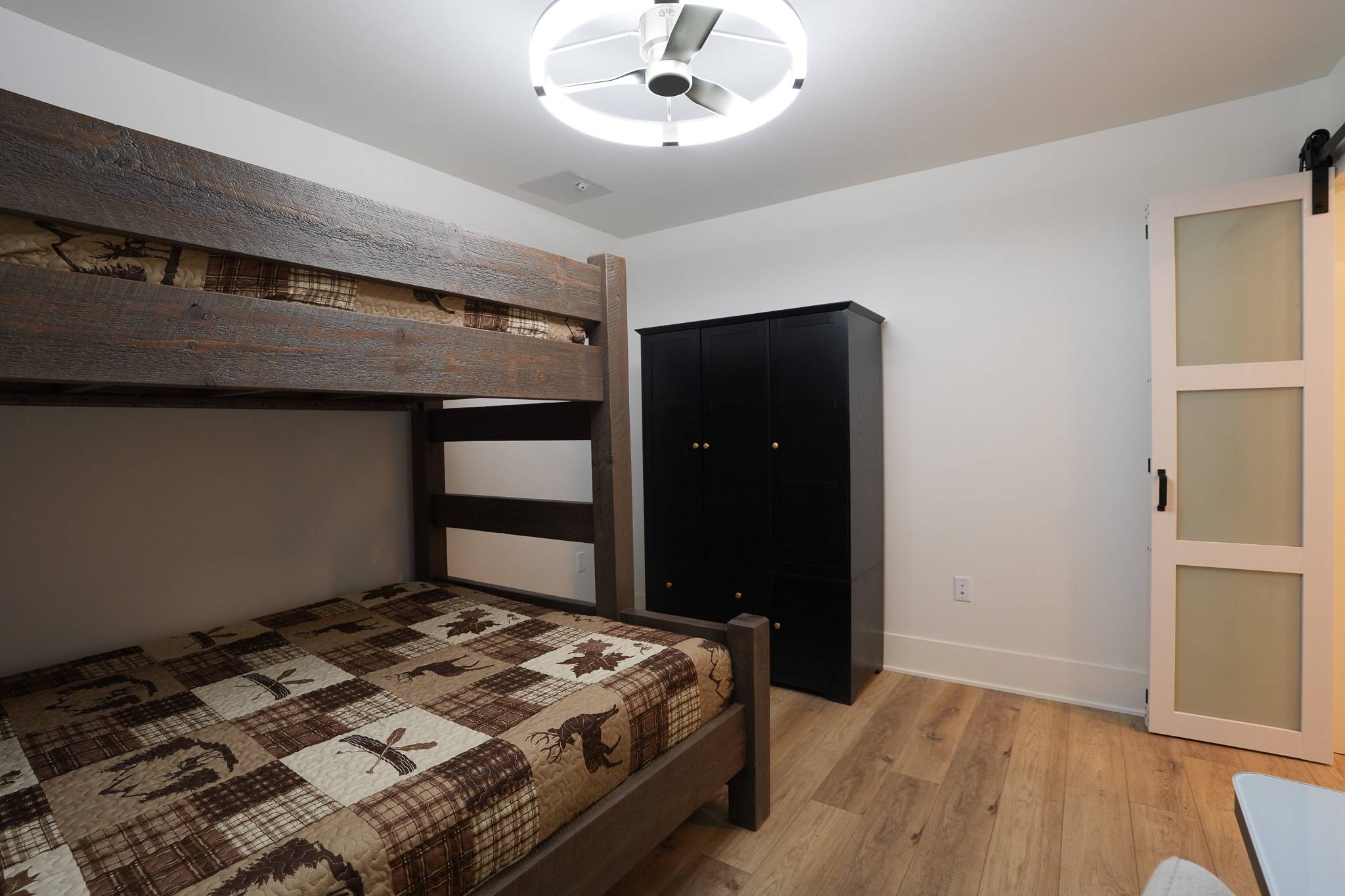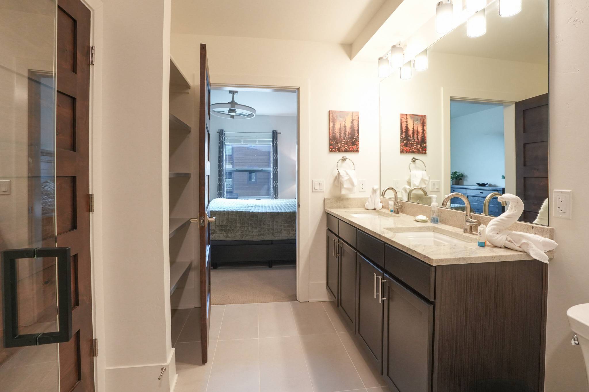 The primary suite offers a king bed, smart TV, and a spacious en-suite bathroom with dual vanities and a walk-in shower. The den functions as a true second sleeping area, featuring an XL twin-over-queen bunk bed, its own smart TV, and an additional desk. A door provides privacy, making it ideal for families or small groups. A second bathroom with a tub/shower combo is located just outside in the hallway.