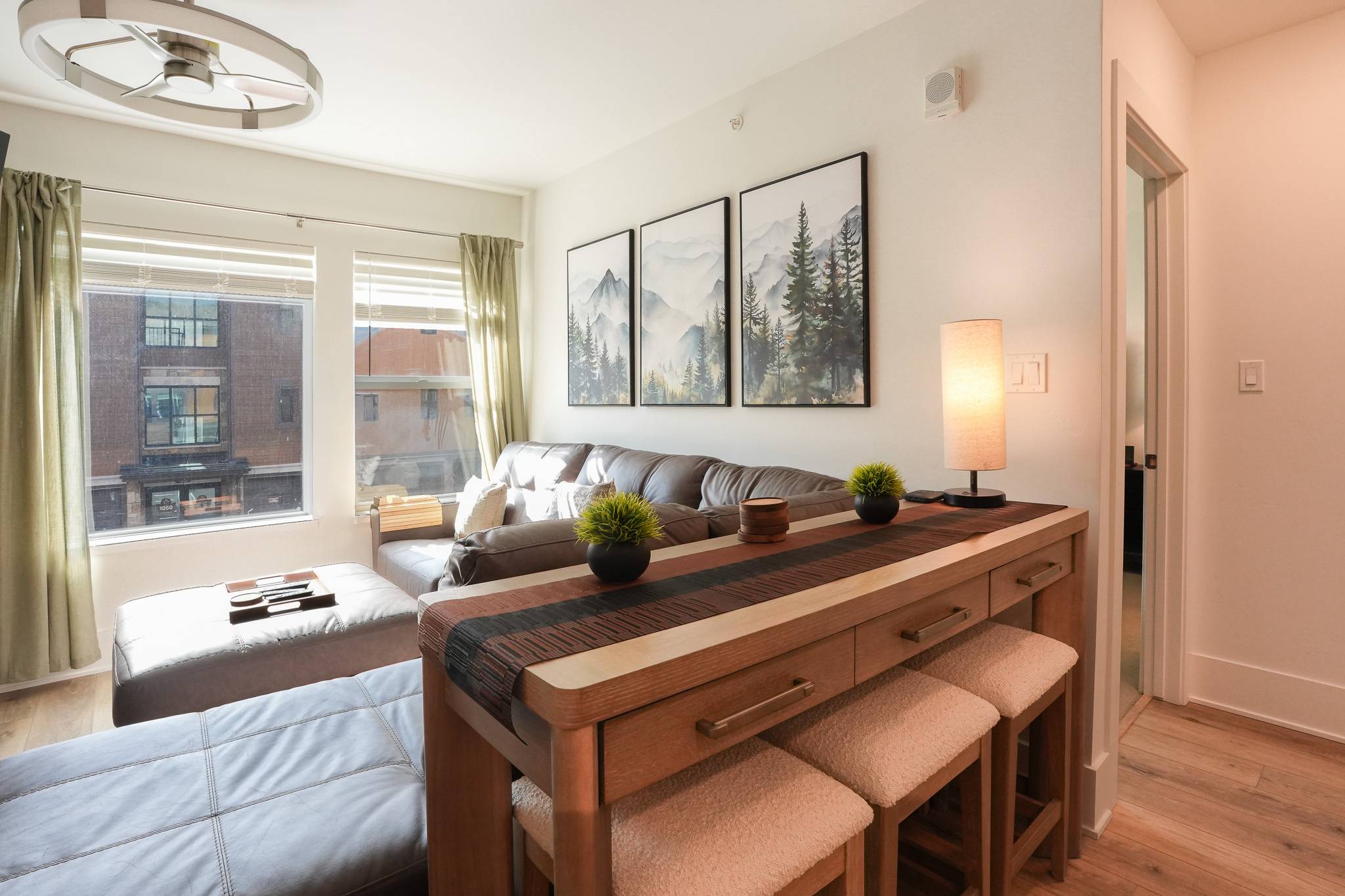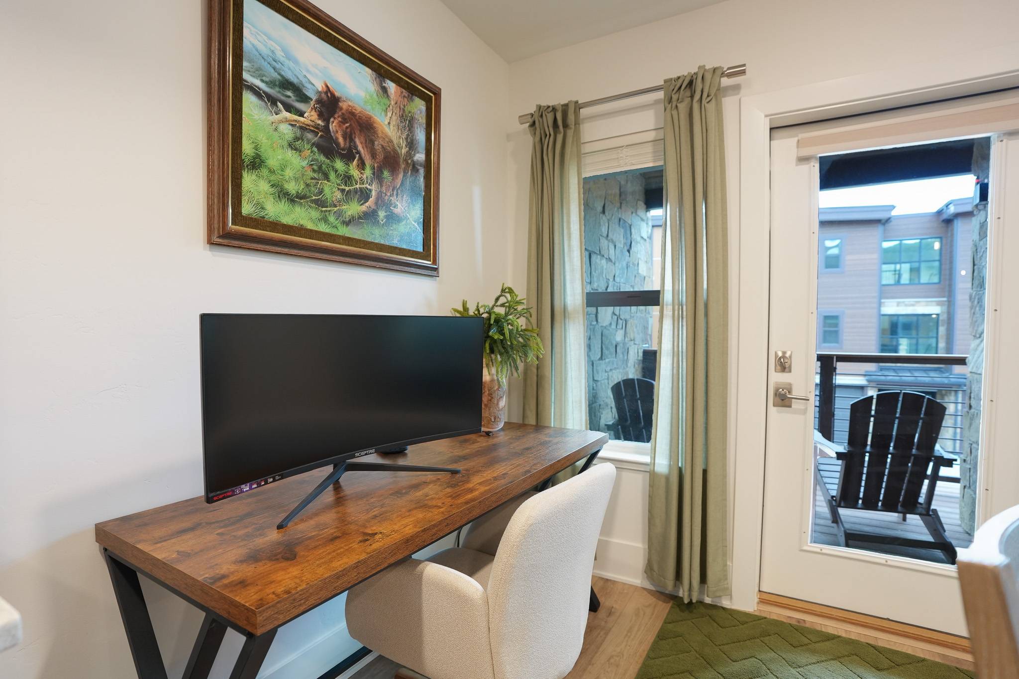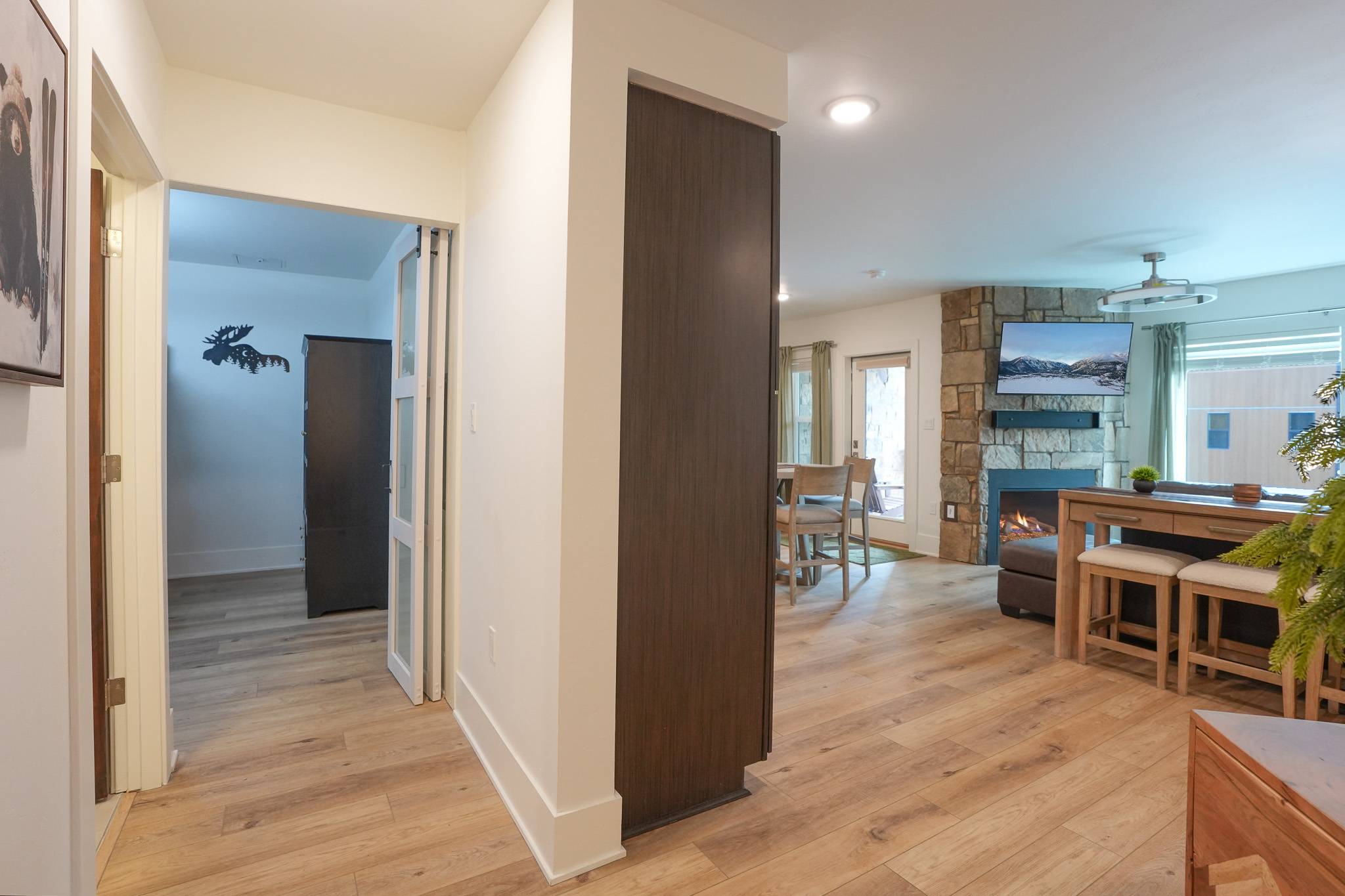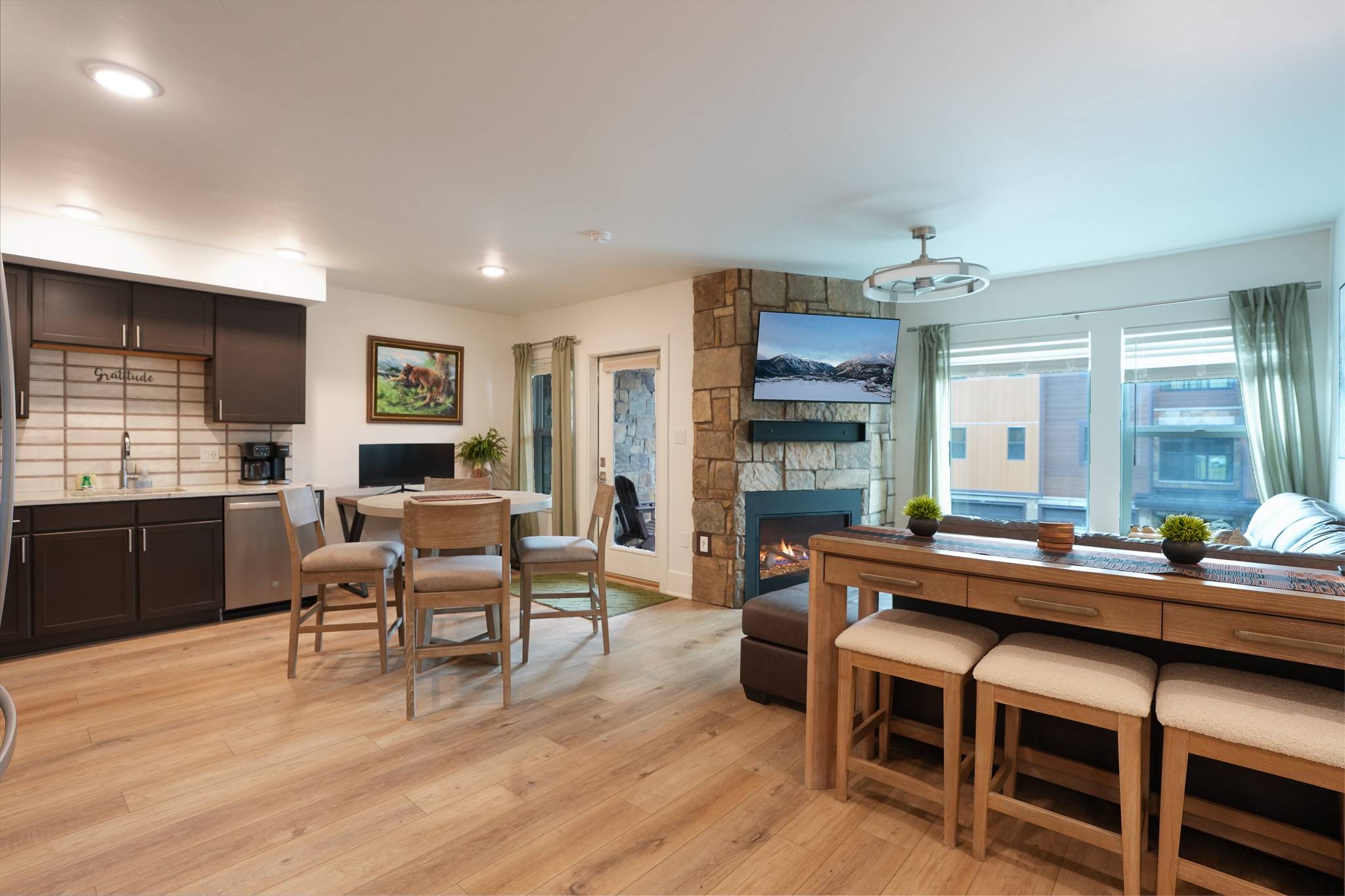 Inside, the condo has been nicely renovated with updated finishes and a functional, open layout. The kitchen features stainless steel appliances, ample prep space, and everything needed for meals at home. A dining table seats four comfortably, with an additional high-top bar area for three more seats. The living area is designed for relaxing after a day outside, with a large sectional and smart TV, while a dedicated workspace with monitor just off the kitchen makes it easy to stay connected when needed.