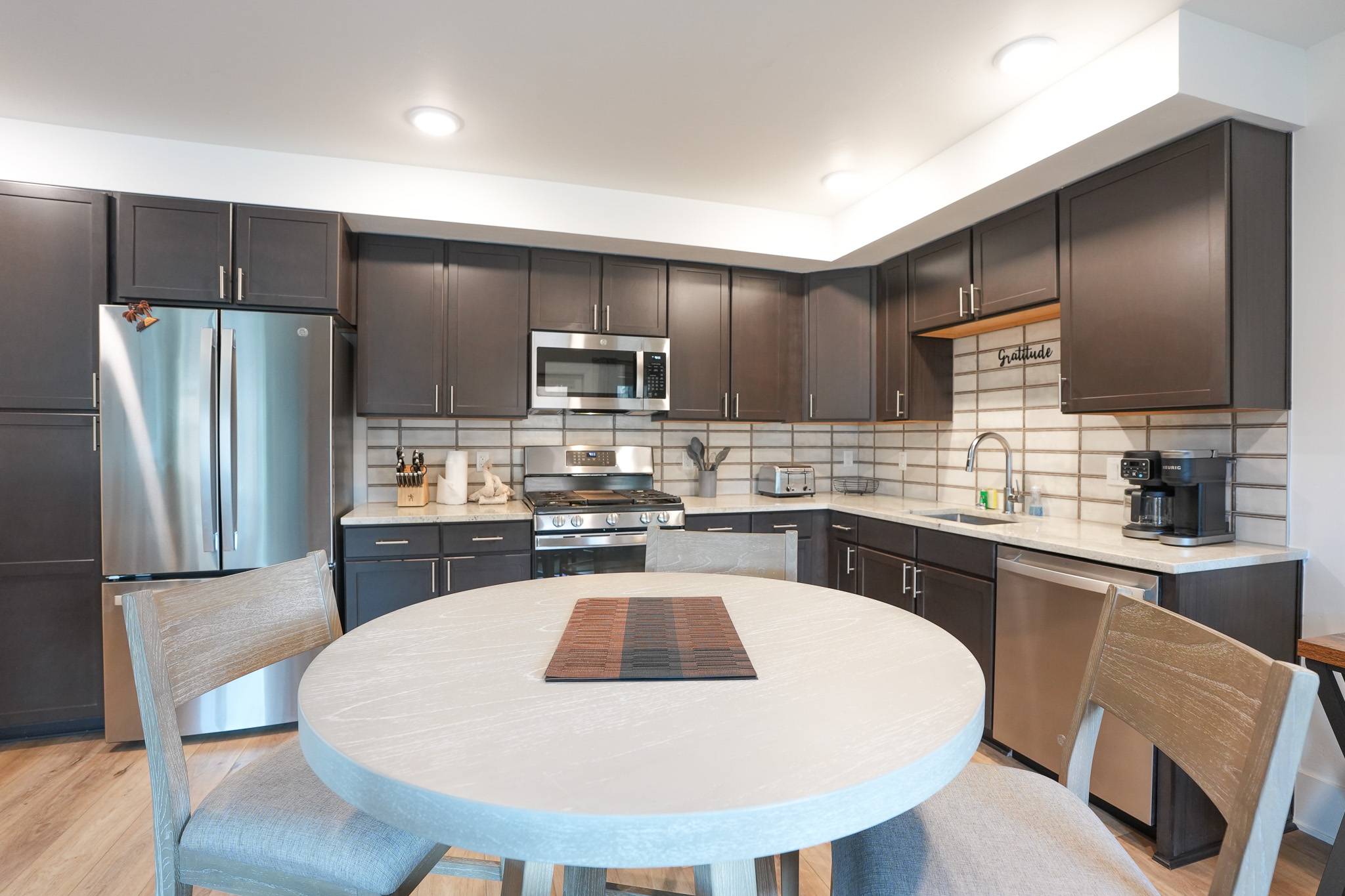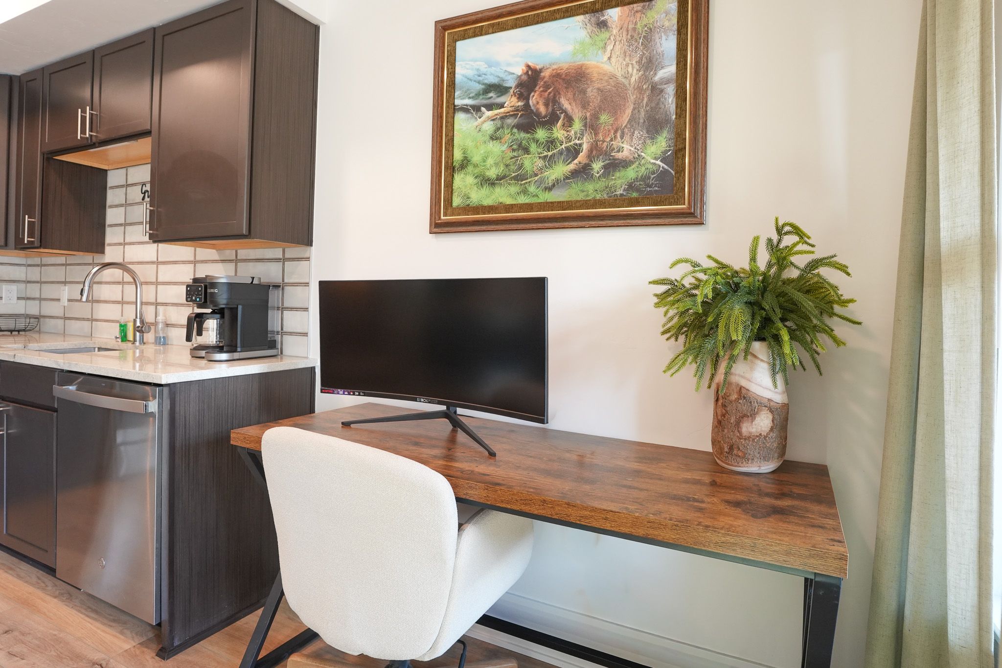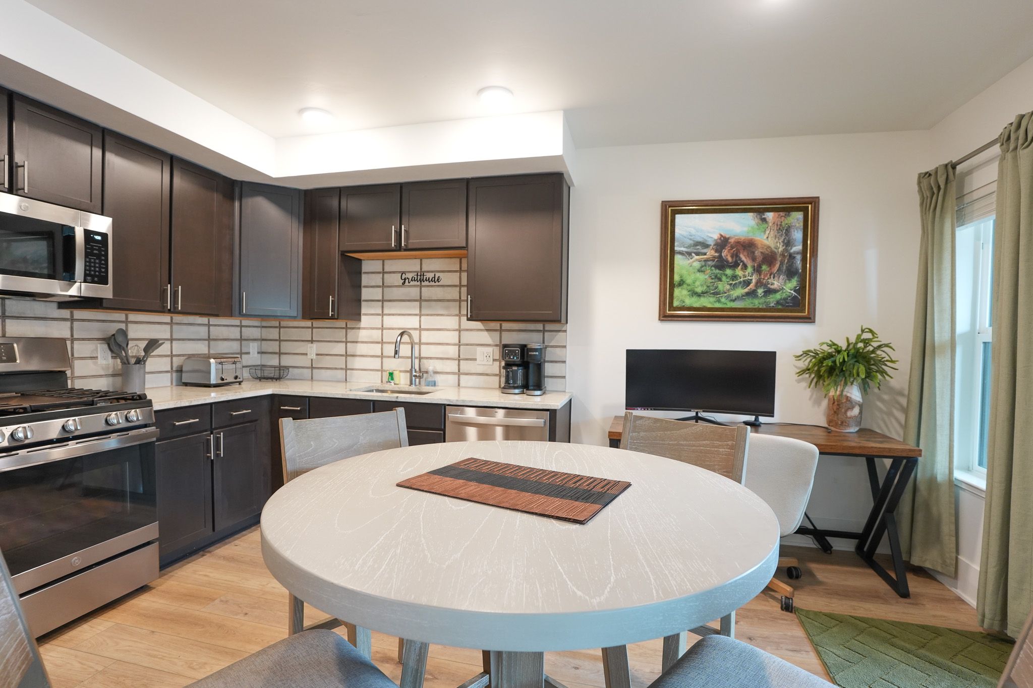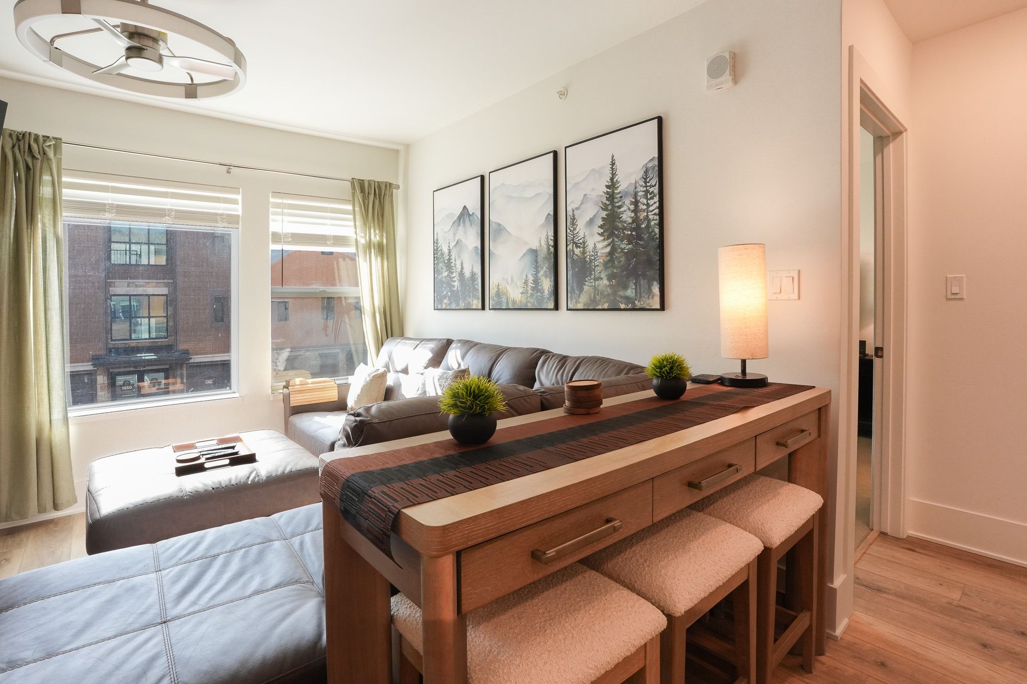 Inside, the condo has been nicely renovated with updated finishes and a functional, open layout. The kitchen features stainless steel appliances, ample prep space, and everything needed for meals at home. A dining table seats four comfortably, with an additional high-top bar area for three more seats. The living area is designed for relaxing after a day outside, with a large sectional and smart TV, while a dedicated workspace with monitor just off the kitchen makes it easy to stay connected when needed.