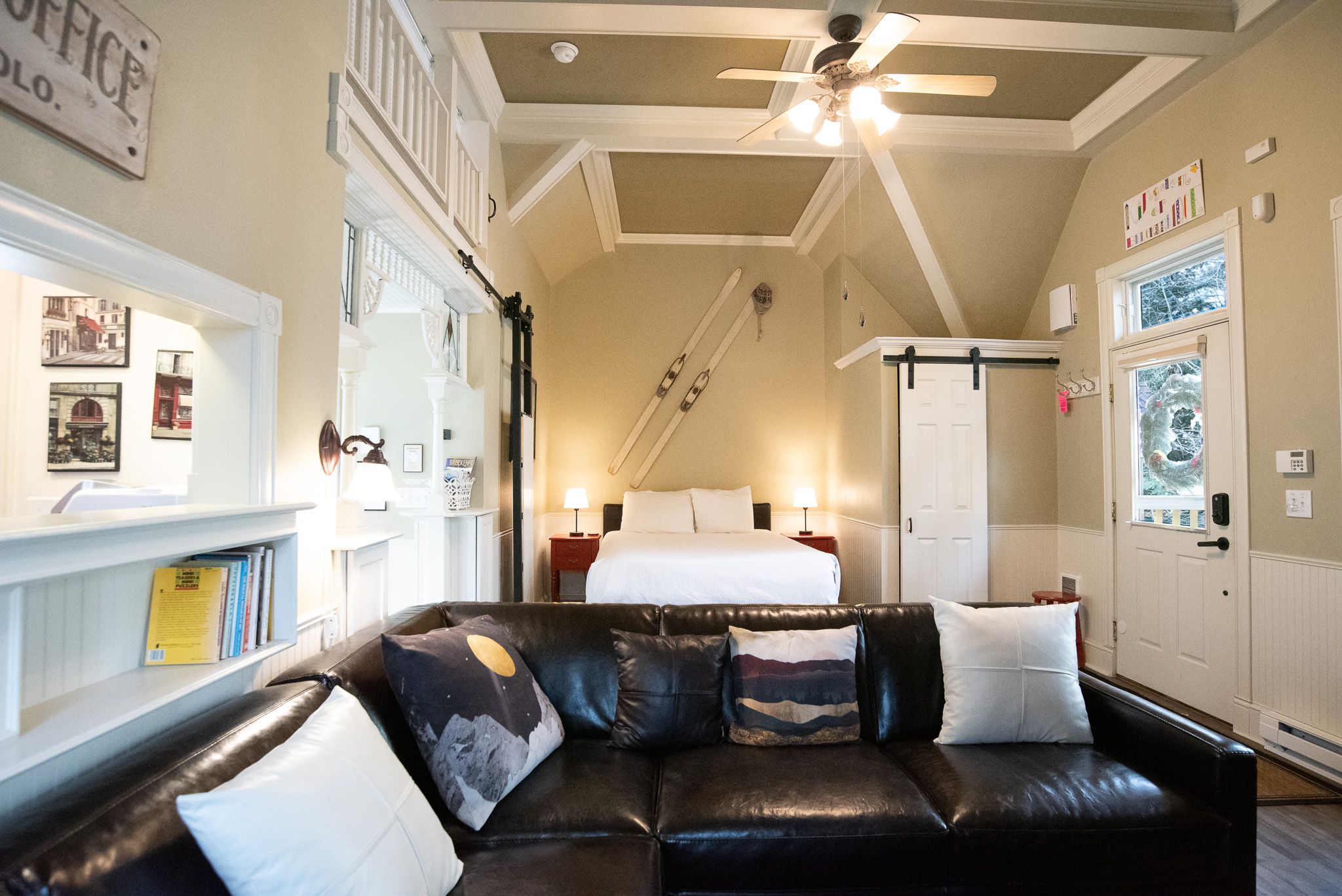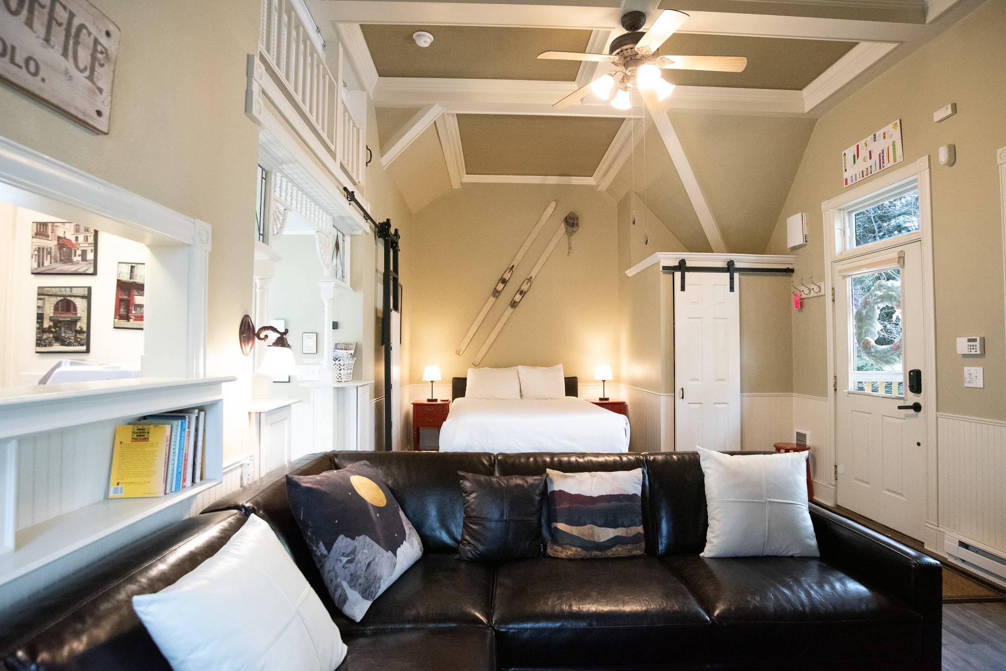 Inside, the studio offers a warm and cozy vibe with a gas fireplace, plush seating, and a smart TV—perfect for unwinding after a day on the slopes or trails. The fully equipped kitchen has everything you need to prepare meals, from a range and microwave to cookware and utensils. Gather at the dining table for a sit-down dinner or enjoy a casual breakfast before heading out for another day of mountain adventure.