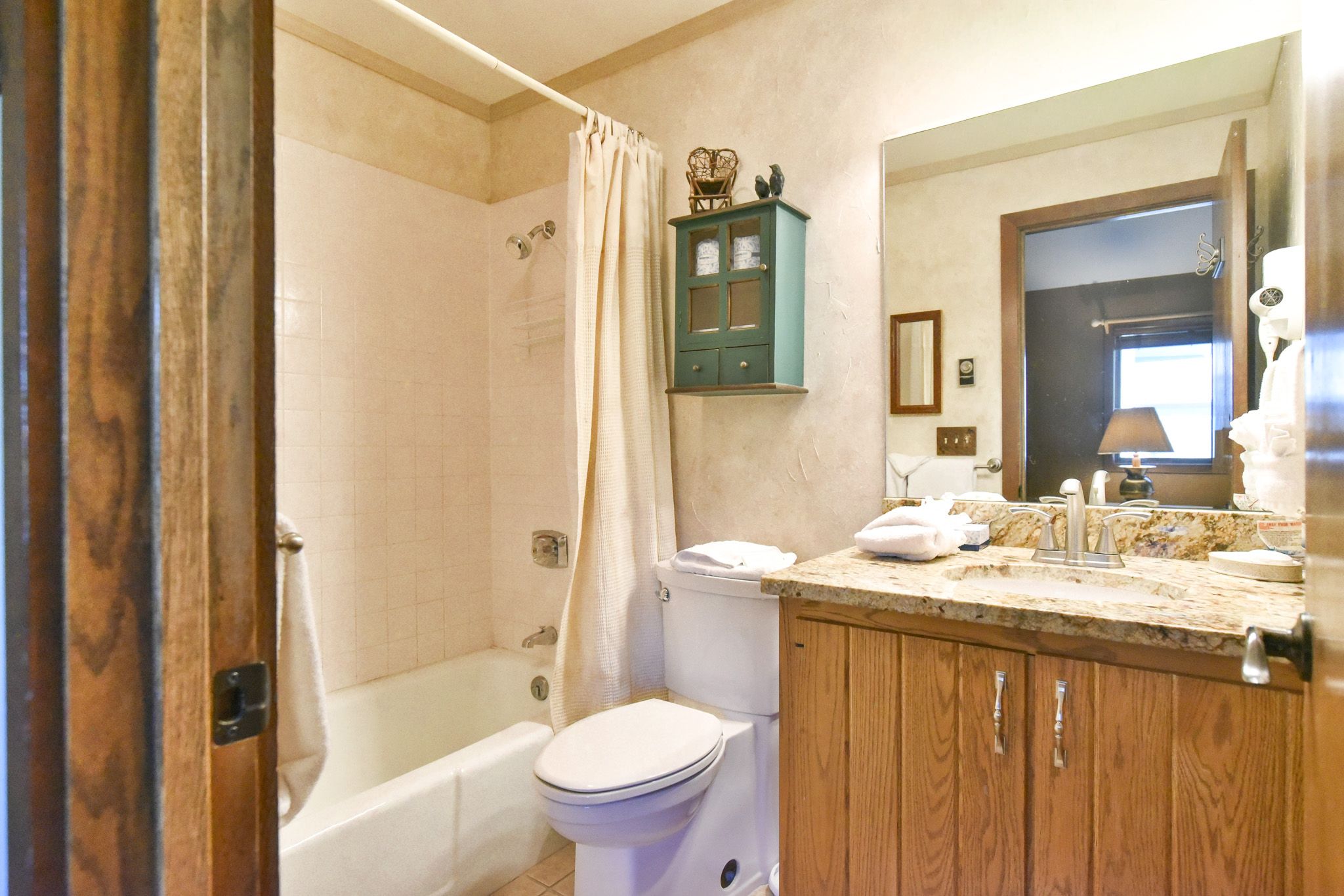 - Queen Master Suite: Queen bed, vaulted ceilings, ensuite bathroom with shower/tub combo. (Sleeps 2)