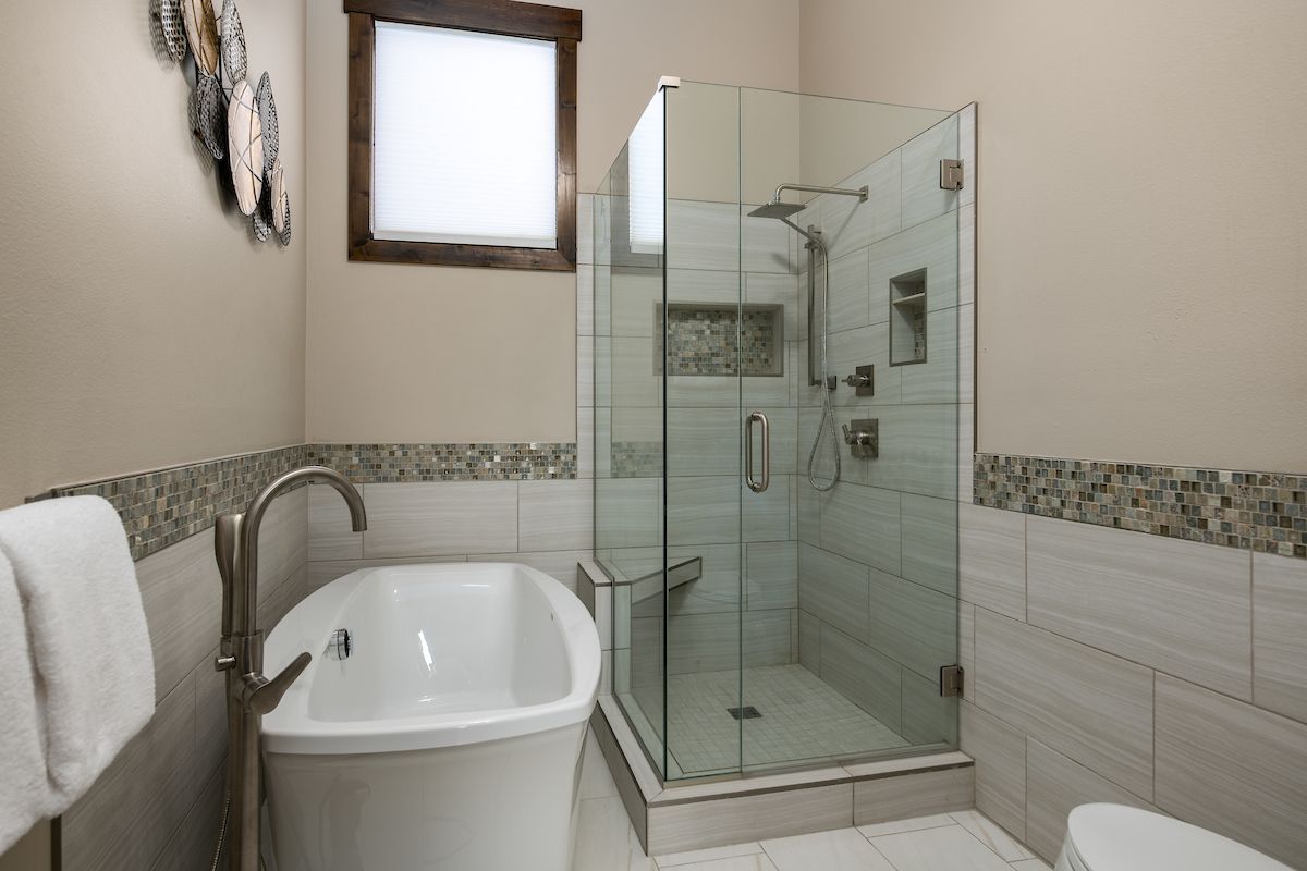 - King master suite: beautiful room with vaulted ceilings and floor-to-ceiling windows, king bed, large flat screen TV, and a private attached bathroom with two sinks, a glass walk-in shower, and a jacuzzi soaking tub. (sleeps 2)