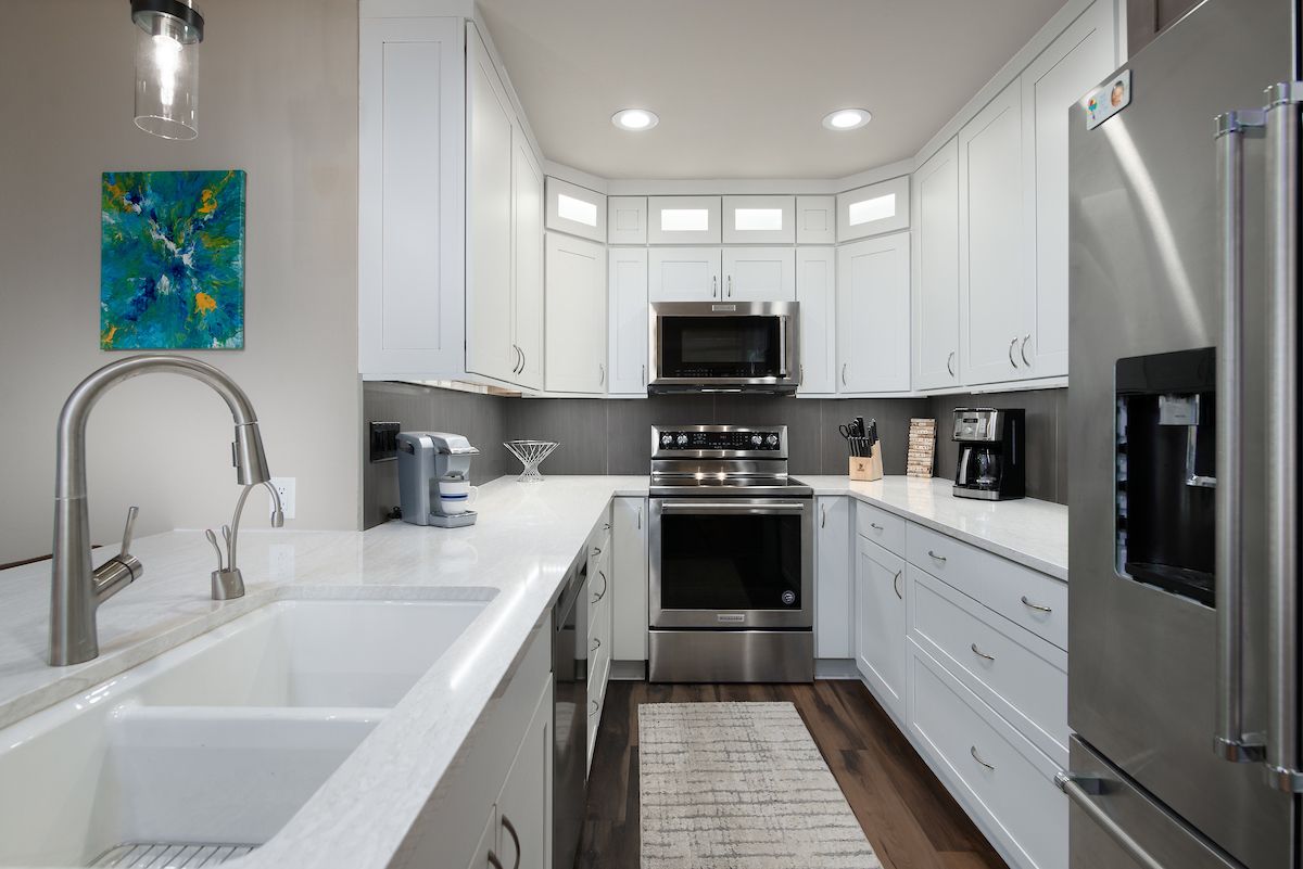 The fully equipped kitchen area features stainless steel appliances and contrastingly beautiful quartz counters. There’s plenty of counter space for even the most demanding chefs, and there’s also plenty of seating (room for 6) at the breakfast bar for the backseat cooks and sous chefs to supervise as well. The attached dining area features a large table with room for 6.