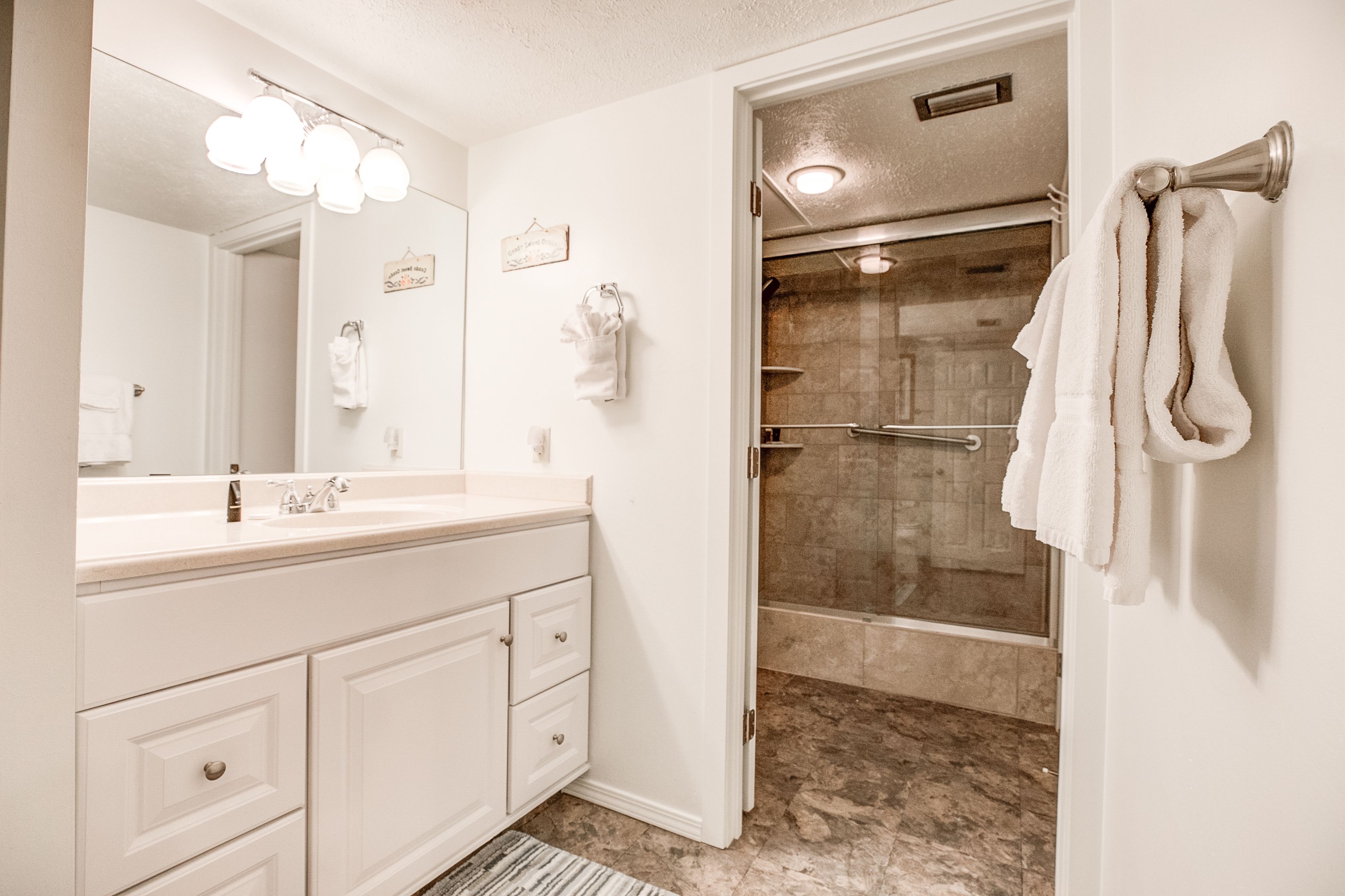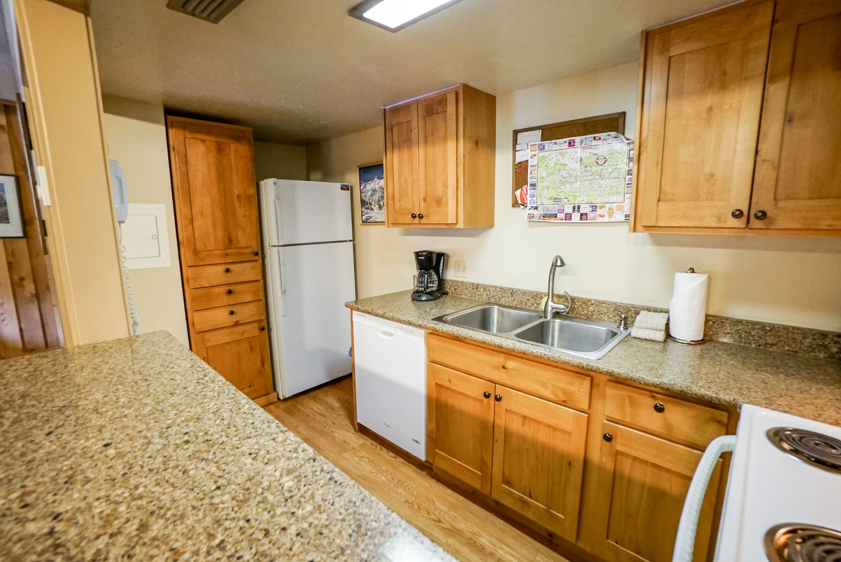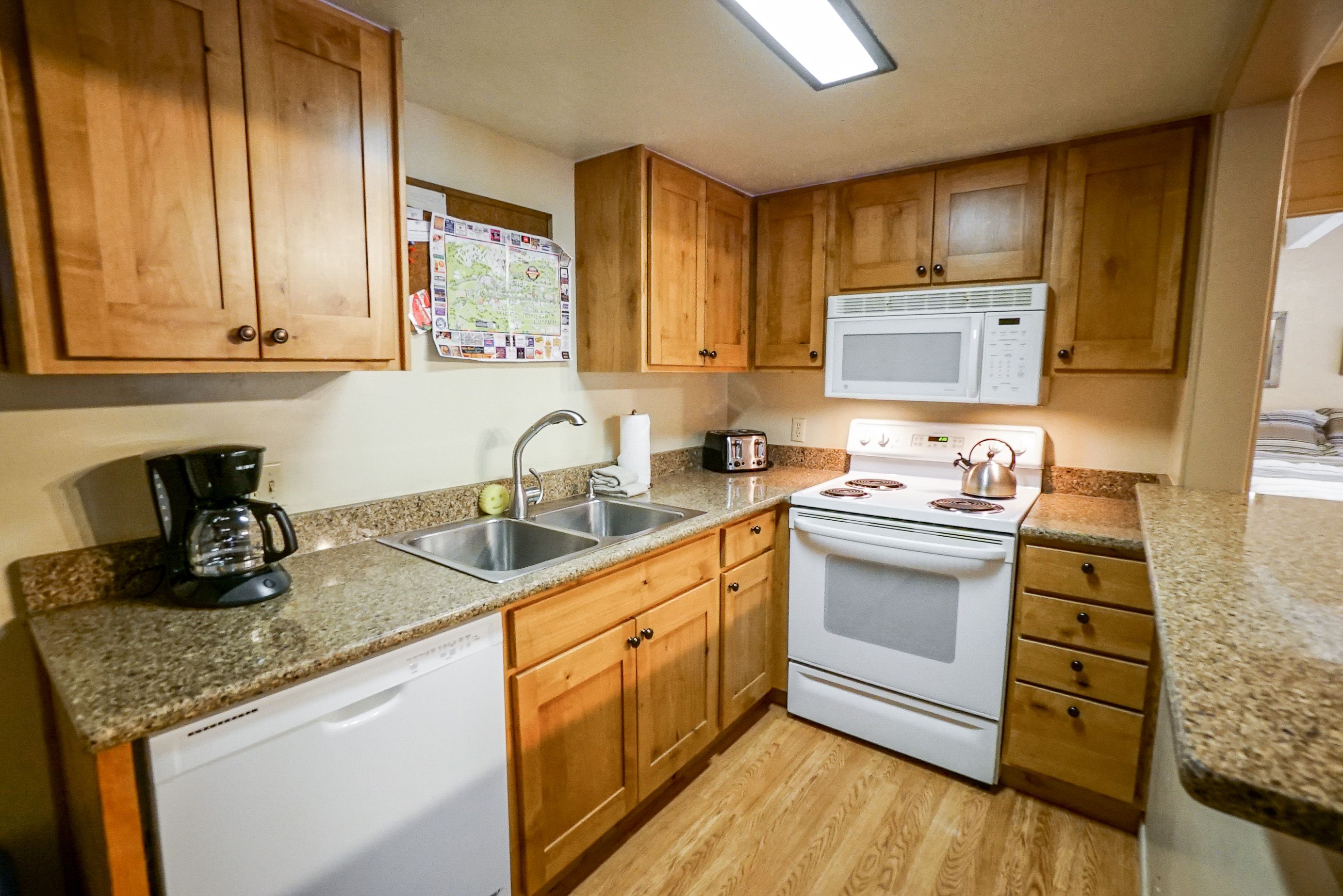 This 1-bedroom, 1-bathroom condo is a great choice for families or groups of up to 4 people. There’s a large, comfortable living room with a beautiful gas fireplace, and plenty of seating. Or step out onto the patio, pull up a chair and relax after a long day of adventures. The fully equipped kitchen is right off the living room and has seating for four at the dining table and another two at the breakfast bar.Â