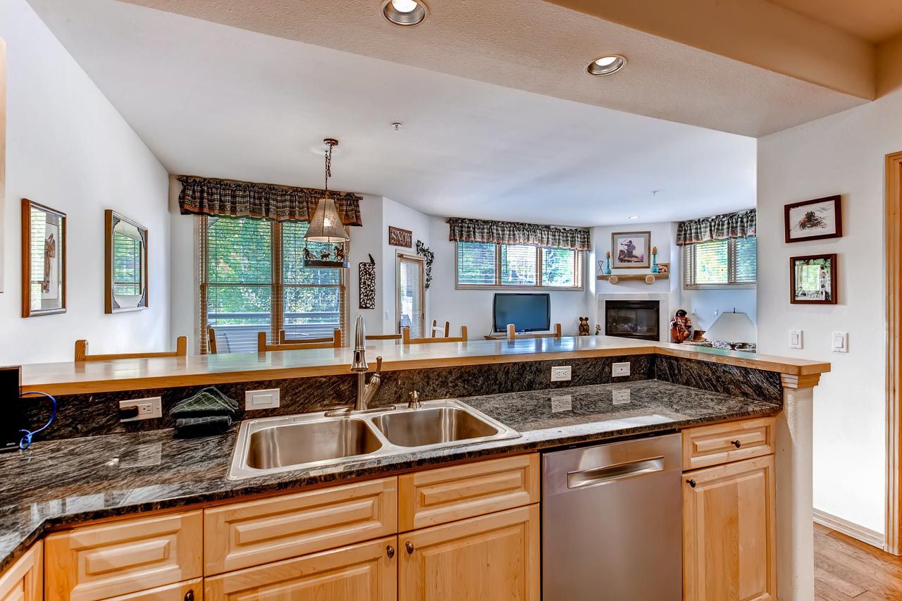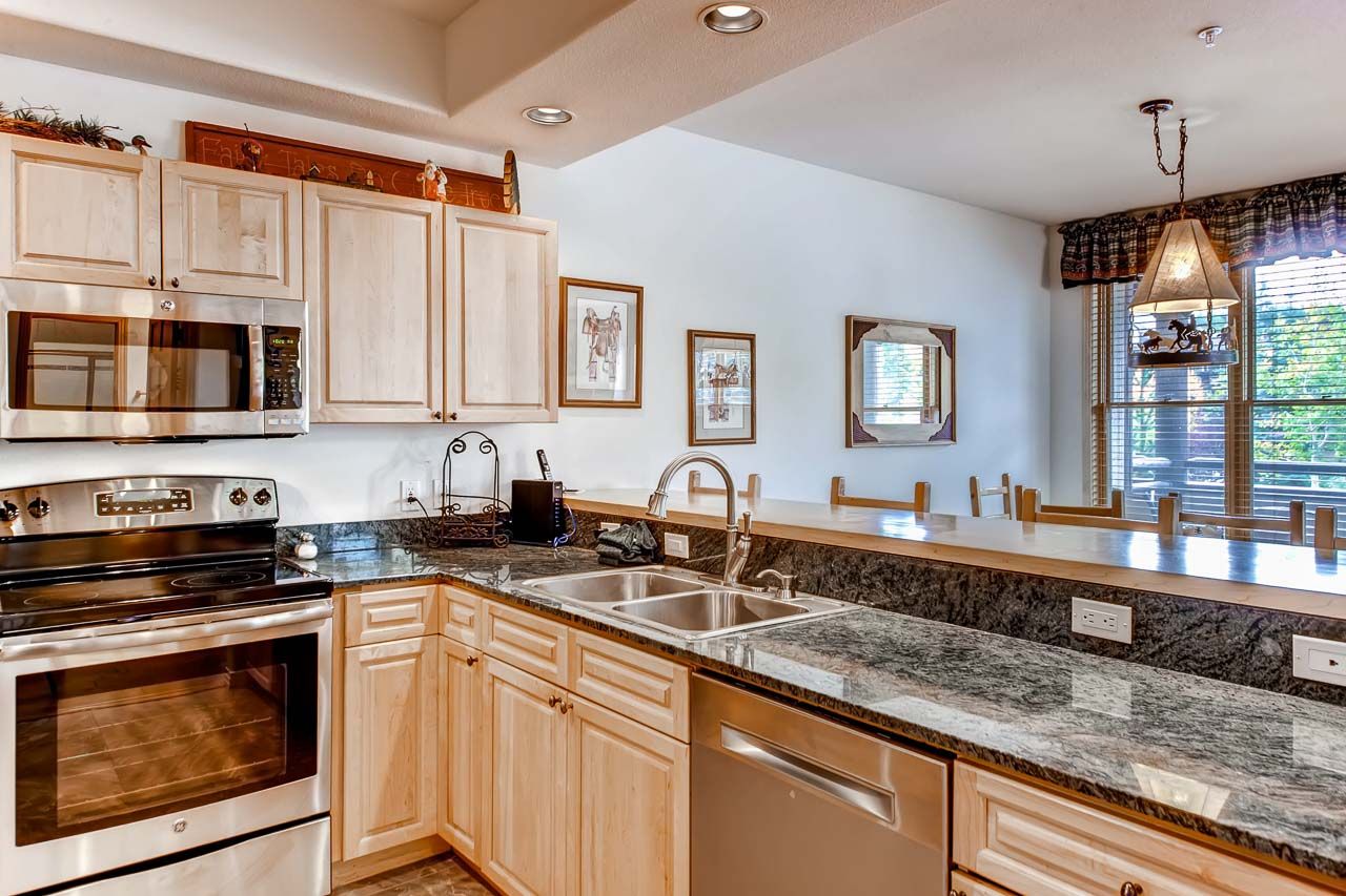 This 2-bedroom, 2-bathroom deluxe condo is a relaxing getaway space for up to eight guests. The large, inviting living area will make you feel right at home. Settle in after a day on the slopes, enjoy a movie on the large flat-screen TV or curl up with a book next to the warm gas fireplace. The full kitchen features granite counters, stainless-steel appliances and all the gear you’ll need to whip up meals and snacks for the whole gang! The dining table seats six, and there’s room for four more at the counter.