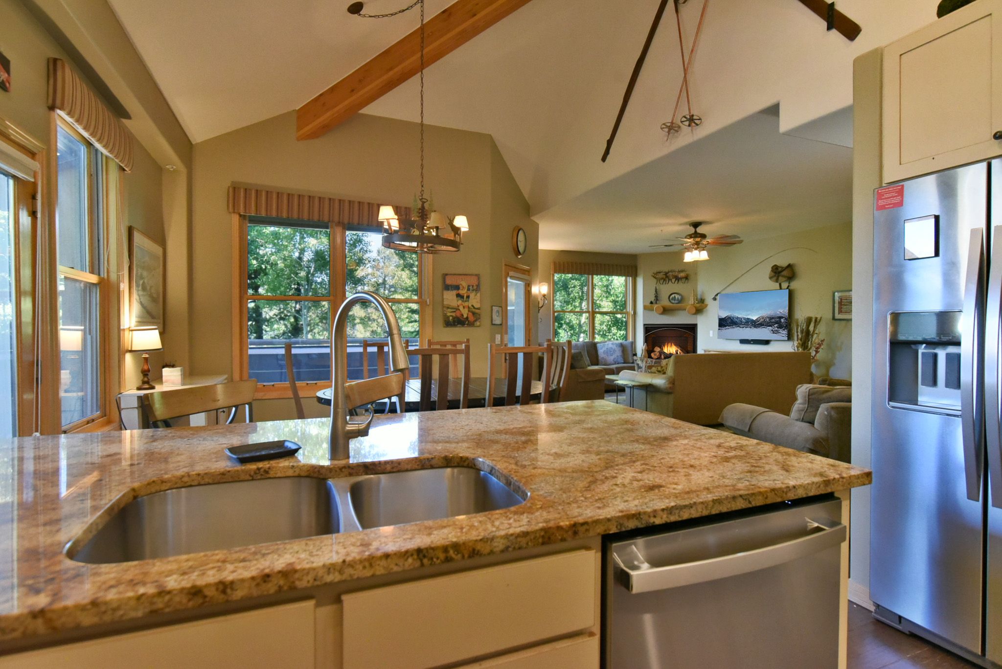 With abundant seating, a gas fireplace and a large wall-mounted flat-screen TV, the living room is the perfect spot for the whole group to kick back and take in a movie. The kitchen is large and perfectly equipped with stainless-steel appliances and beautiful maple cabinetry and granite counters. There’s a dining table for eight — plus room for three more at the counter — so memorable meals will be a highlight of your vacation.