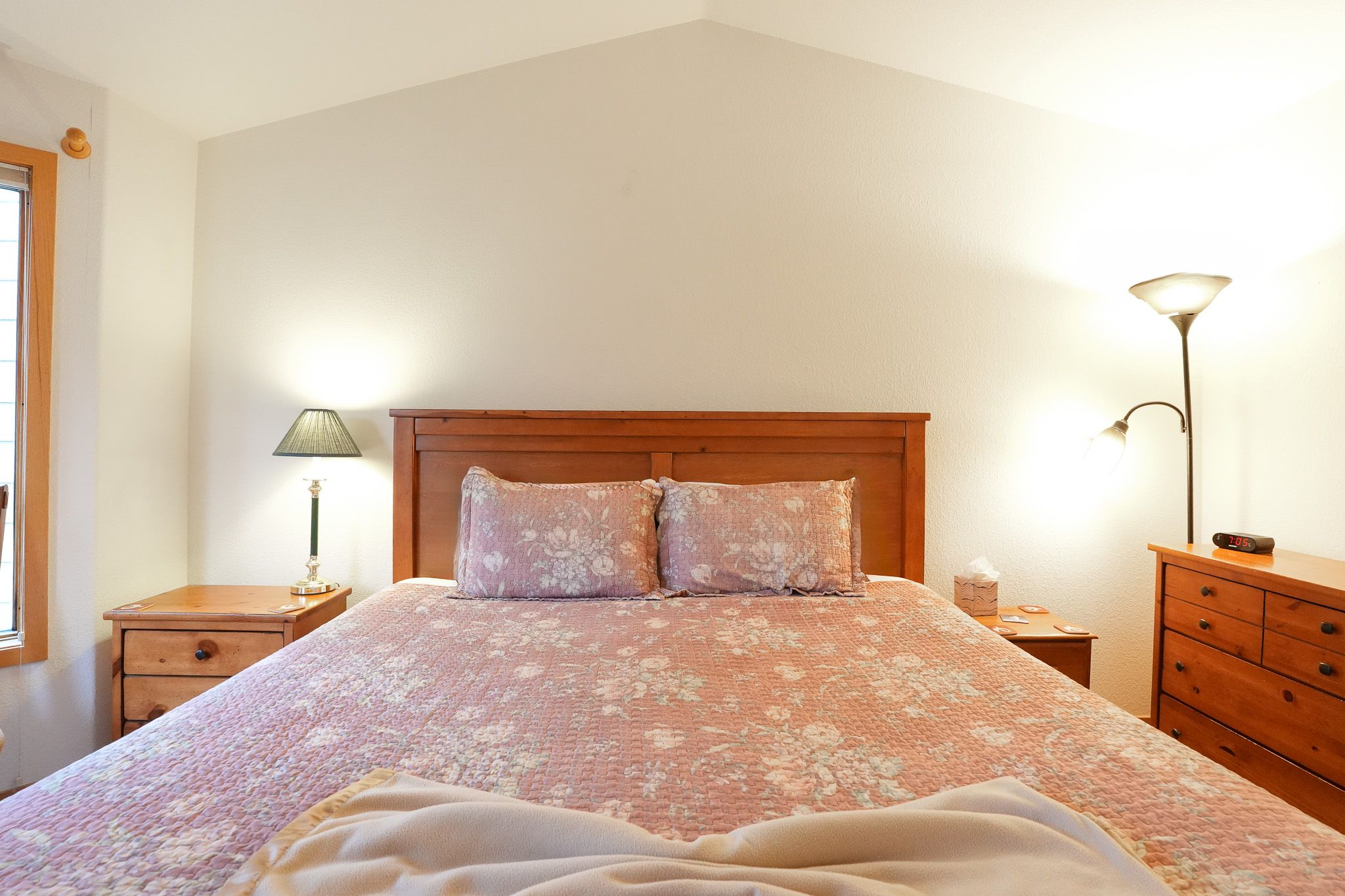 Inside, the home features a spacious, open living area with vaulted ceilings that bring in great natural light and create an inviting place to gather. The living room offers comfortable seating, a large smart TV, and direct access to the private deck, making it easy to unwind after a day outdoors. The adjoining dining area and breakfast bar provide plenty of space for meals together, while the kitchen is equipped with granite countertops, ample prep space, and all the cookware you’ll need for everything from quick breakfasts to full dinners at home.