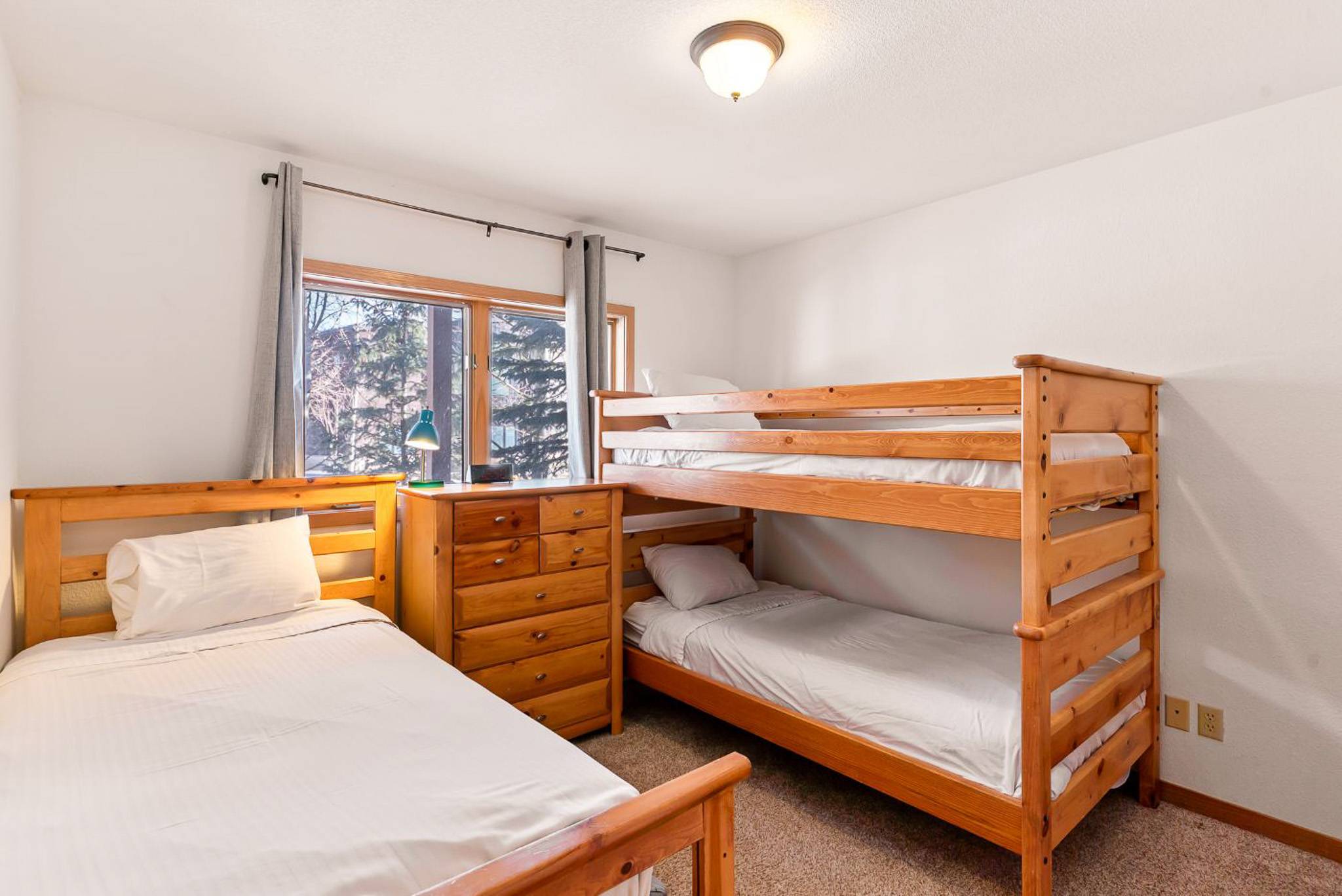 The layout offers a great balance of space and privacy for groups. The top level hosts the primary suite with a king bed and private ensuite bathroom with a shower/tub combo, along with the main living, kitchen, and dining areas. Downstairs, you’ll find a queen bedroom and a bunk room featuring a twin-over-twin bunk bed plus an additional twin bed, along with a shared bathroom with a shower/tub combo. There’s also a queen sleeper sofa in the living room for additional sleeping flexibility, as well as access to the 1-car private garage.