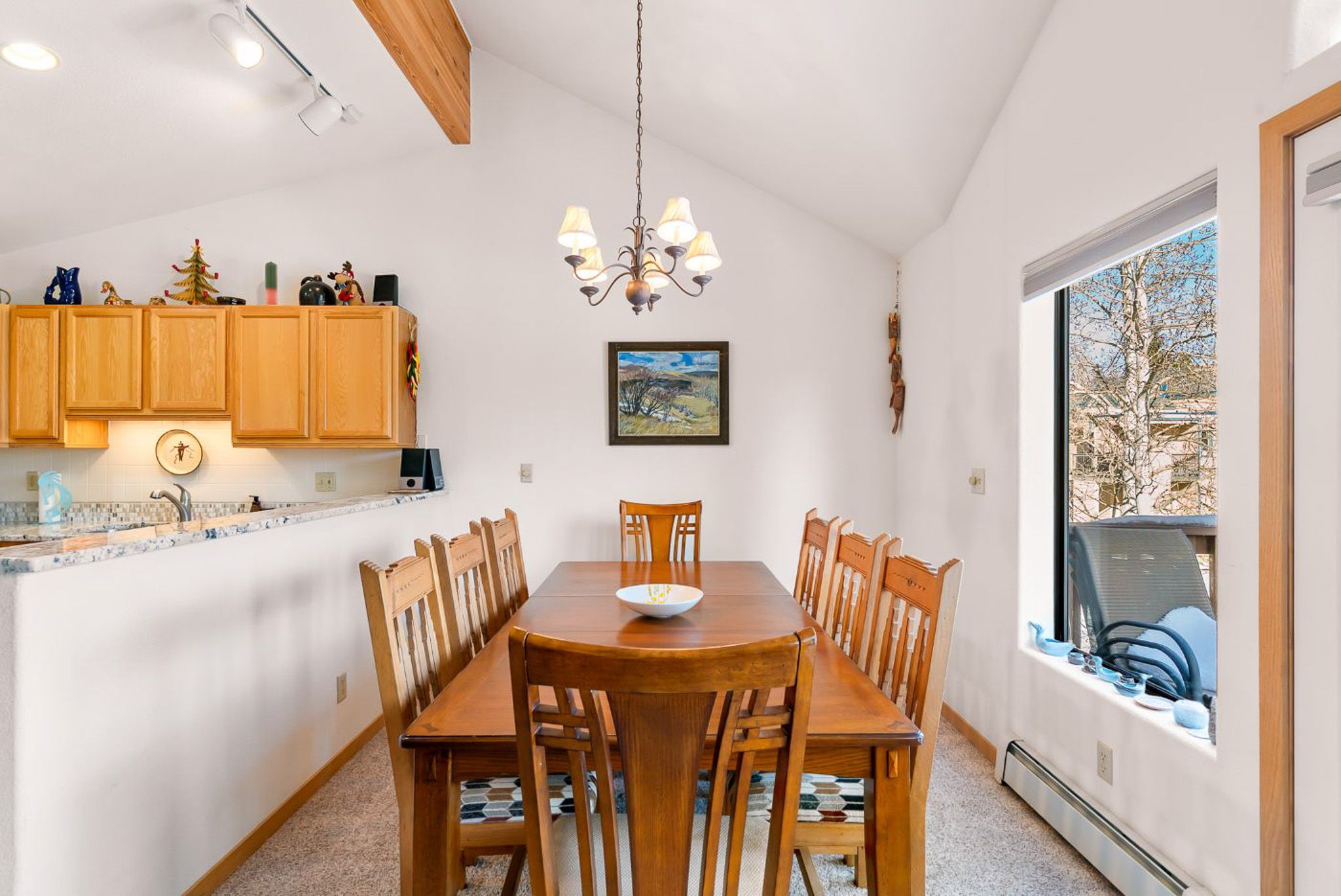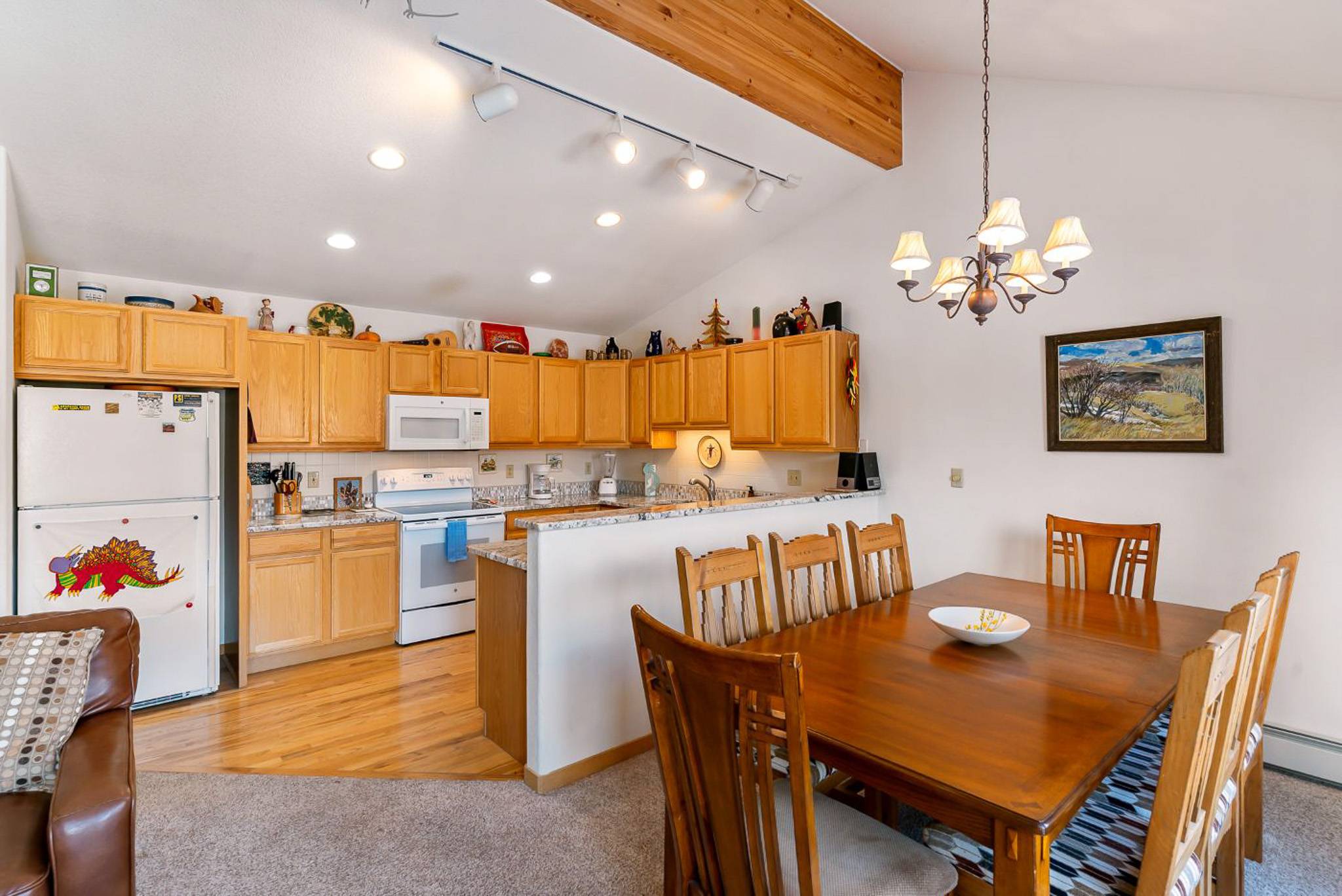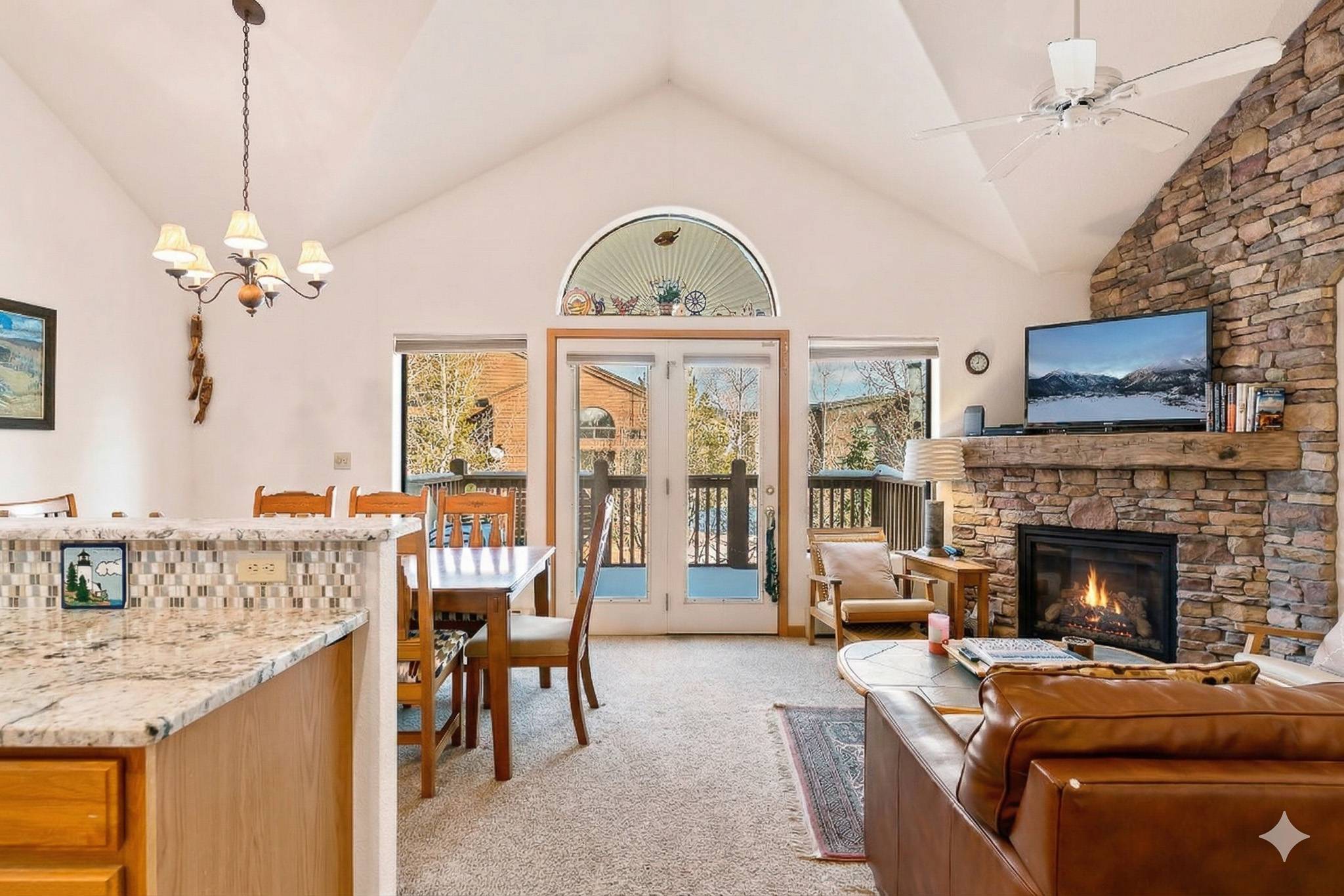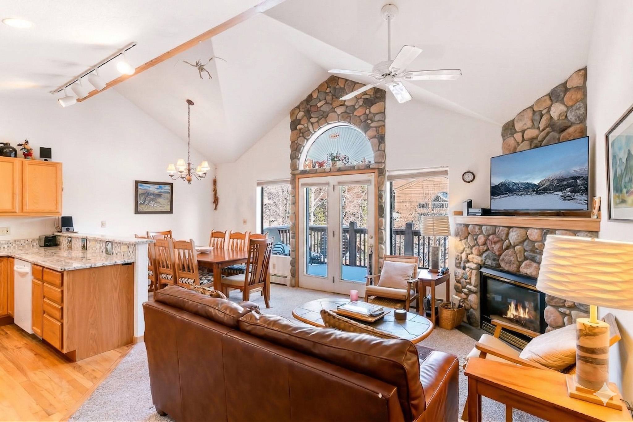 Inside, the home features a spacious, open living area with vaulted ceilings that bring in great natural light and create an inviting place to gather. The living room offers comfortable seating, a large smart TV, and direct access to the private deck, making it easy to unwind after a day outdoors. The adjoining dining area and breakfast bar provide plenty of space for meals together, while the kitchen is equipped with granite countertops, ample prep space, and all the cookware you’ll need for everything from quick breakfasts to full dinners at home.
