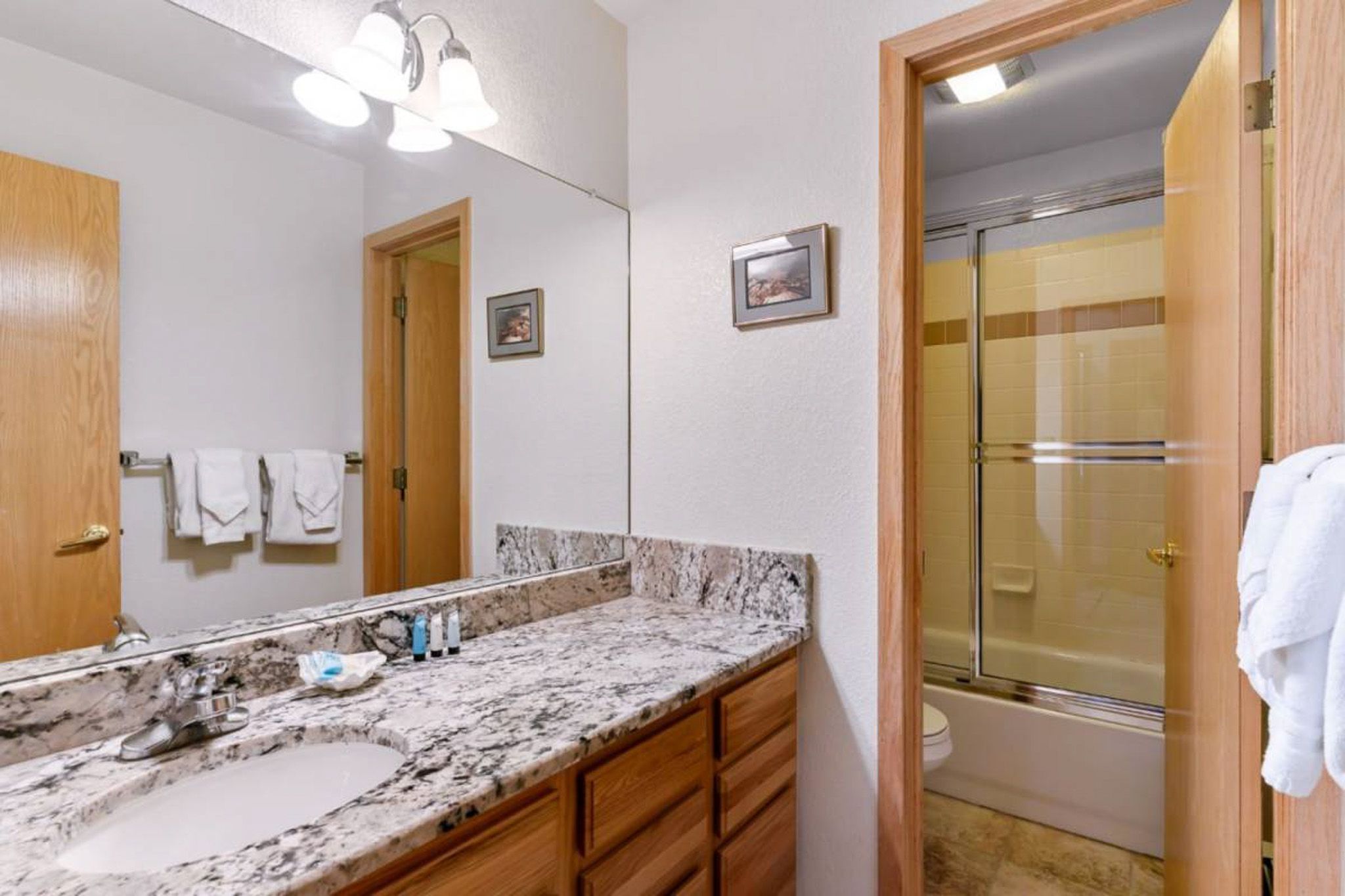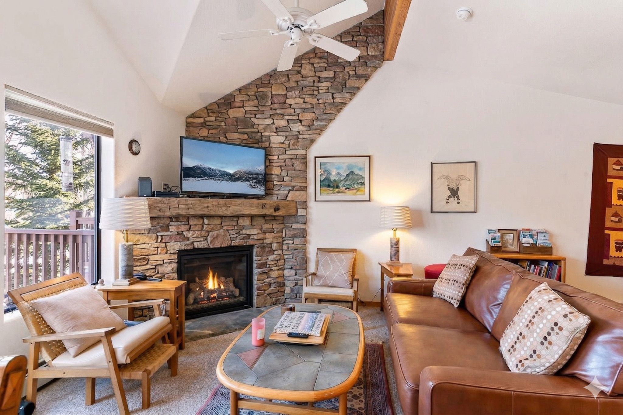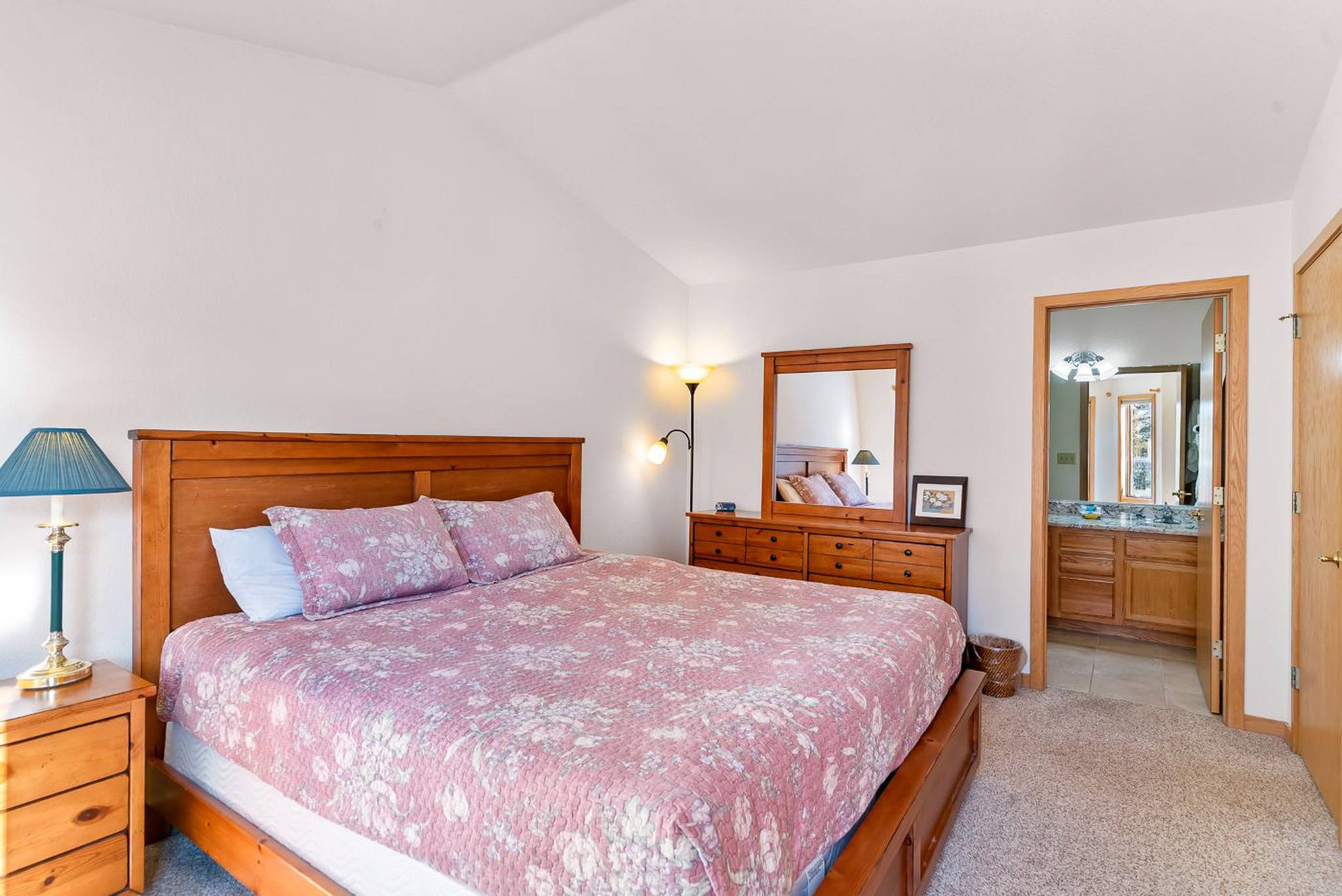 Inside, the home features a spacious, open living area with vaulted ceilings that bring in great natural light and create an inviting place to gather. The living room offers comfortable seating, a large smart TV, and direct access to the private deck, making it easy to unwind after a day outdoors. The adjoining dining area and breakfast bar provide plenty of space for meals together, while the kitchen is equipped with granite countertops, ample prep space, and all the cookware you’ll need for everything from quick breakfasts to full dinners at home.