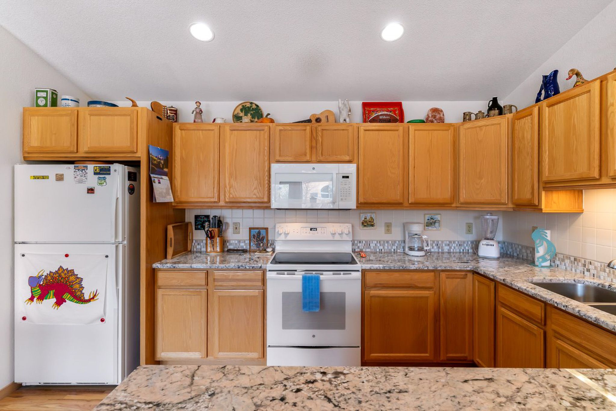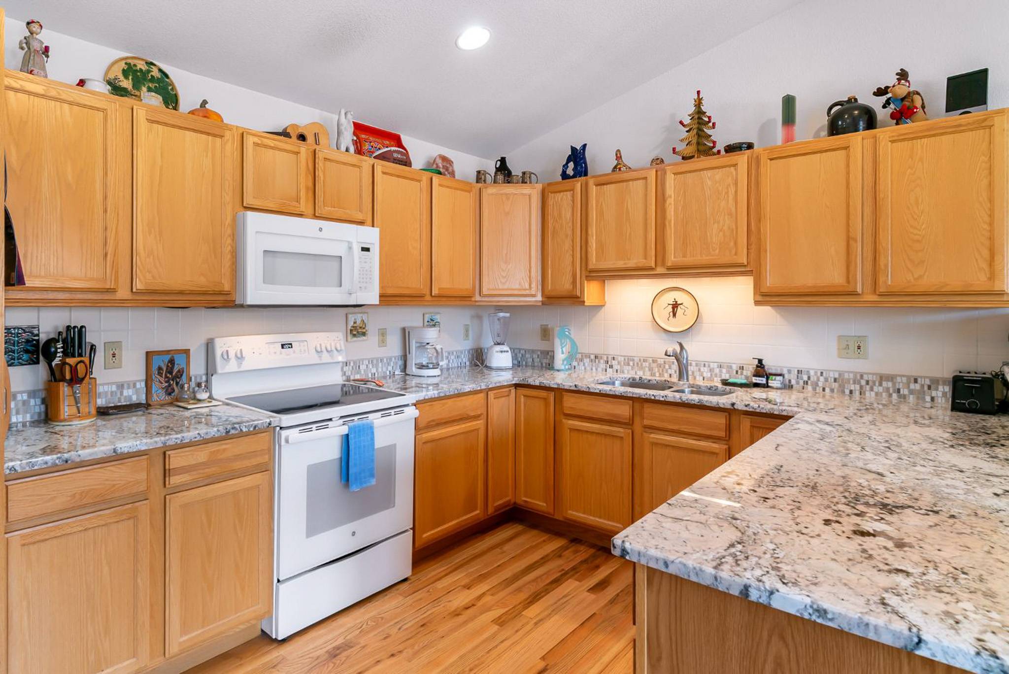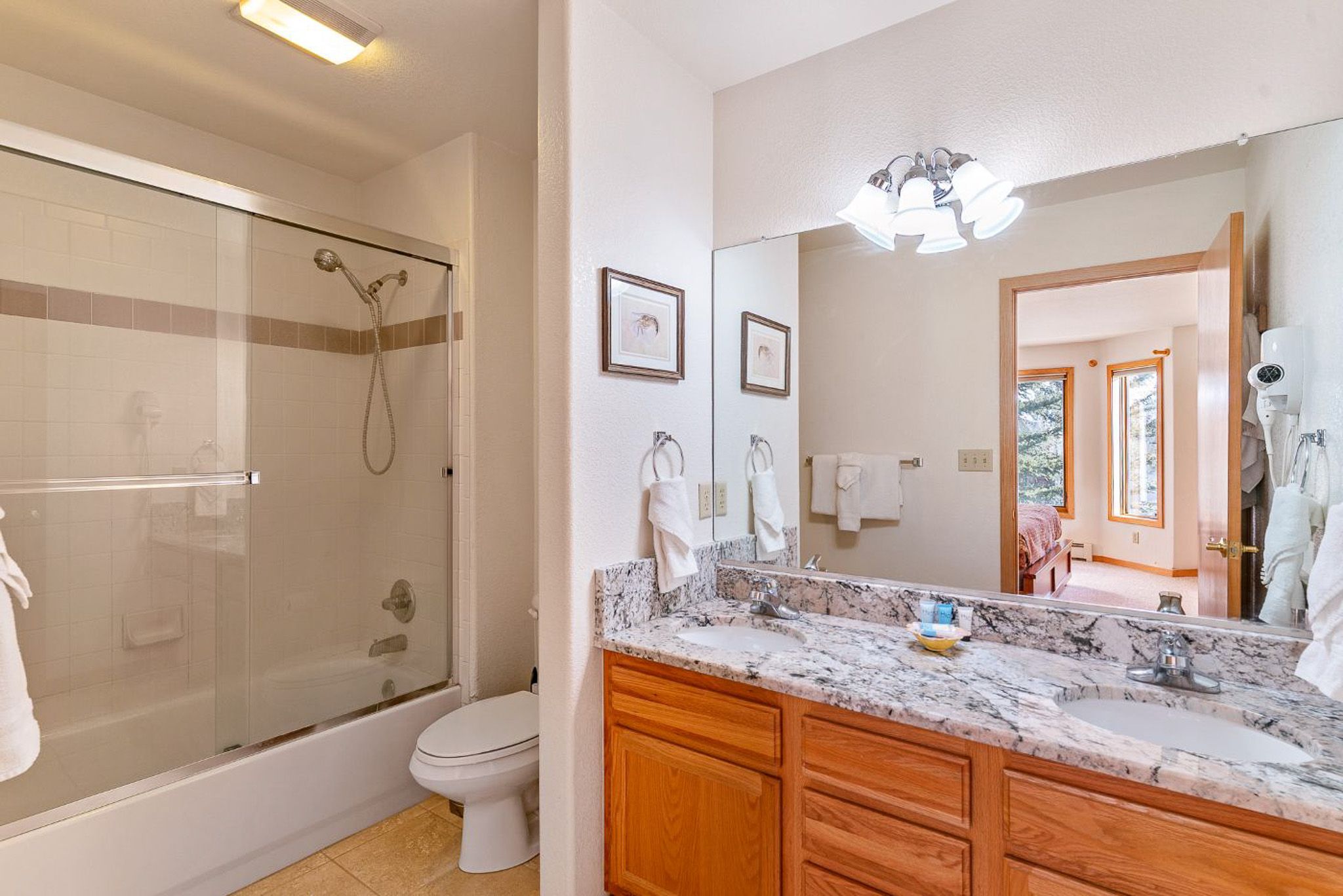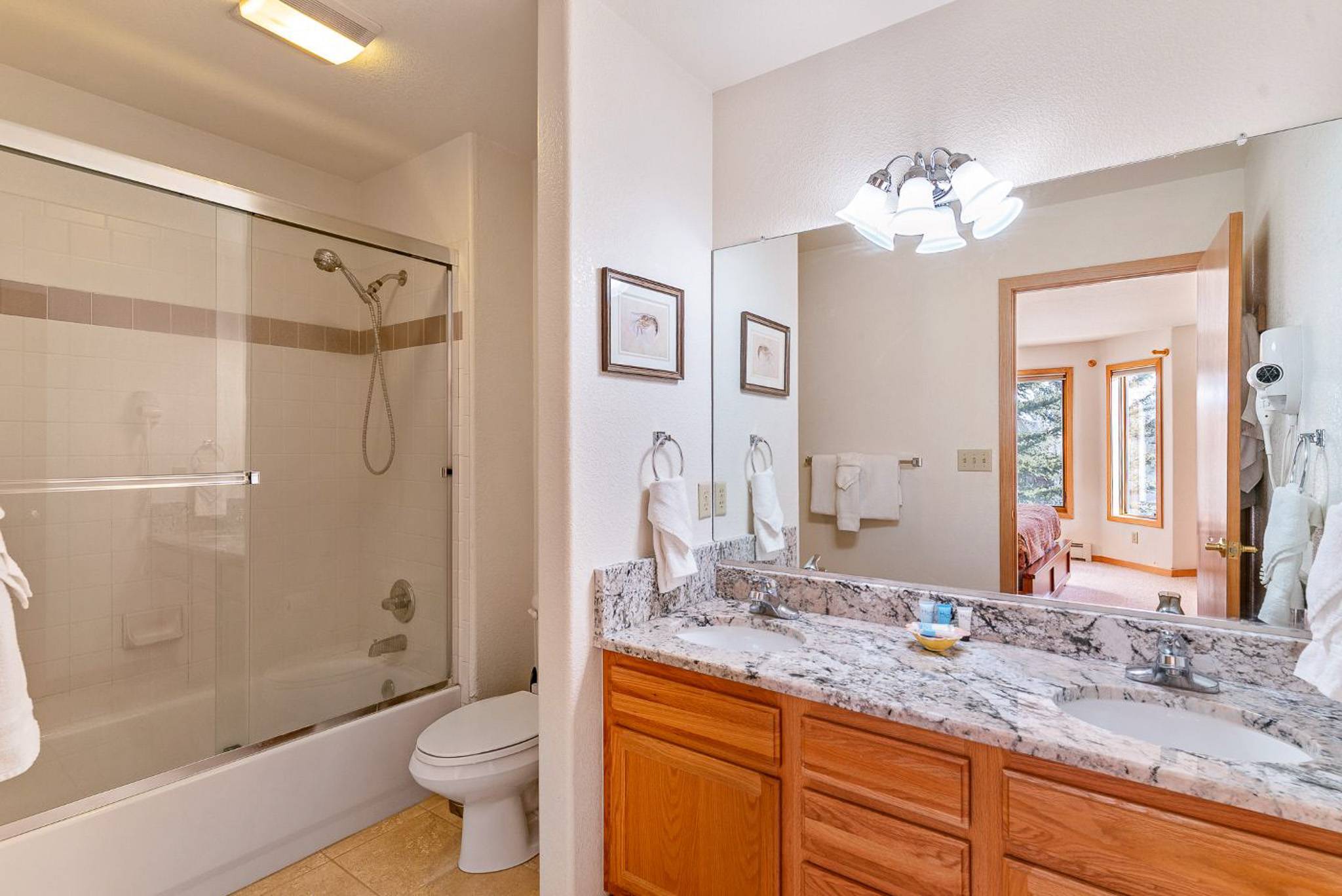 Inside, the home features a spacious, open living area with vaulted ceilings that bring in great natural light and create an inviting place to gather. The living room offers comfortable seating, a large smart TV, and direct access to the private deck, making it easy to unwind after a day outdoors. The adjoining dining area and breakfast bar provide plenty of space for meals together, while the kitchen is equipped with granite countertops, ample prep space, and all the cookware you’ll need for everything from quick breakfasts to full dinners at home.