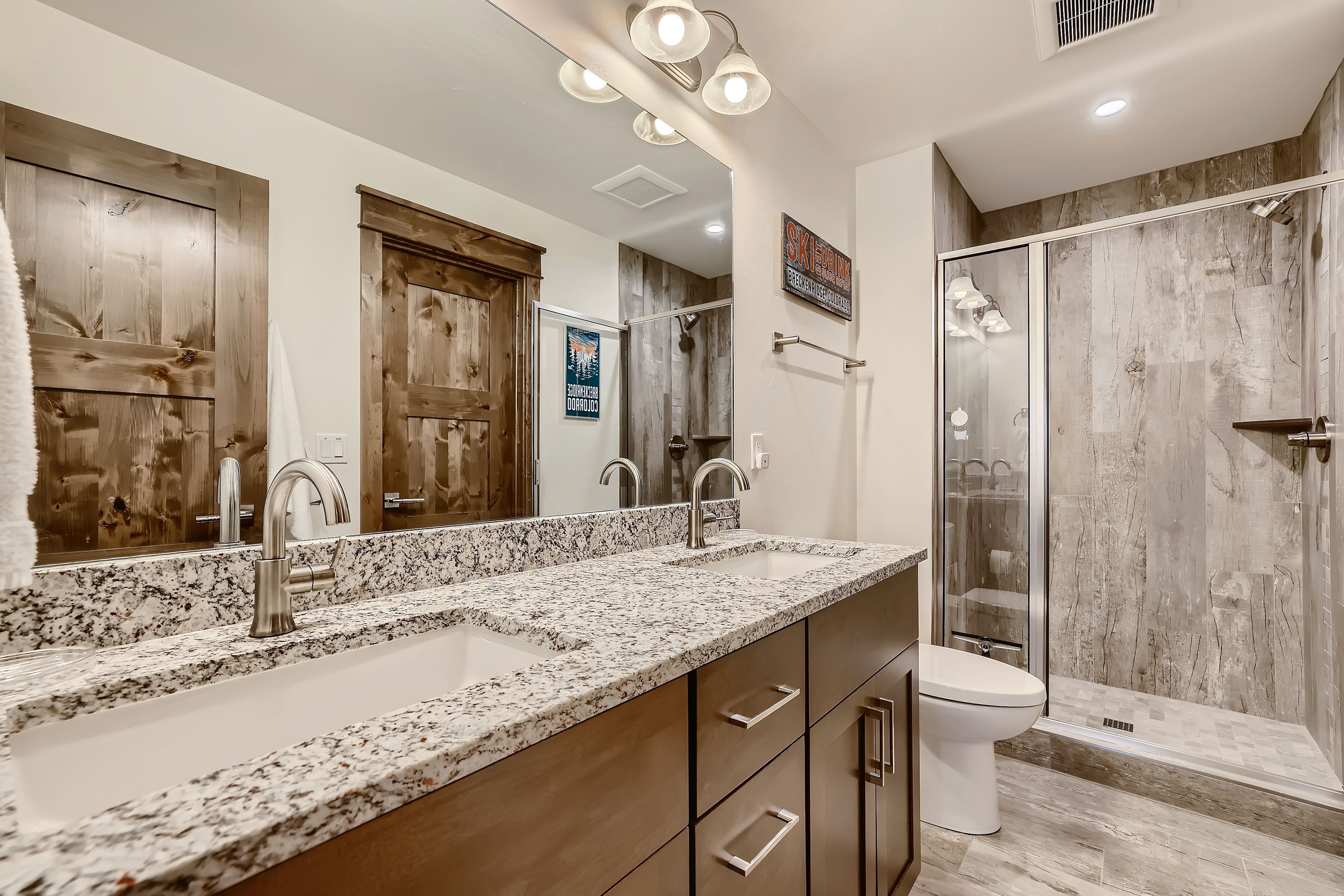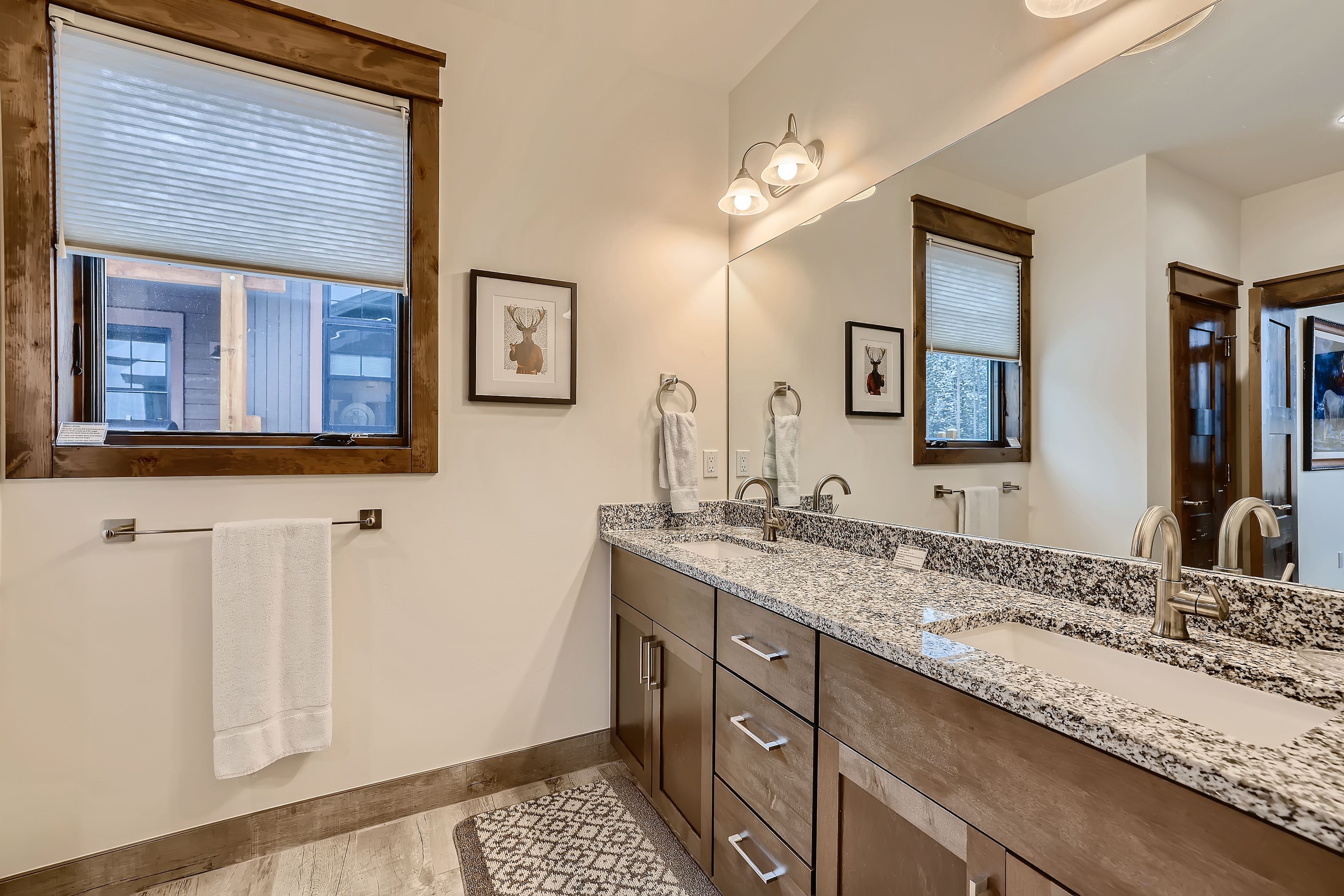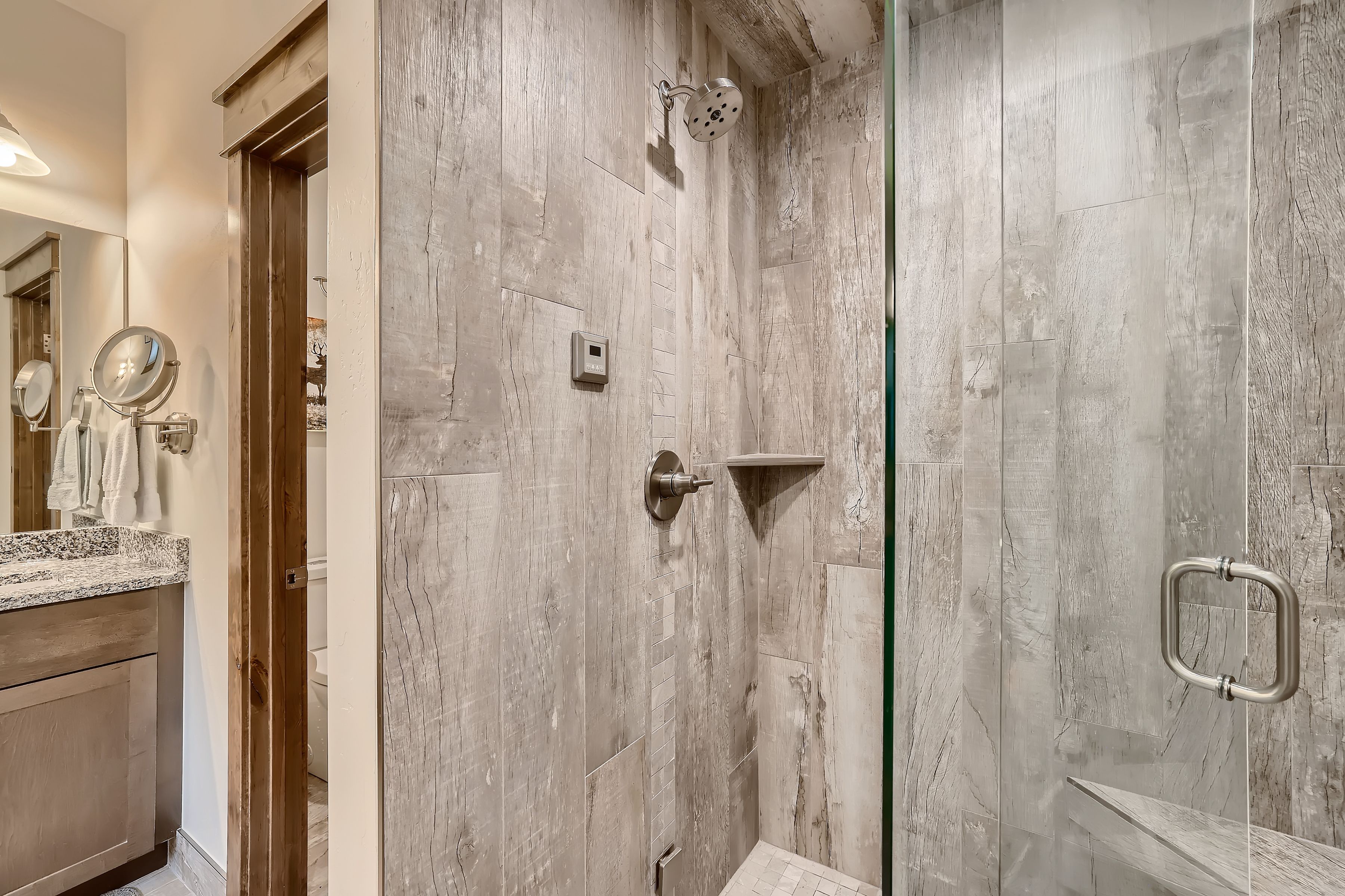 This 4-bedroom, 4.5-bathroom premium home is a fantastic retreat for families or groups of up to ten – and with three bedroom/suites with private bathrooms, it’s perfect for multiple couples/families to share! In the living area, you’ll find vaulted ceilings, large windows letting in great natural light, a floor-to-ceiling rock gas fireplace, a large flat-screen TV, and plenty of seating for trading stories after the day’s mountain adventures. The kitchen features beautiful counters, a pro-quality gas range, and plenty of high-end cooking gear. The dining table seats eight, and there’s room at the counter. Just outside, the deck features outdoor table seating and a gas grill!