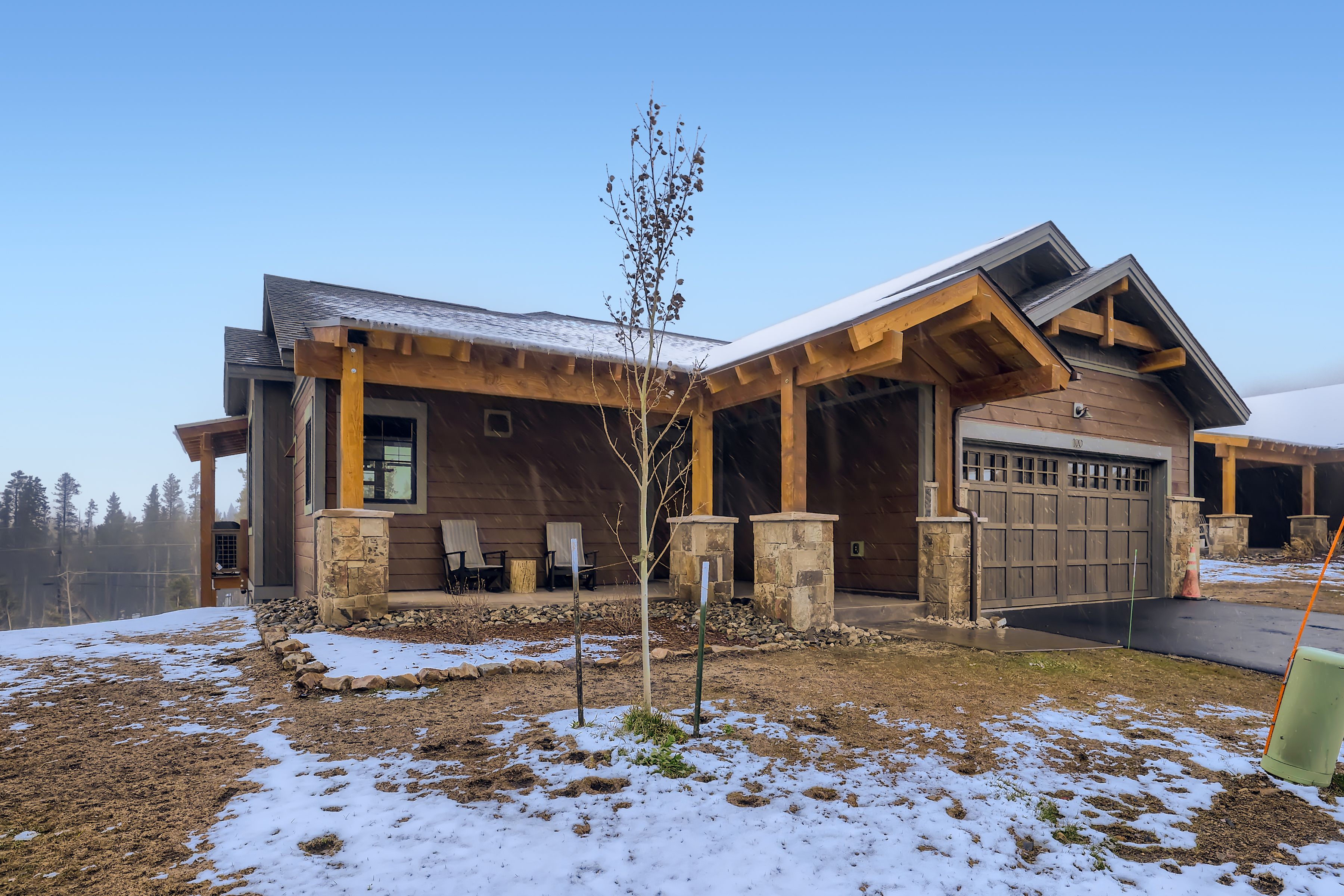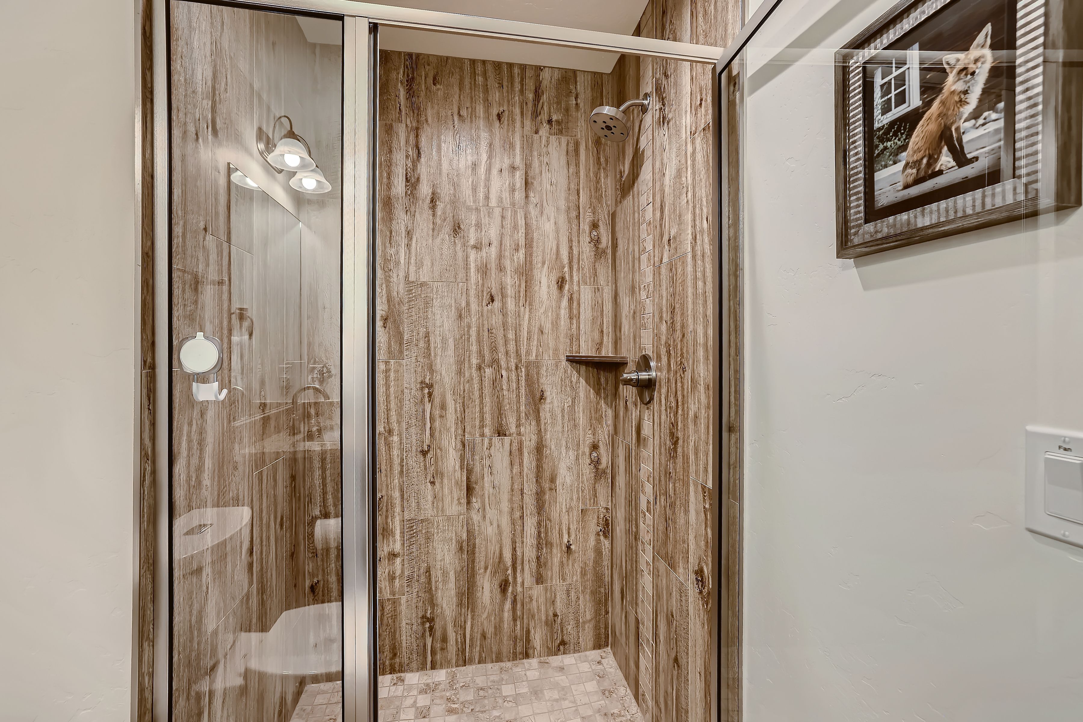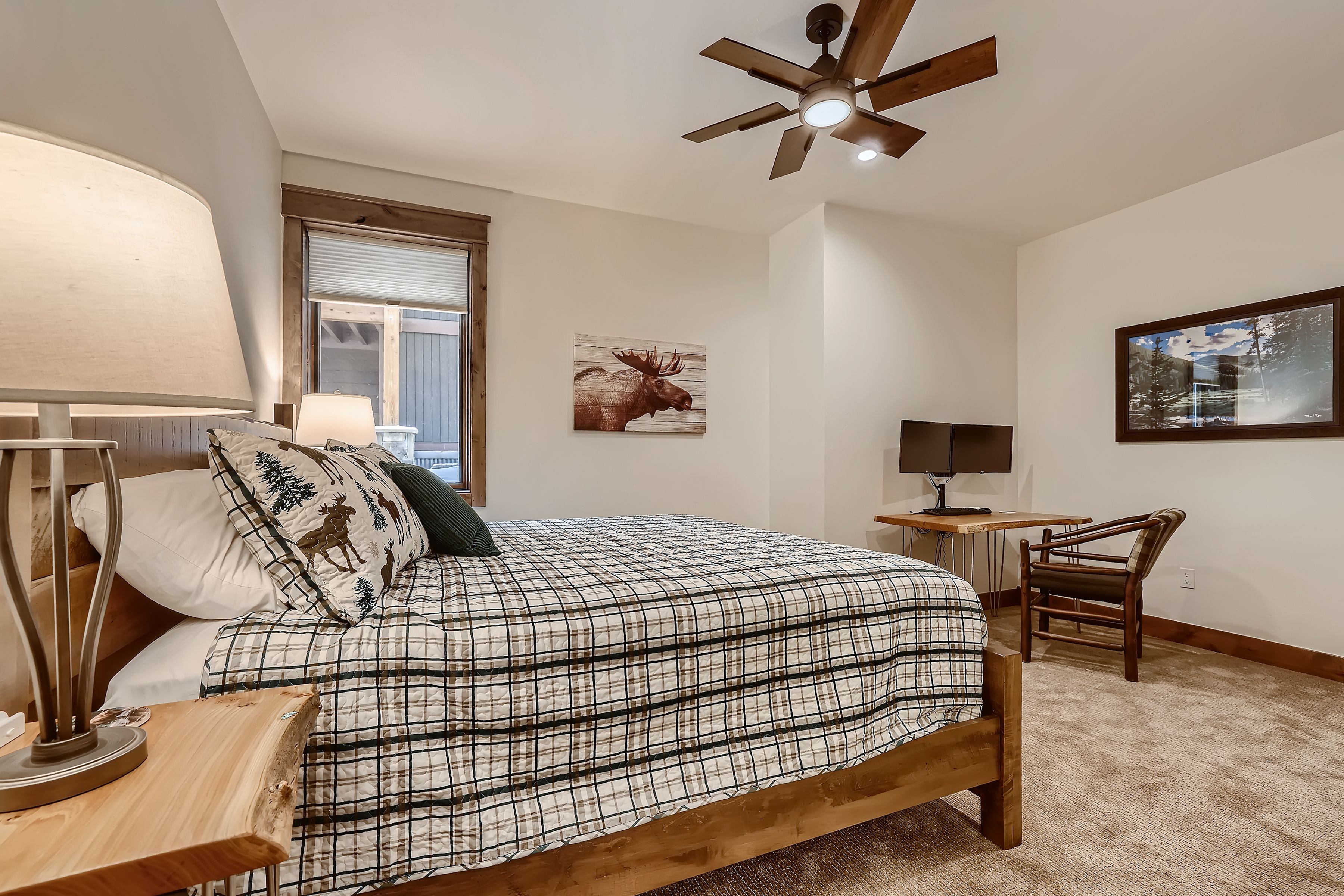 This 4-bedroom, 4.5-bathroom premium home is a fantastic retreat for families or groups of up to ten – and with three bedroom/suites with private bathrooms, it’s perfect for multiple couples/families to share! In the living area, you’ll find vaulted ceilings, large windows letting in great natural light, a floor-to-ceiling rock gas fireplace, a large flat-screen TV, and plenty of seating for trading stories after the day’s mountain adventures. The kitchen features beautiful counters, a pro-quality gas range, and plenty of high-end cooking gear. The dining table seats eight, and there’s room at the counter. Just outside, the deck features outdoor table seating and a gas grill!