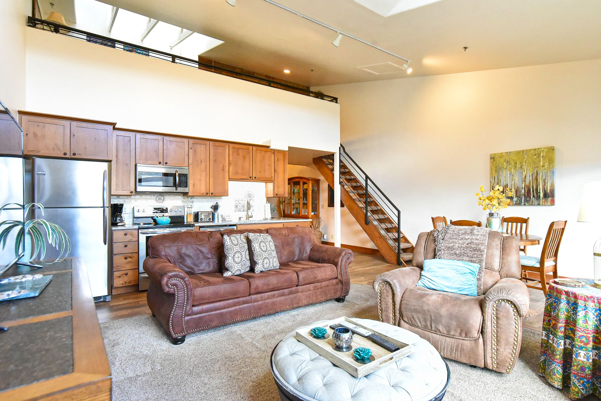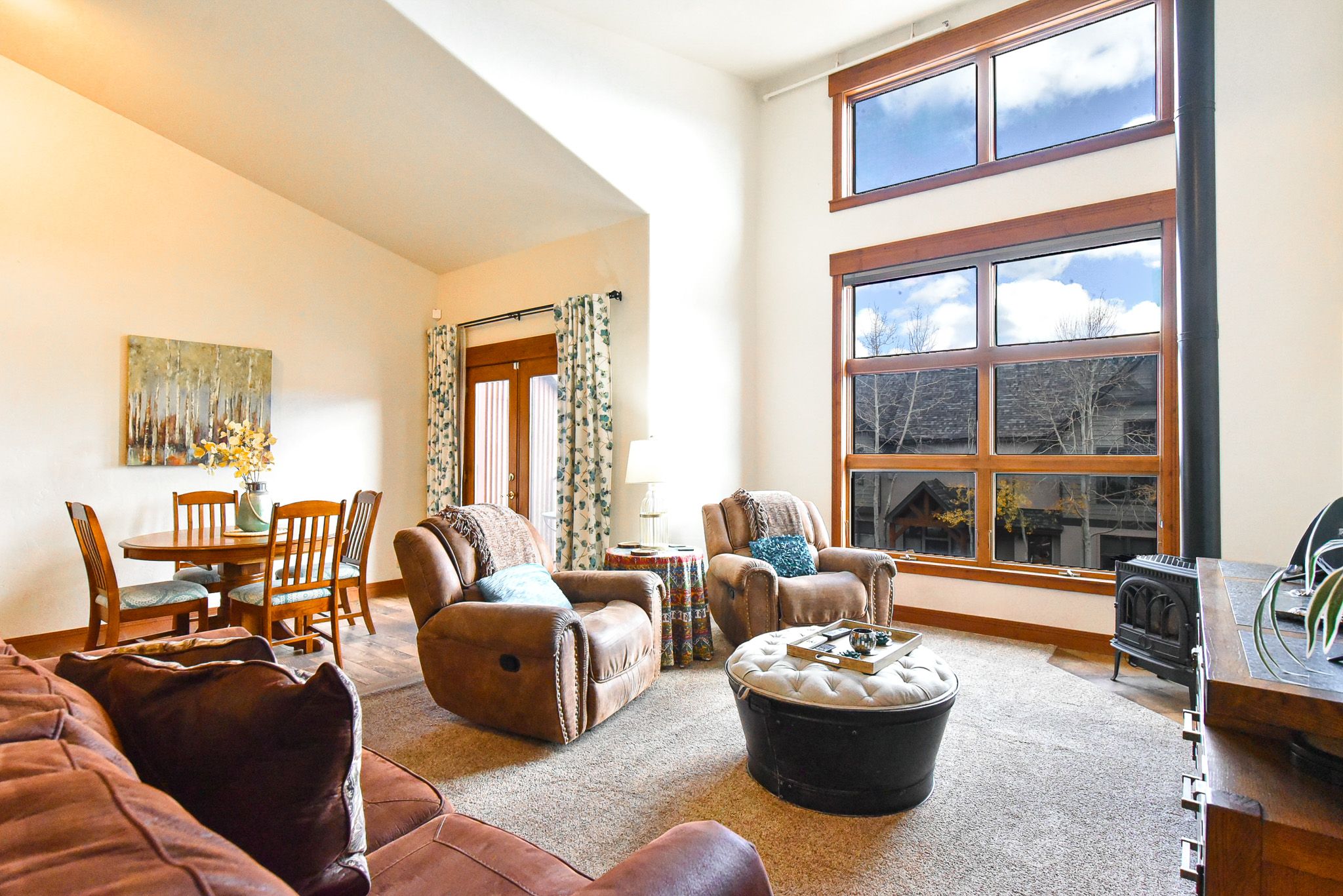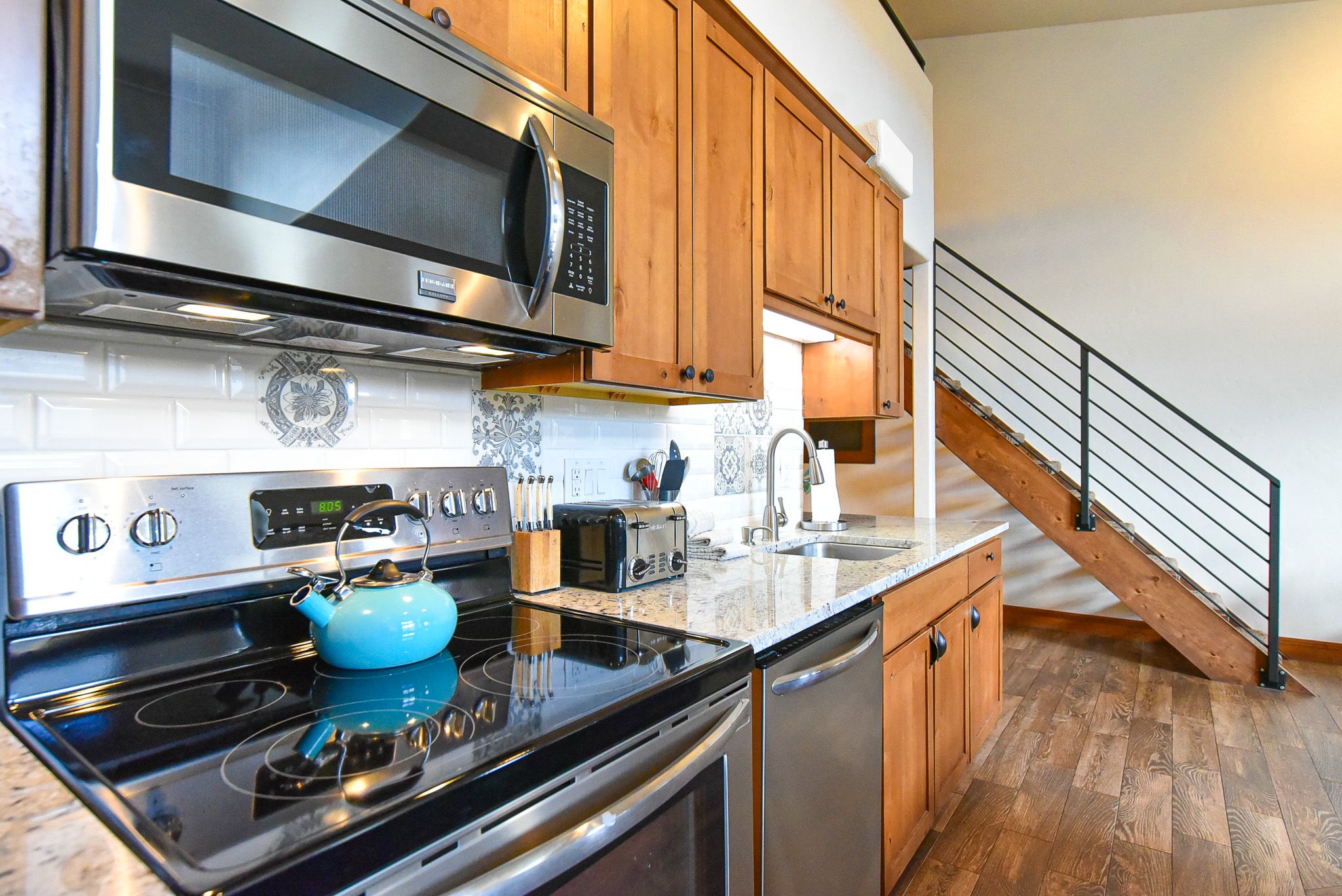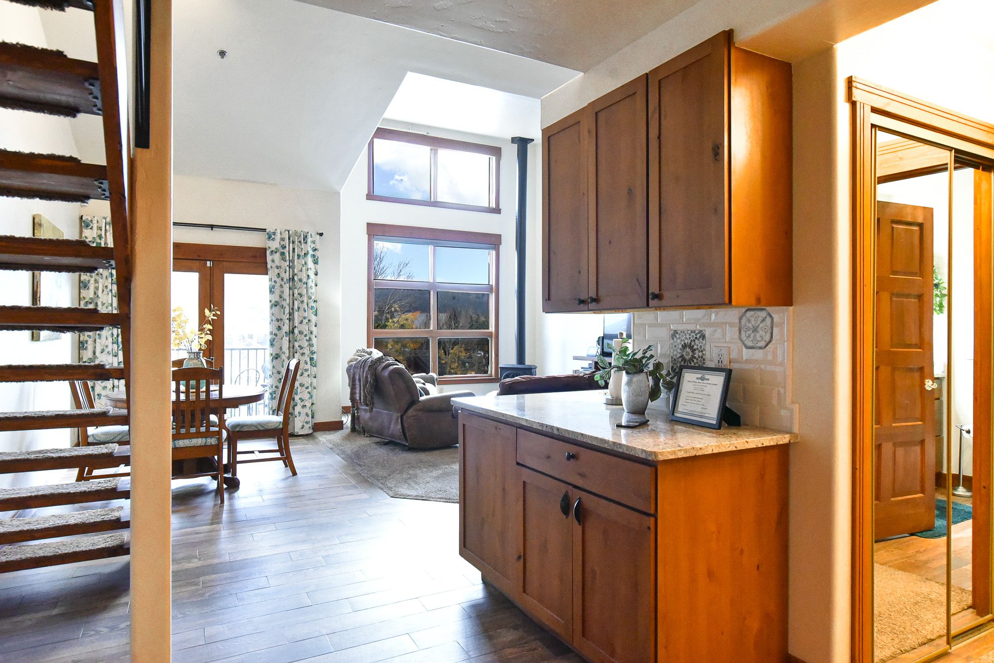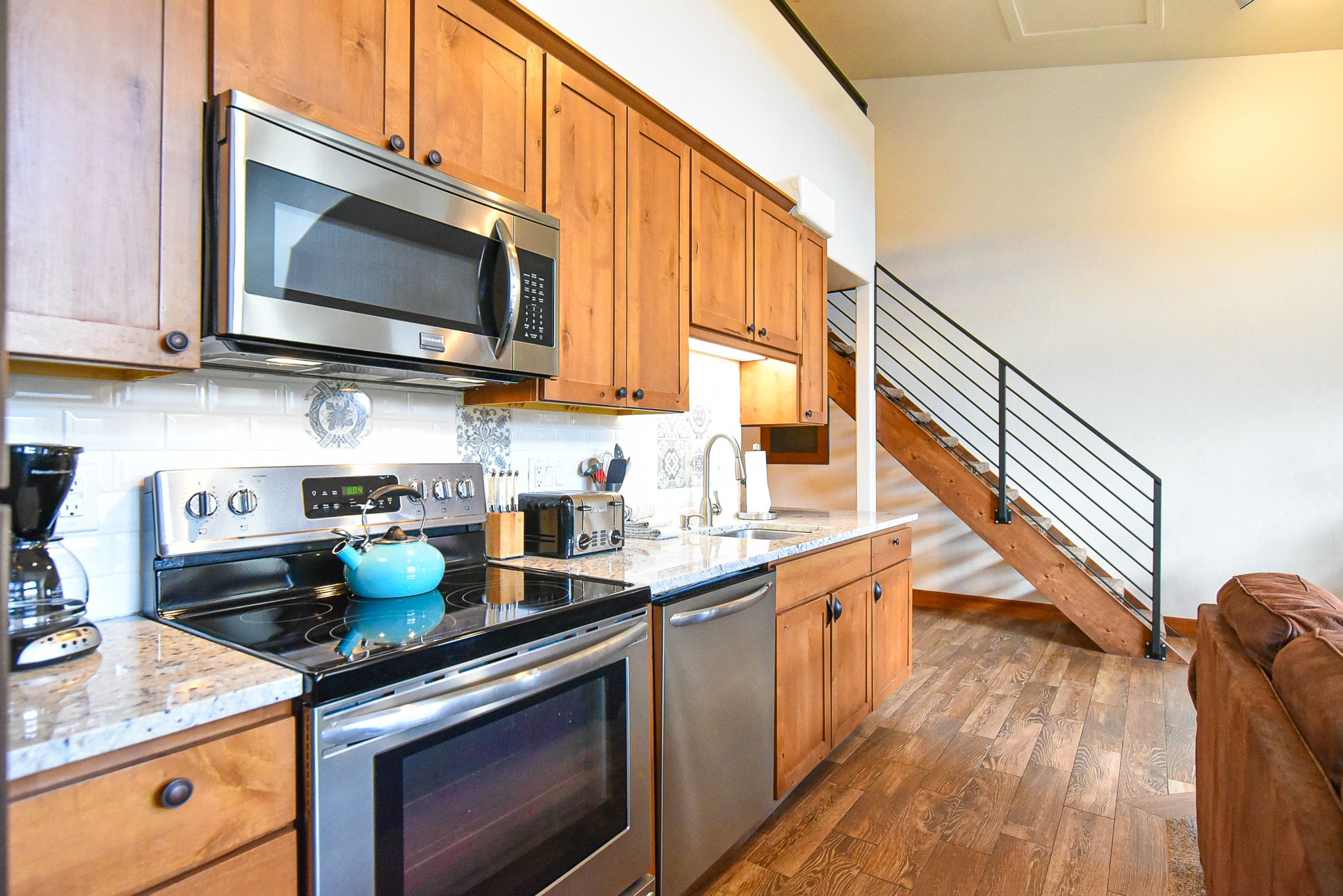 Inside, the top-floor condo feels bright and open, with floor-to-ceiling windows and a cozy gas fireplace creating a warm mountain ambiance. Relax in the inviting living area, take in the view from the small private patio overlooking Main Street, or gather around the dining table for a meal after a day of adventure. The full kitchen is compact yet well-equipped, featuring stainless steel appliances, granite counters, and everything you’ll need to prepare a hearty breakfast or casual dinner.