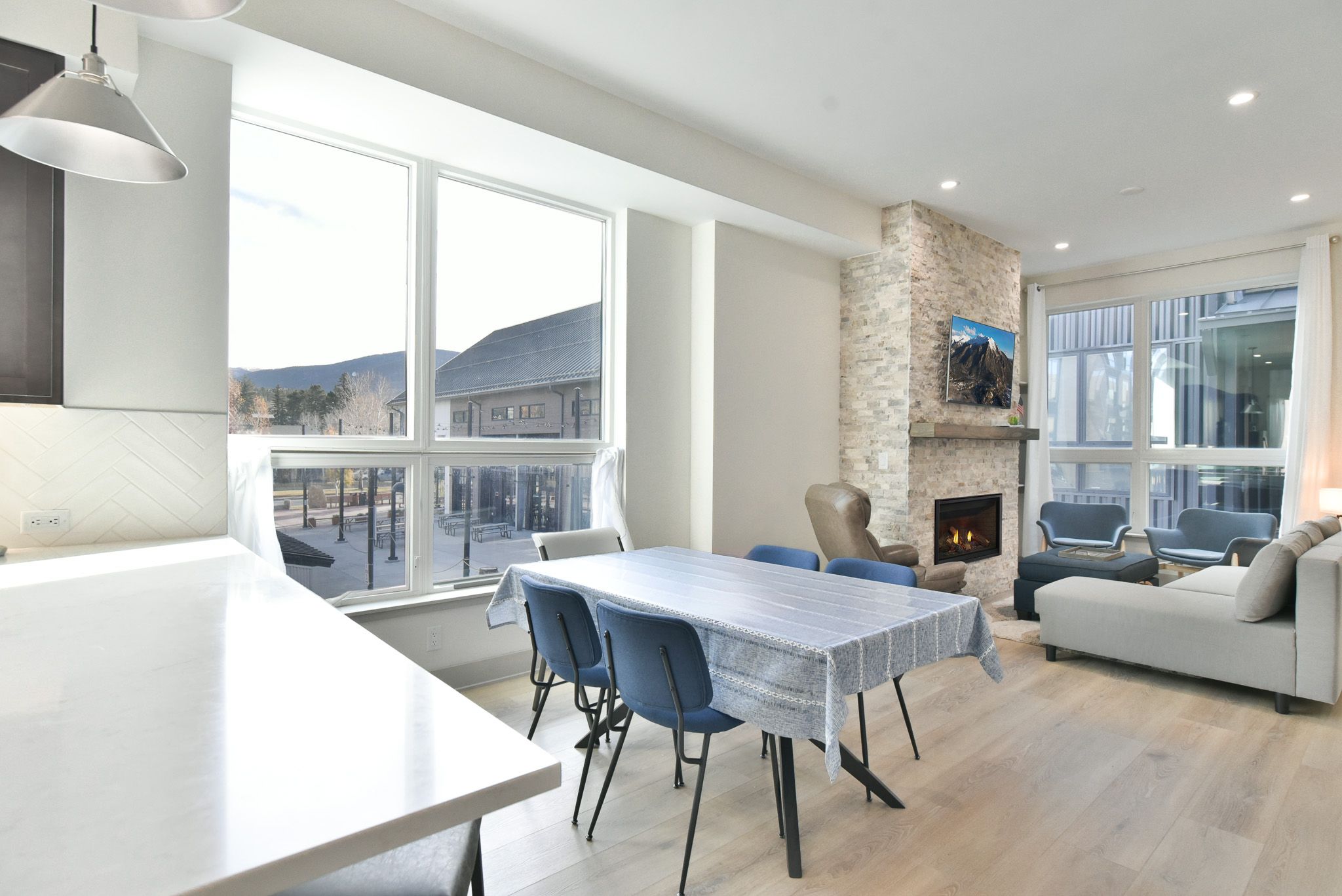Fourth Street Crossing Summit Townhome is a 2-bedroom, 2.5-bath premium corner-unit townhome that’s an excellent choice for groups of up to six guests. The living area features high ceilings and large windows for a spacious, airy feel. There’s comfy seating, a floor-to-ceiling rock gas fireplace, and a large flat-screen smart TV as well. The gorgeous kitchen has large marble counters, stainless-steel appliances (including a gas range), extensive cookware choices, and there’s seating for six at the dining table and three at the counter.