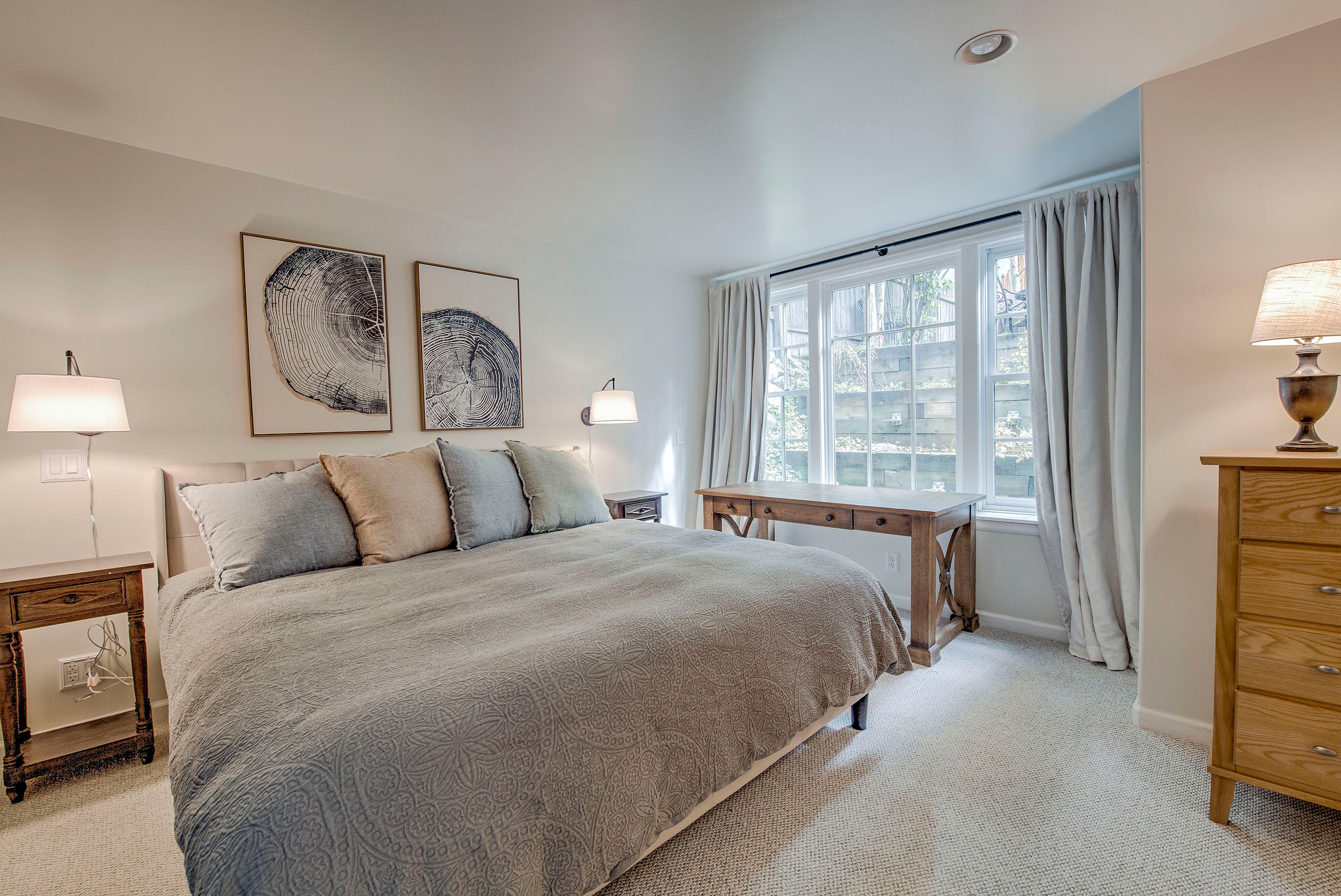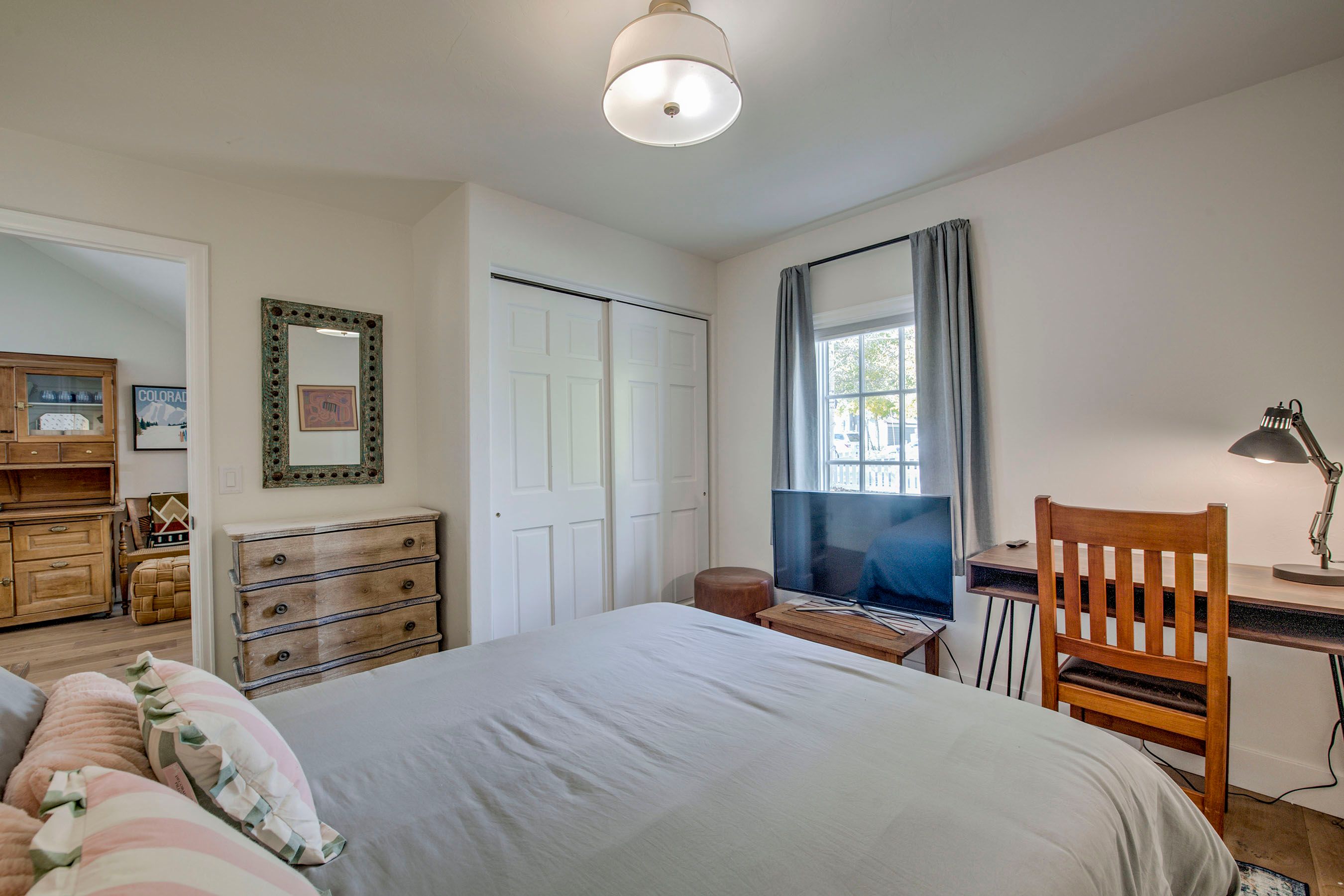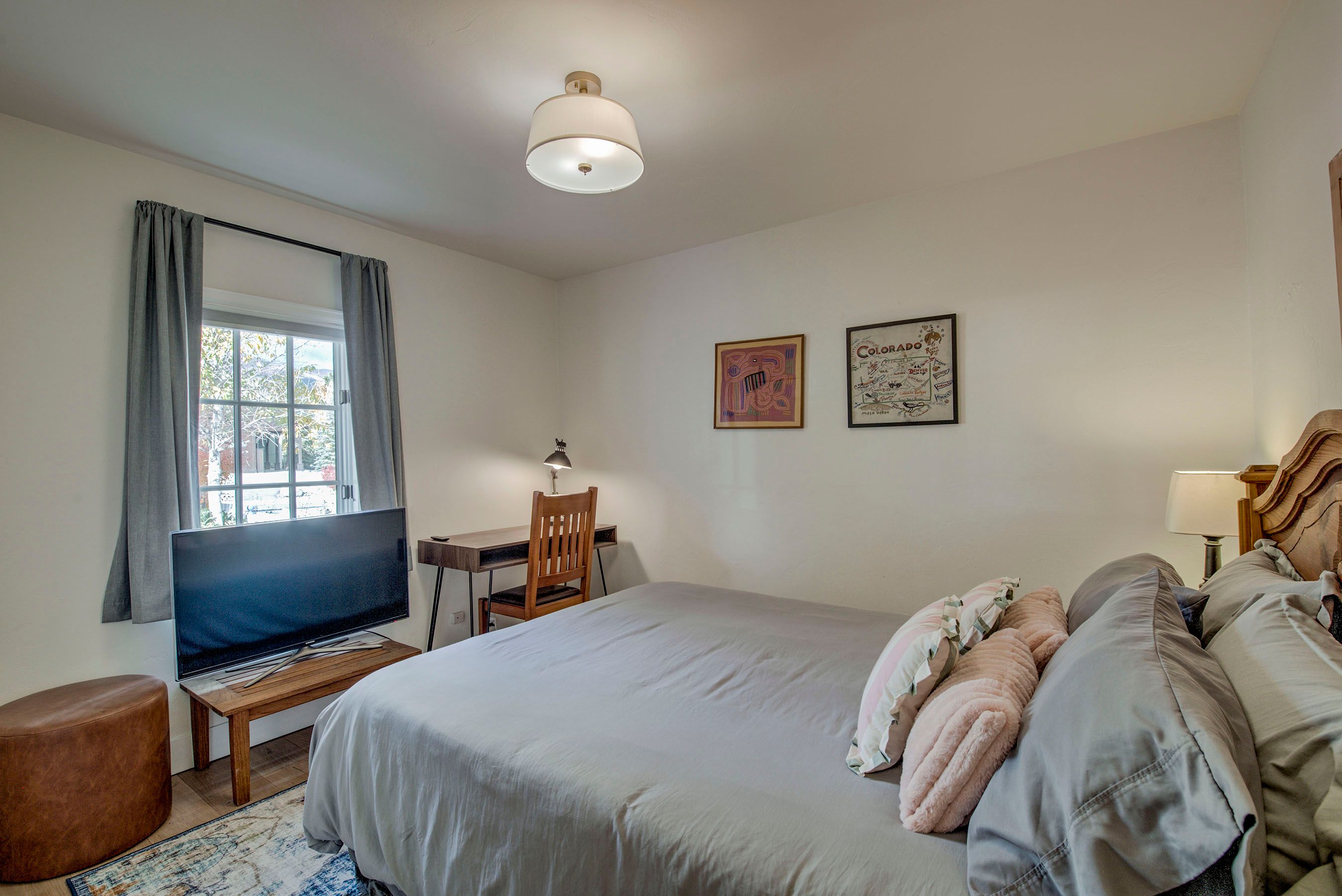 • Queen Bedroom: Queen Bed, Smart TV, Desk/Workstation. (Sleeps 2)
