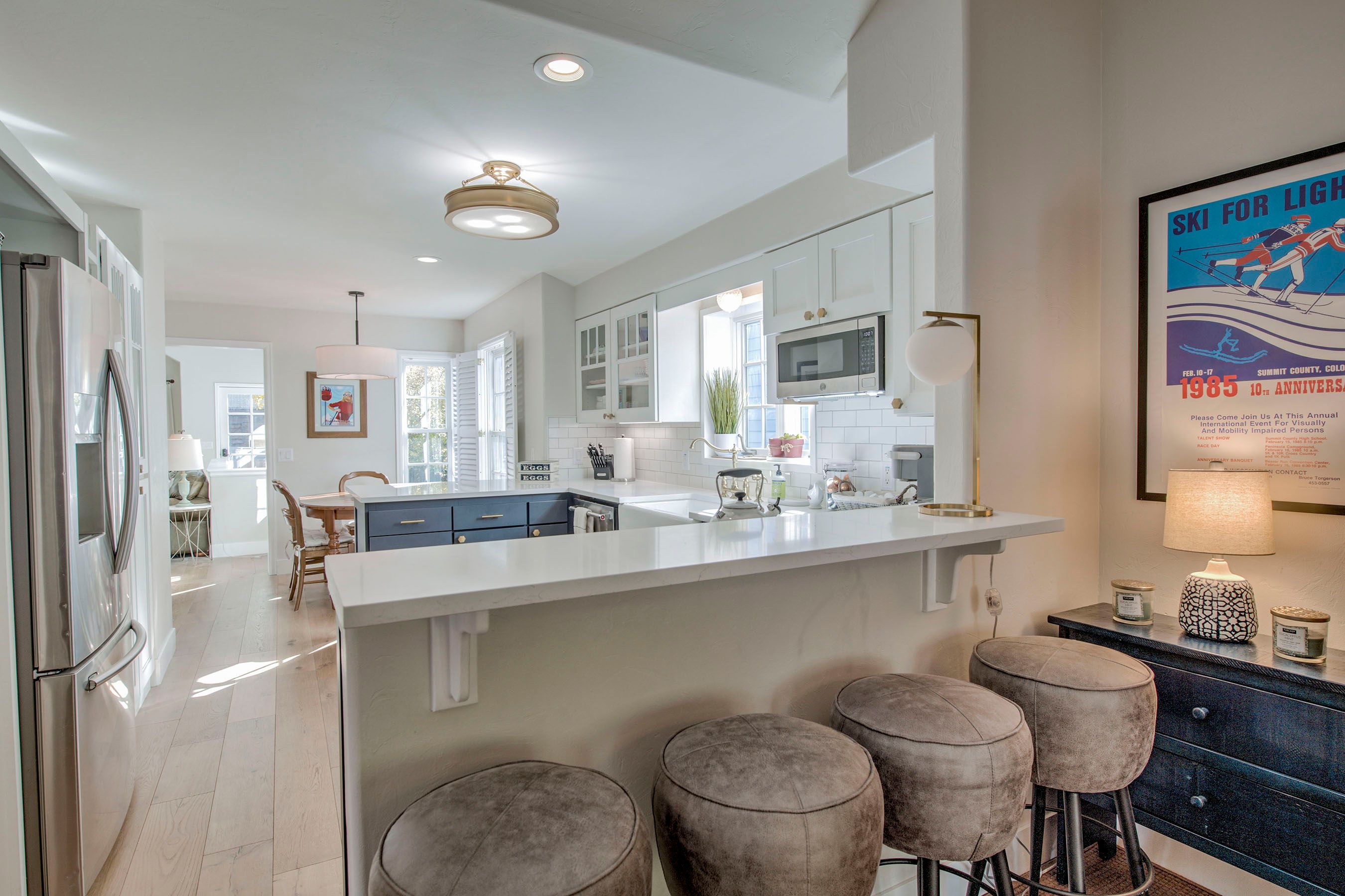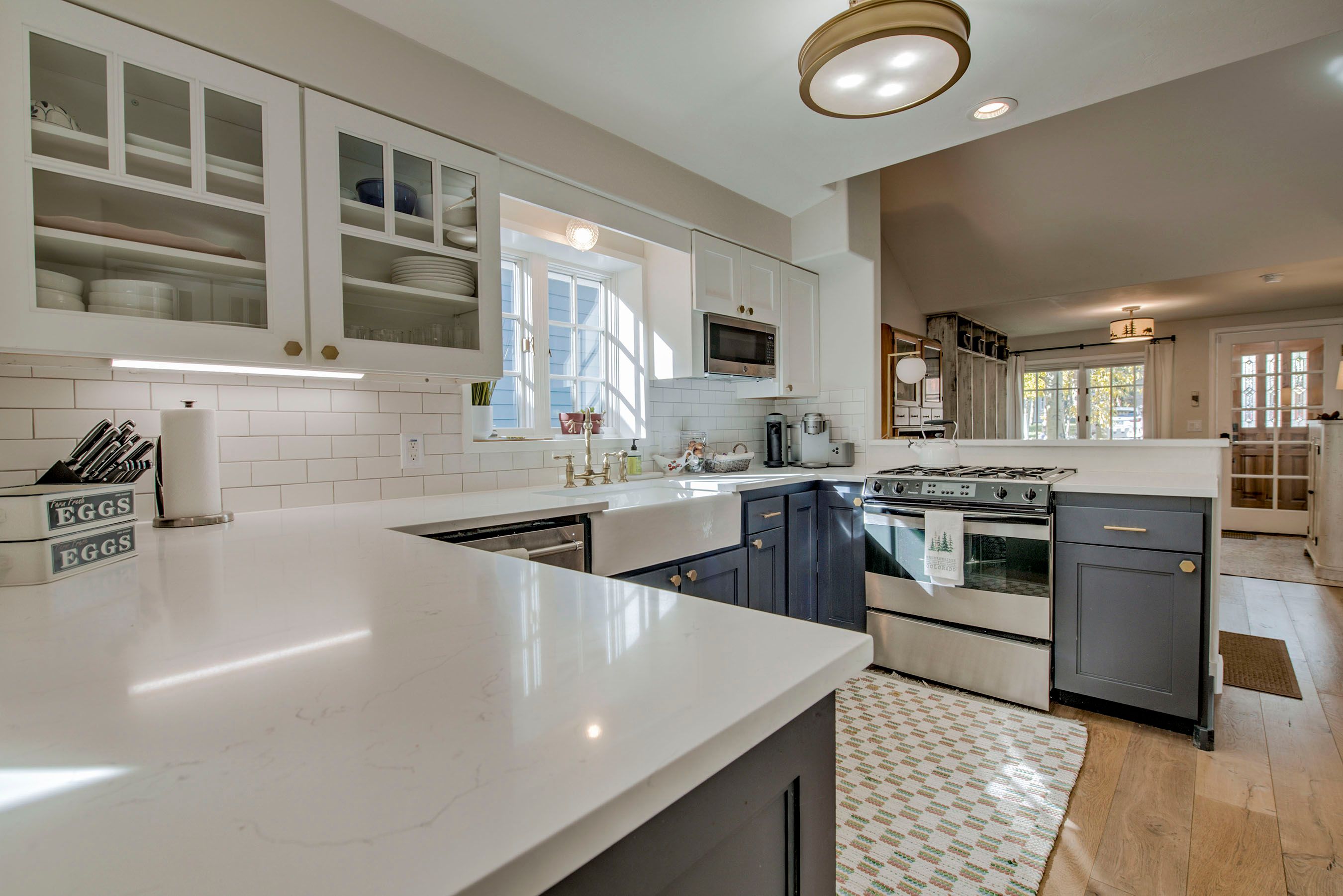 The kitchen is equally impressive, designed with both function and style in mind. Granite countertops, stainless steel appliances, a gas range, and generous prep space make it easy to cook everything from quick breakfasts to full dinners at home. There’s seating at both the dining table and breakfast bar, and just beyond the kitchen you’ll find a thoughtfully designed gear storage area with built-in cubbies to keep everything organized after a day of exploring.