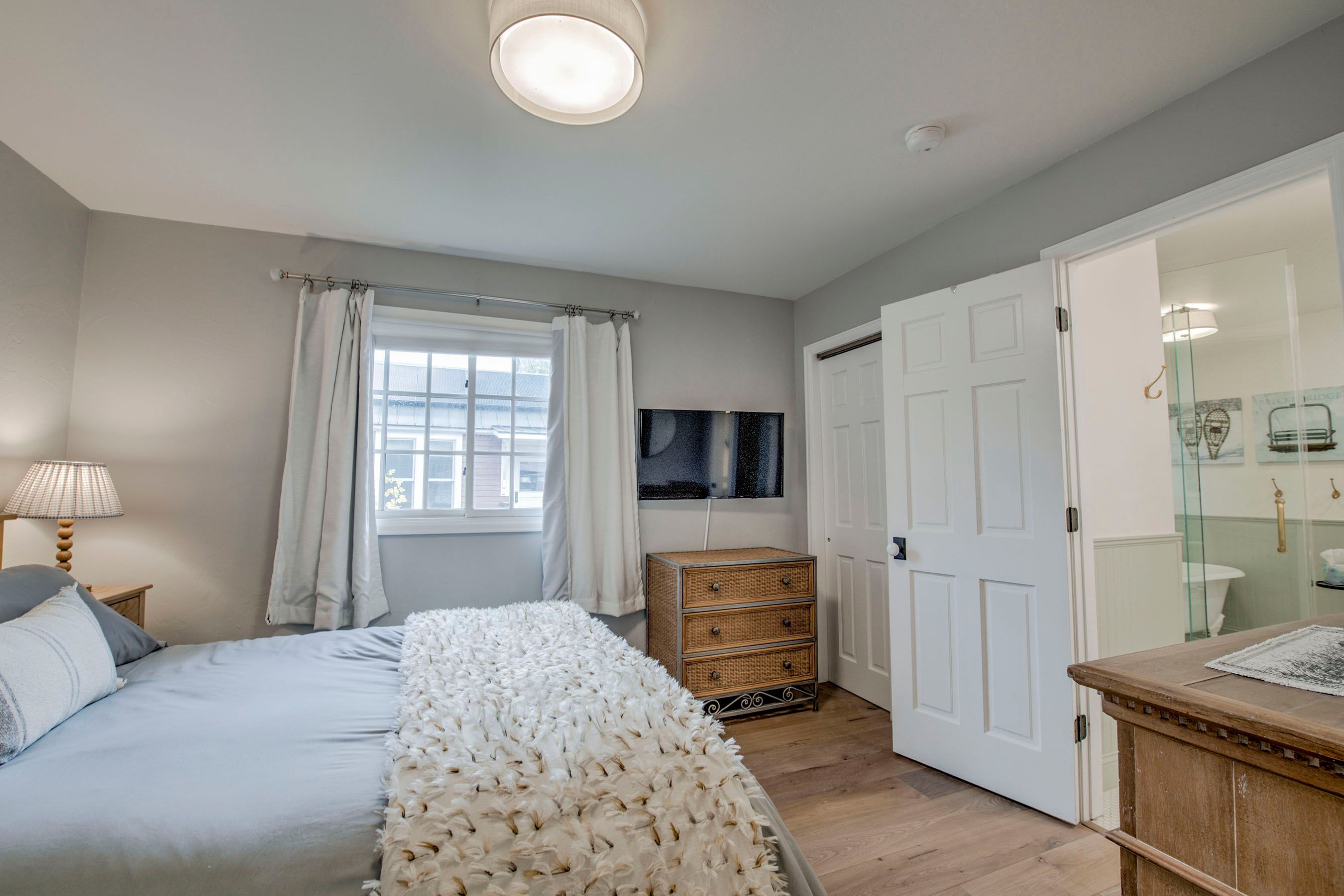 • Queen Suite: Queen Bed, Smart TV, En-Suite Bathroom, Walk-In Tile Shower & Large Soaking Tub. (Sleeps 2)