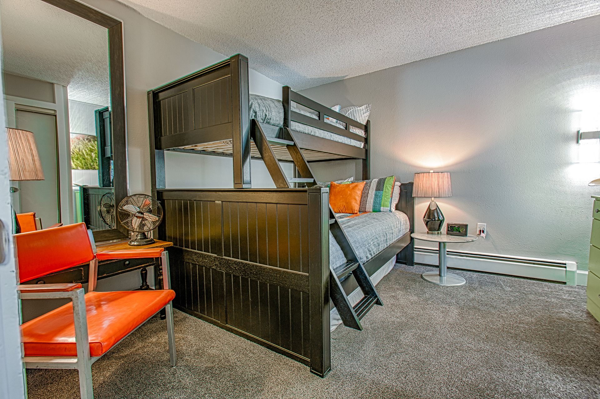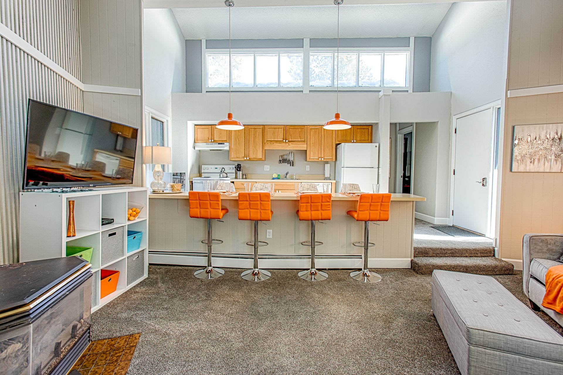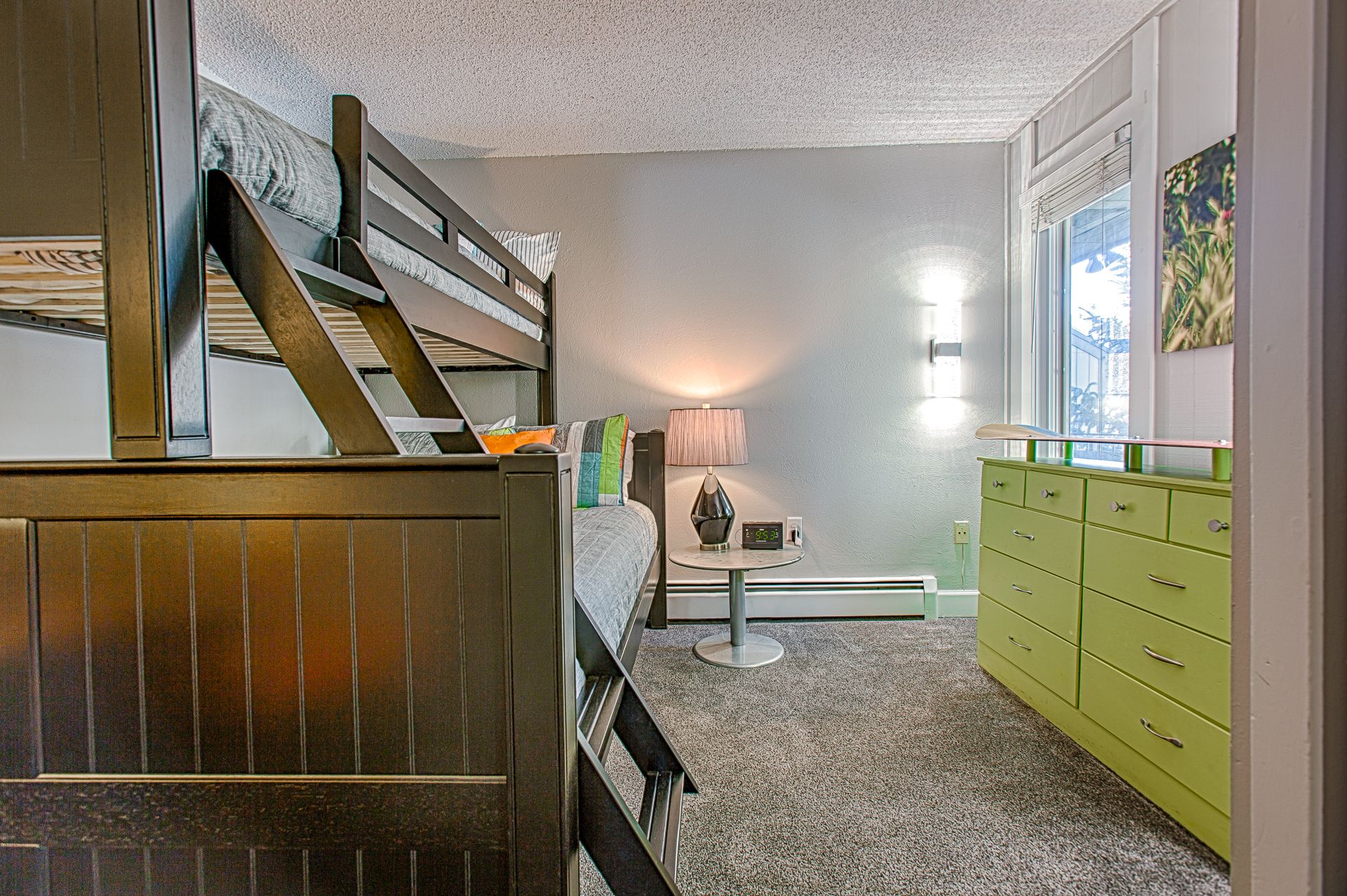 This 2-bedroom, 1-bathroom condo is a great choice for up to seven guests. The living area is bright and spacious, with plenty of seating and a large wall-mounted flat-screen TV for catching the game or your favorite shows. There’s a fully equipped kitchen with a huge bar that seats eight. You’ll also enjoy the deck off the living area for kicking back after a big day on the slopes or letting the mountain breeze flow through the condo.