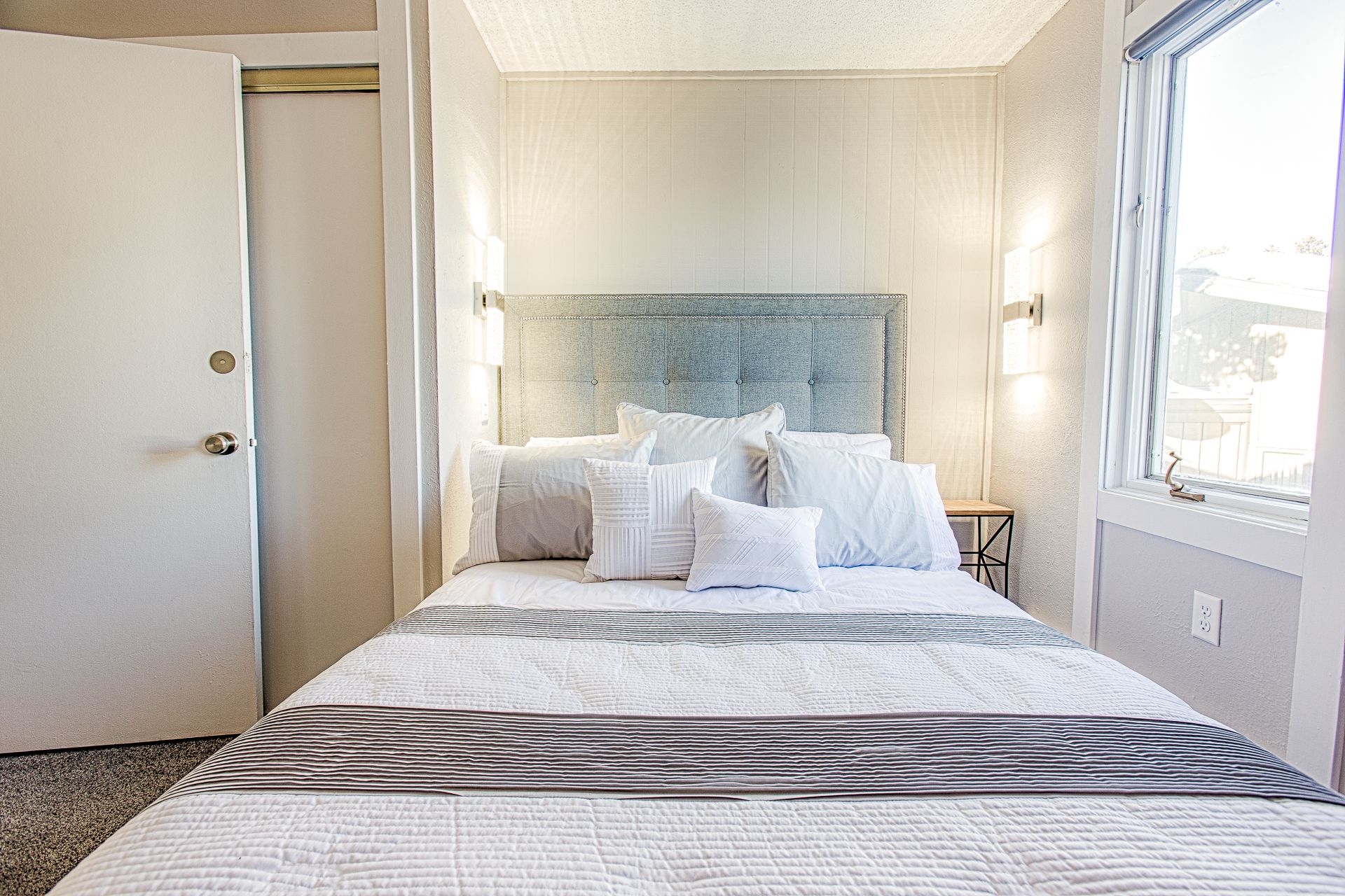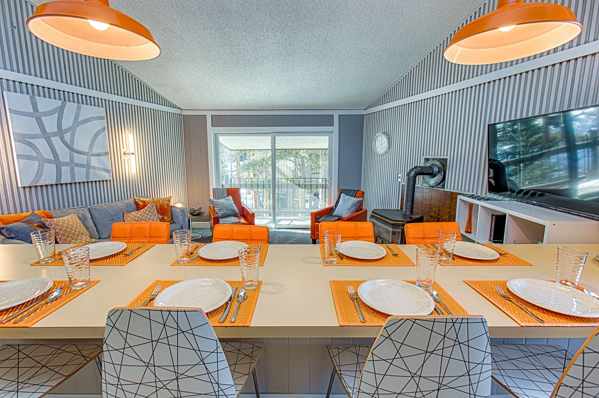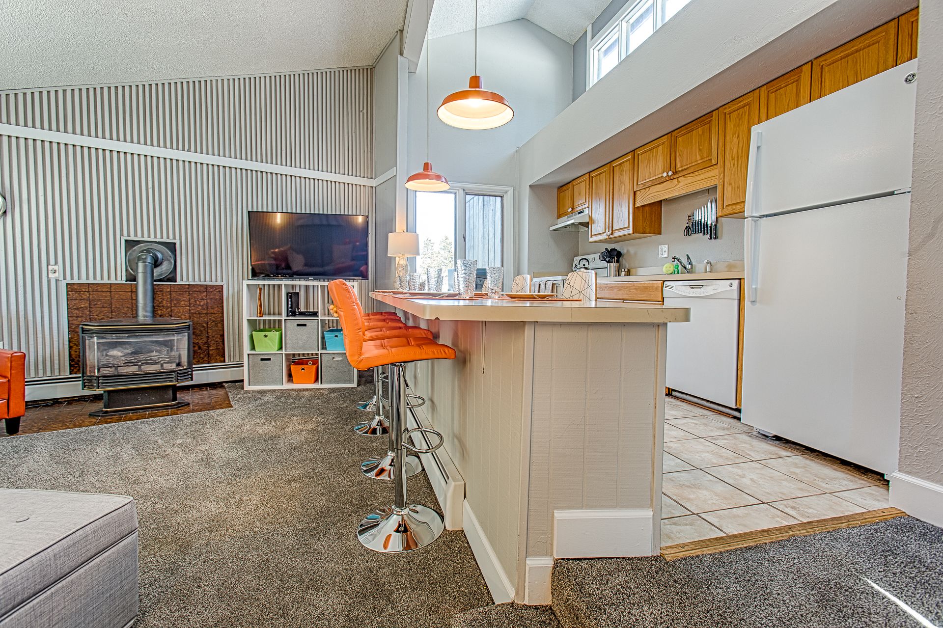 This 2-bedroom, 1-bathroom condo is a great choice for up to seven guests. The living area is bright and spacious, with plenty of seating and a large wall-mounted flat-screen TV for catching the game or your favorite shows. There’s a fully equipped kitchen with a huge bar that seats eight. You’ll also enjoy the deck off the living area for kicking back after a big day on the slopes or letting the mountain breeze flow through the condo.
