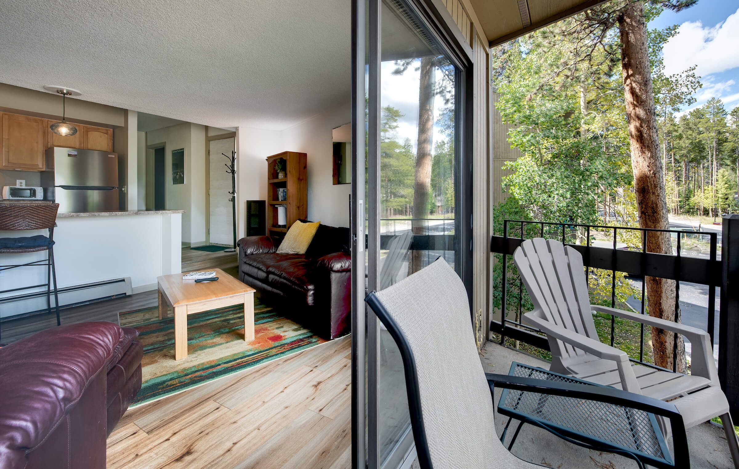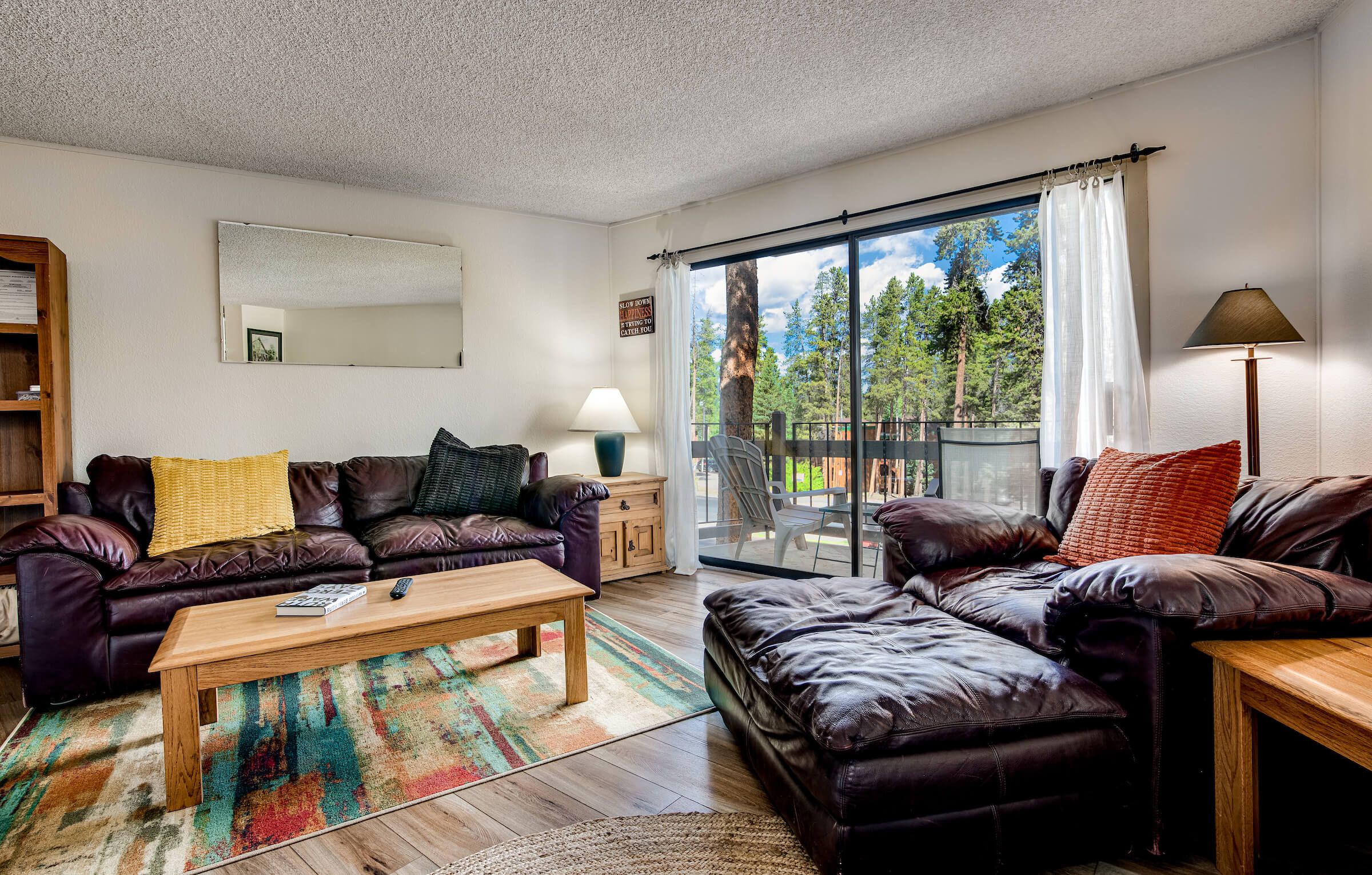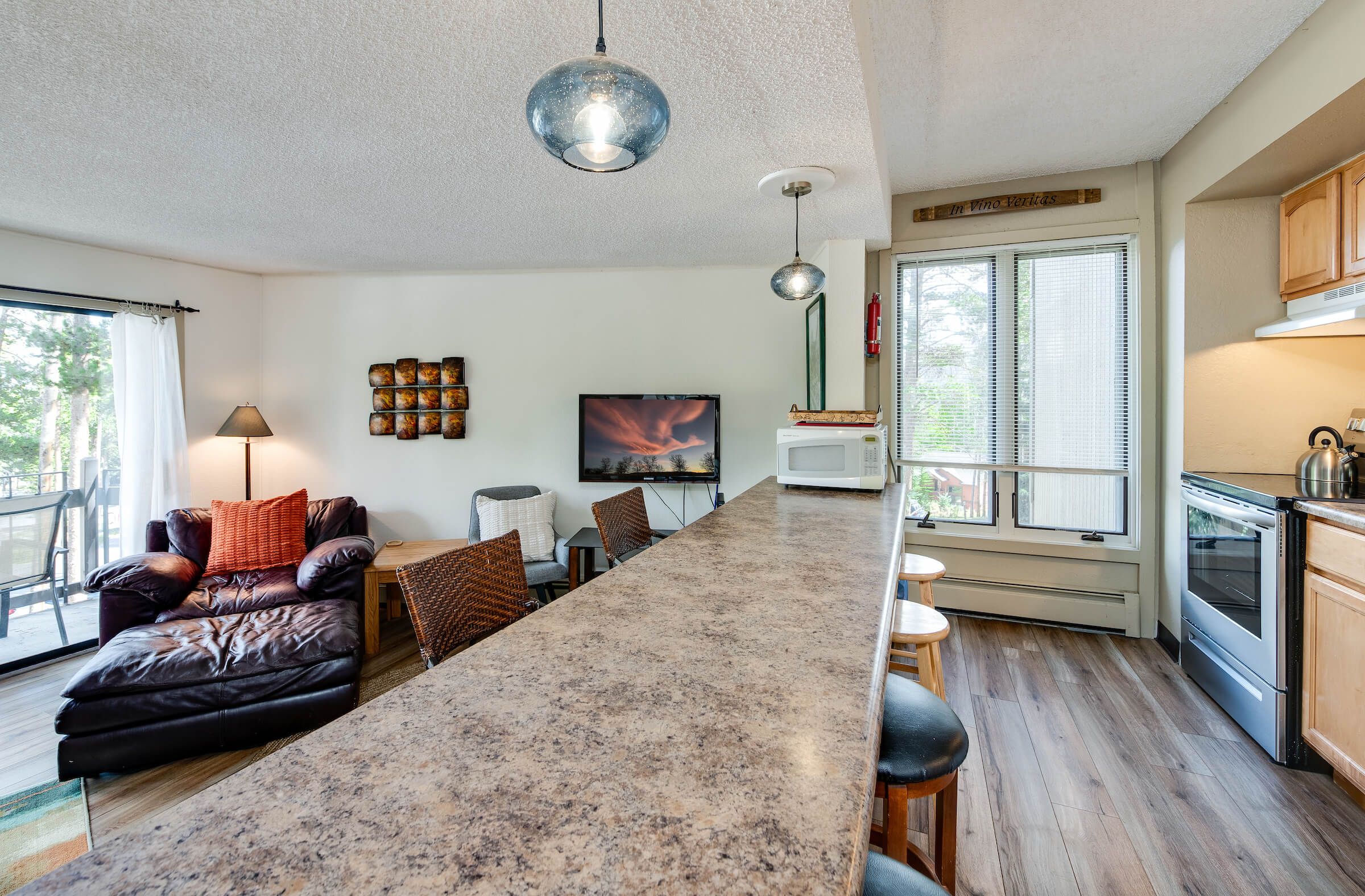 This 2-bedroom 1-bathroom condo works perfectly for groups of up to four. The living area is bright and inviting, with plenty of seating and a wall-mounted flat-screen TV for catching the game or the morning snow report. There’s a fully equipped kitchen with lots of counter space and seating for four at the bar; you’ll also enjoy the patio for kicking back after a big day on the slopes.Â