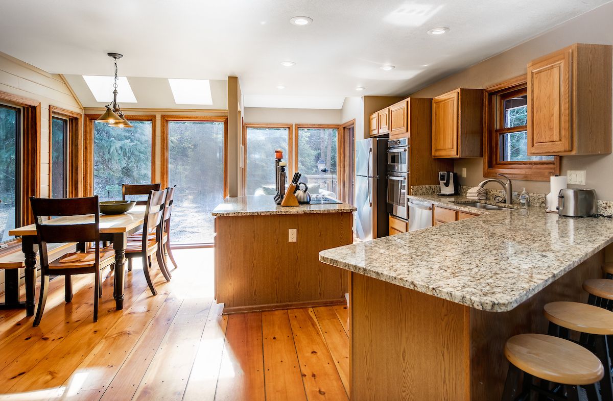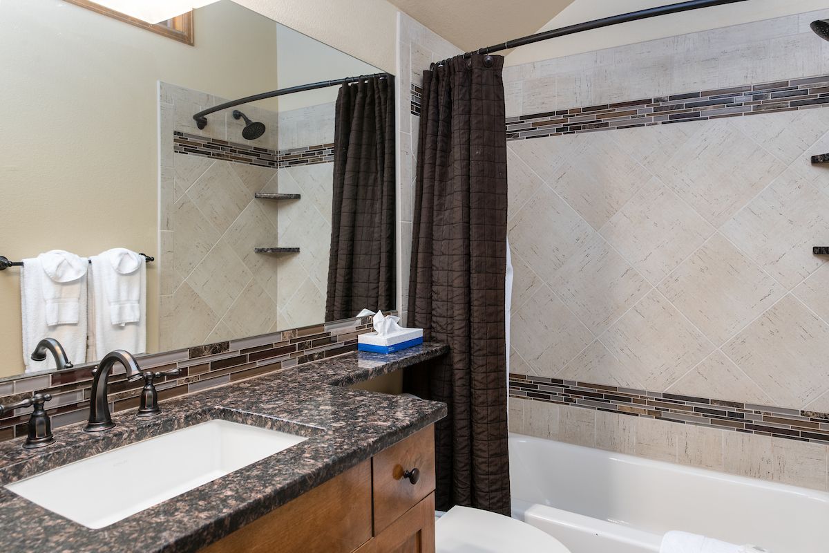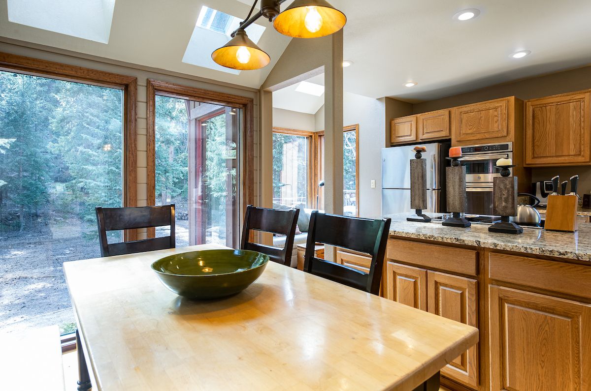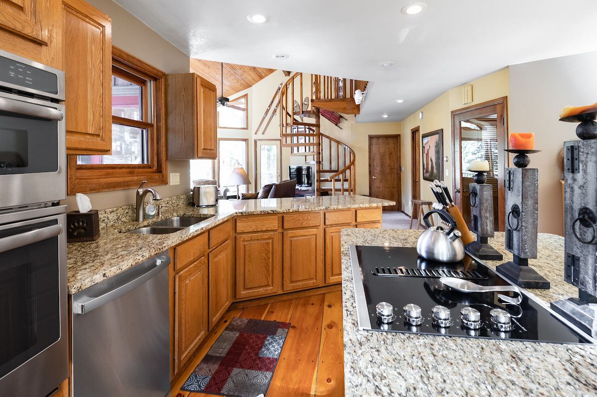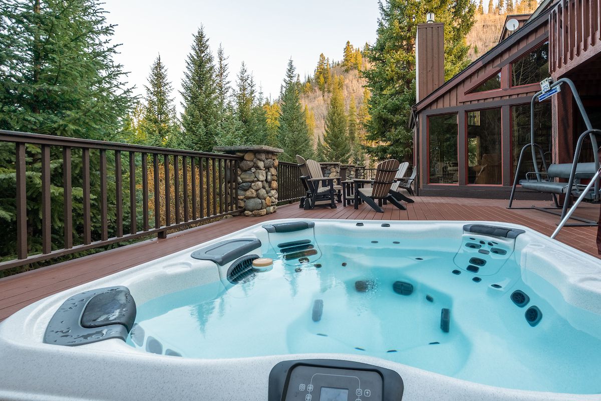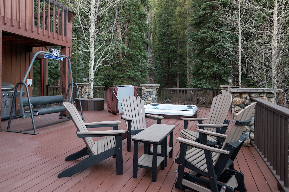 The kitchen features granite counters, stainless-steel appliances, and all the gear you’ll need to whip up memorable mountain meals for everyone in your group. The dining table seats six, and there’s room for four more at the counter. Just off the living area is a large deck that allows you to enjoy the beautiful setting of this home. There’s plenty of seating, a gas grill for barbequing and, of course, a large private hot tub!Â