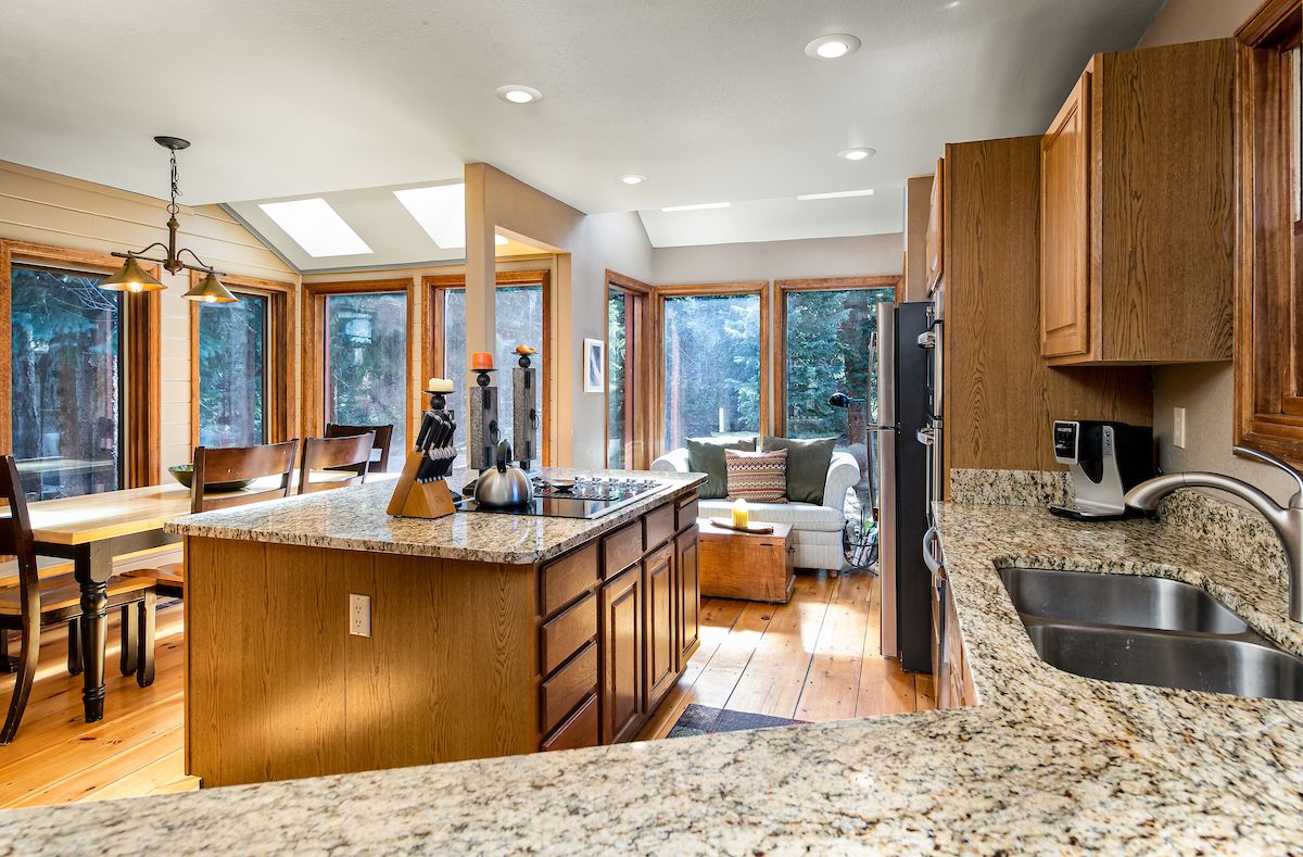 Heartstone Hideaway is a 3-bedroom, 3-bathroom deluxe private home that comfortably accommodates up to 10 people. Located just five minutes from Downtown Breckenridge and the slopes at Breckenridge Ski Resort, this traditional mountain home offer comfort and great amenities. The living area is spacious, with vaulted ceilings and large windows letting in the forest light. There’s also gas fireplace and a flat-screen TV for catching a movie or the morning snow report.Â