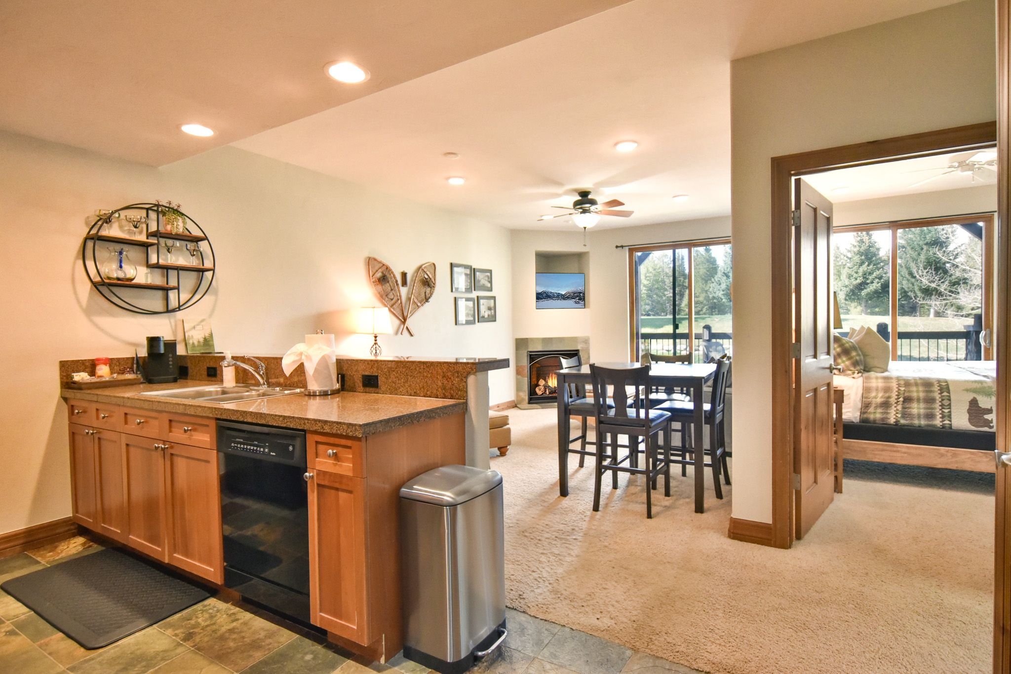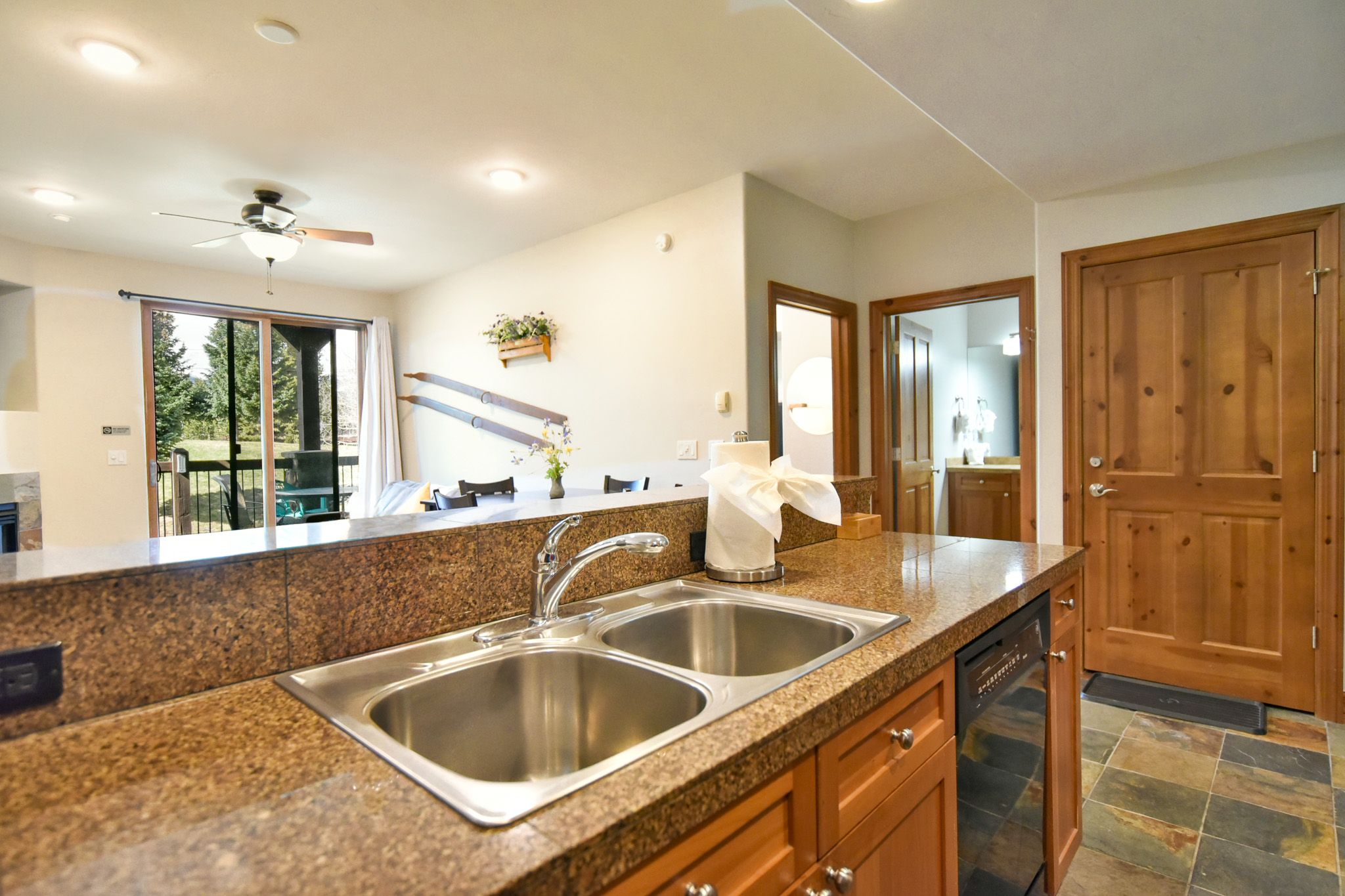 Inside, the condo boasts a spacious layout designed for relaxation. The living area features a gas fireplace, ideal for unwinding after a day on the mountain, along with a dining table and access to a private patio complete with outdoor seating. The fully equipped kitchen includes granite countertops, newer appliances, and a breakfast bar with additional seating—perfect for cooking up a hearty meal before heading out on your next adventure.