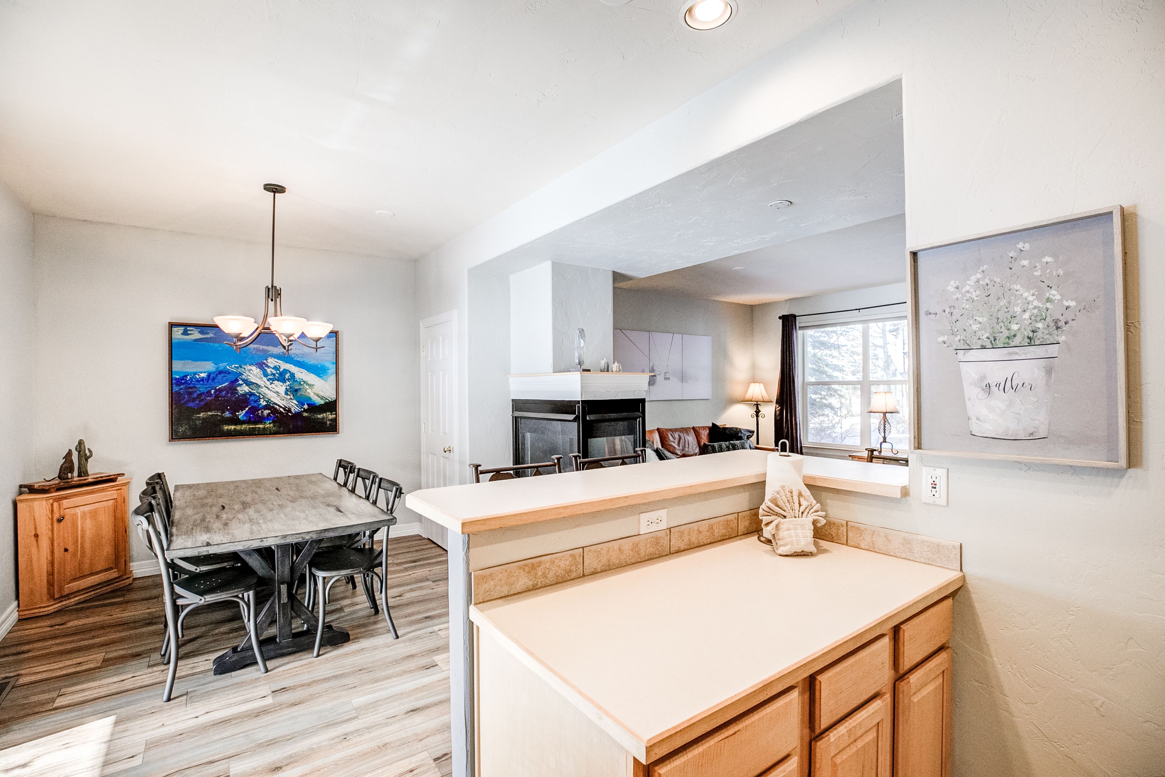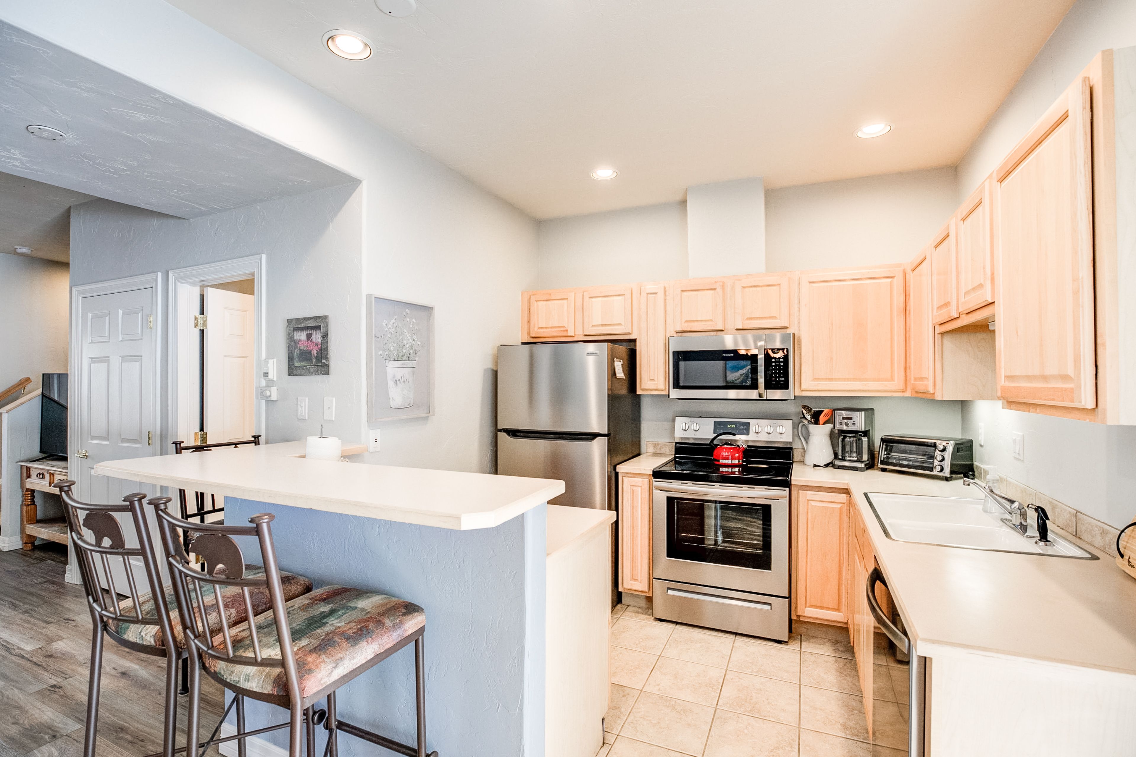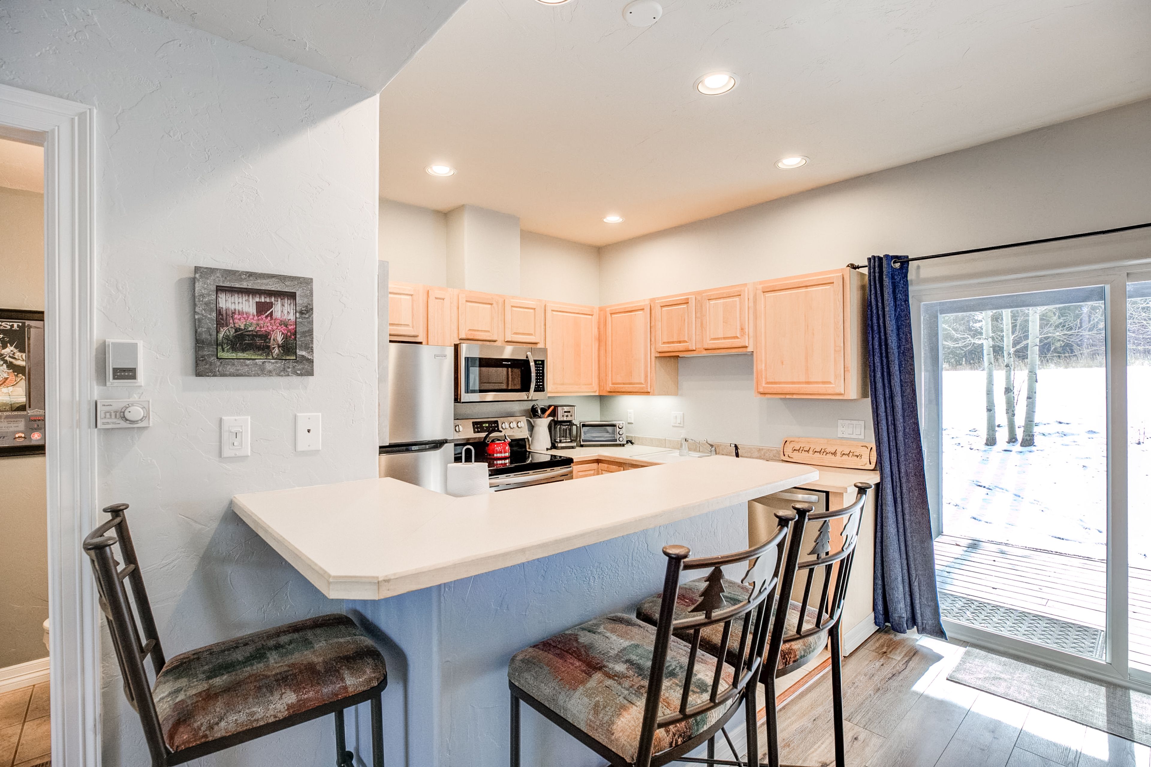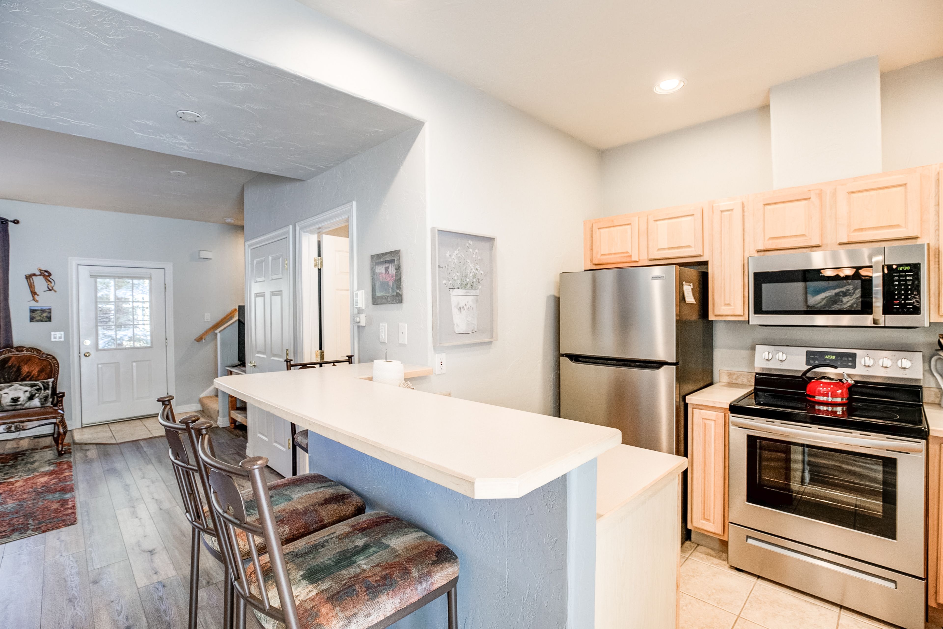 This 3-bedroom, 2.5 townhome is an excellent choice for families and groups up to eight. The living area features a gas fireplace, a flat-screen TV and plenty of seating for relaxing, conversation and movies. The kitchen features stainless-steel appliances, lots of counter space, and all the gear you’ll need to whip up après-ski snacks or memorable mountain meals. There’s a comfortable dining table that seats six, plus room for three more at the counter. Just off the kitchen, there’s a patio with seating and a gas grill.