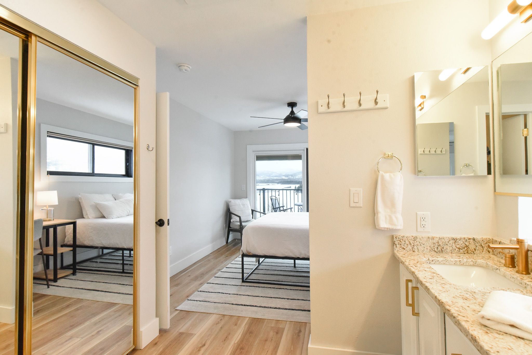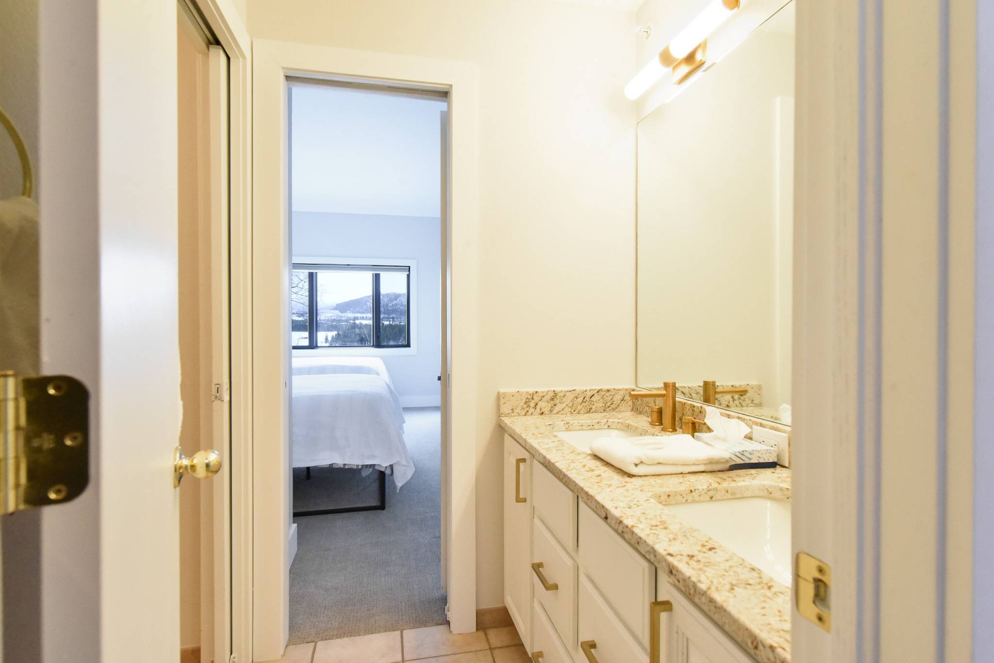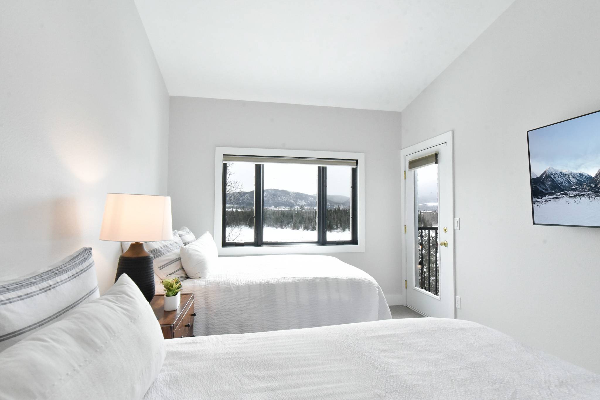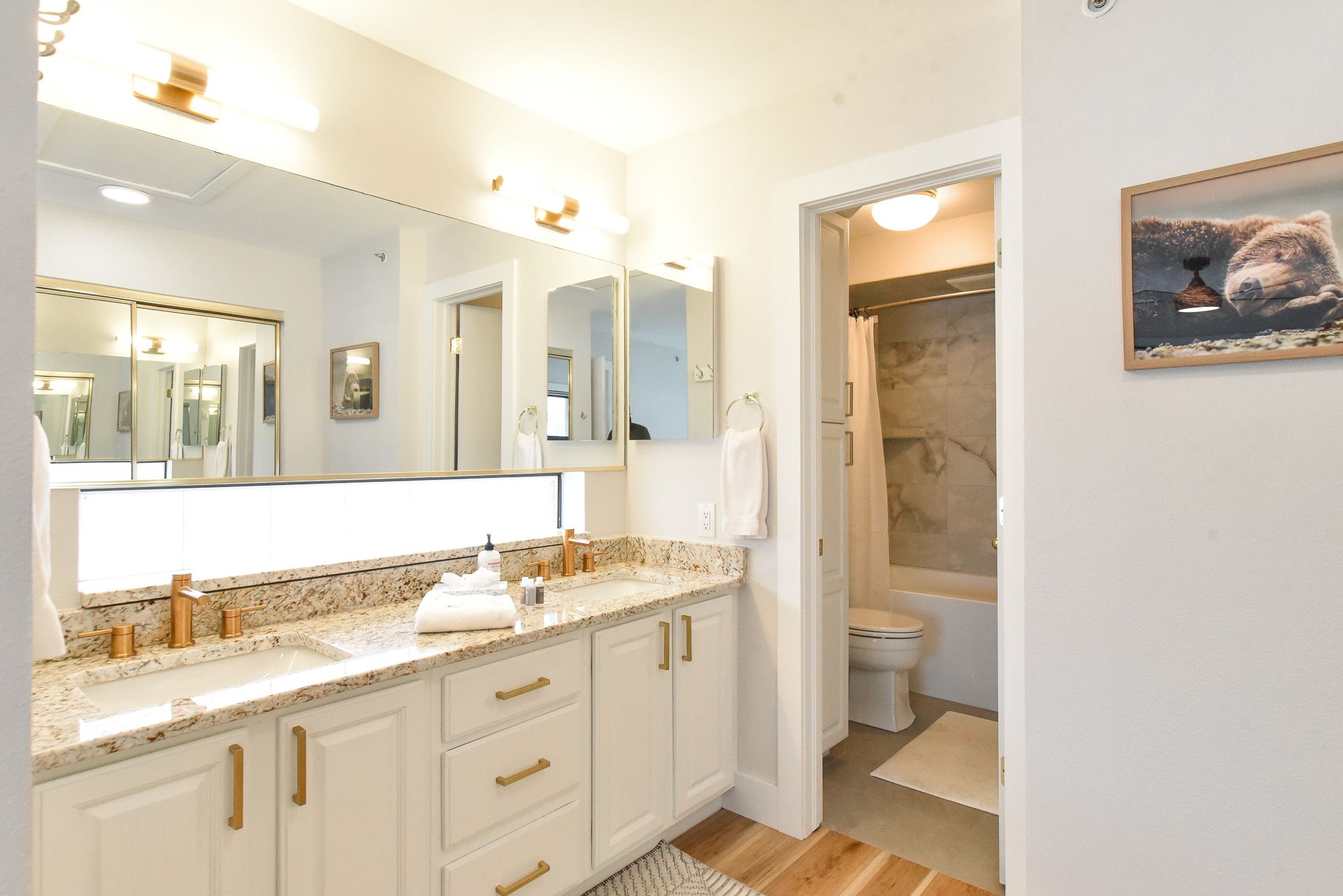 This condo is perfectly suited for families or groups, with dual master suites on the main level. One suite offers a queen bed, ensuite bathroom, direct patio access, and a dedicated desk area for remote work. The second suite includes two queen beds, patio access with lake and mountain views, and a spacious ensuite with dual vanities. Upstairs, the loft provides an additional queen bed and a third full bathroom with a walk-in tiled shower, offering both comfort and privacy for every guest.