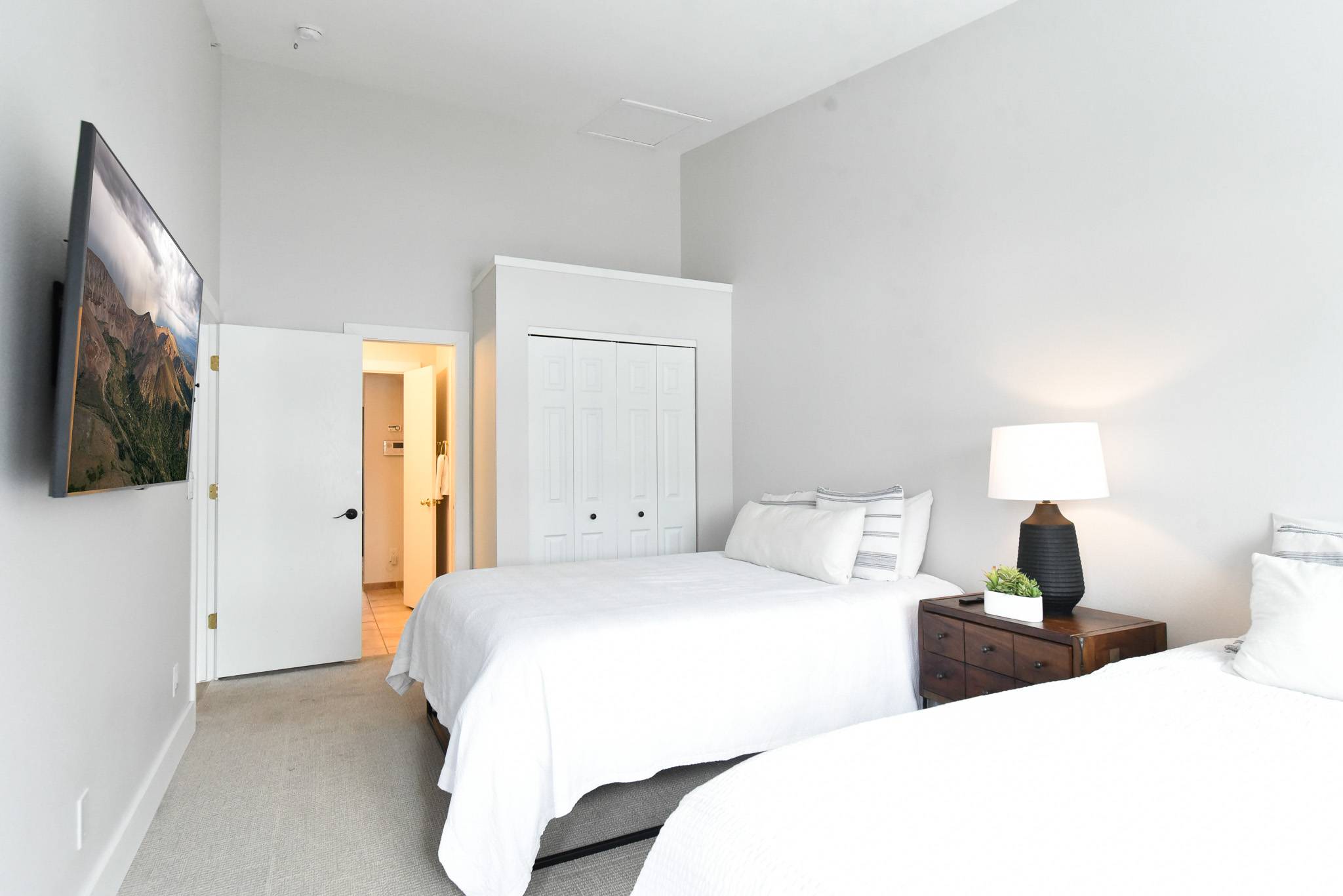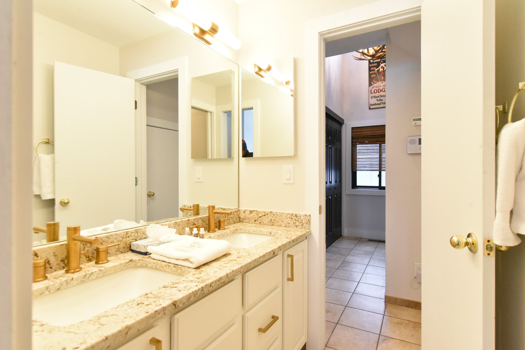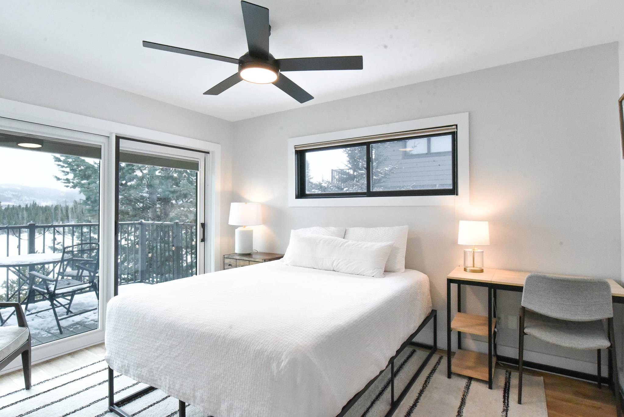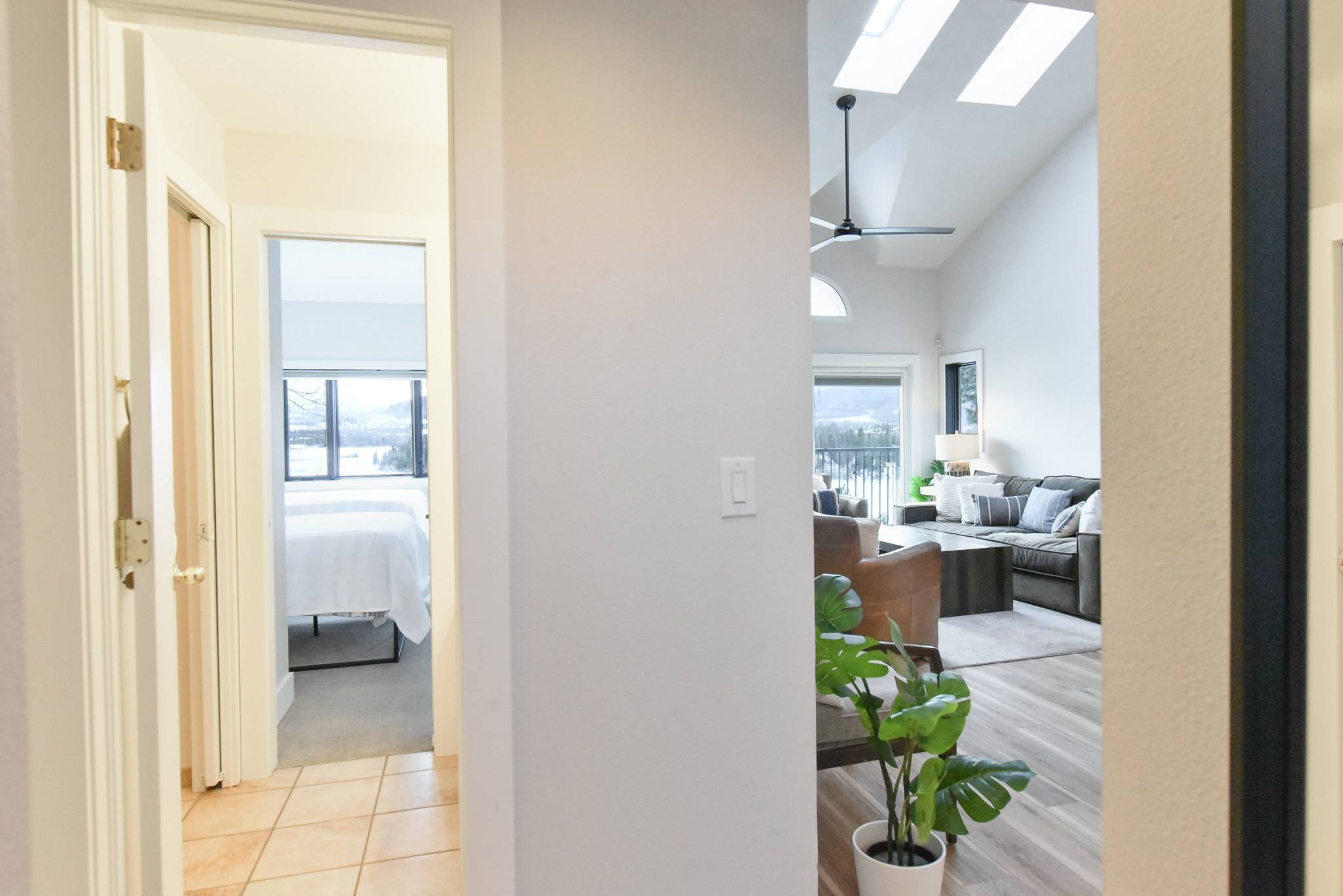 This condo is perfectly suited for families or groups, with dual master suites on the main level. One suite offers a queen bed, ensuite bathroom, direct patio access, and a dedicated desk area for remote work. The second suite includes two queen beds, patio access with lake and mountain views, and a spacious ensuite with dual vanities. Upstairs, the loft provides an additional queen bed and a third full bathroom with a walk-in tiled shower, offering both comfort and privacy for every guest.