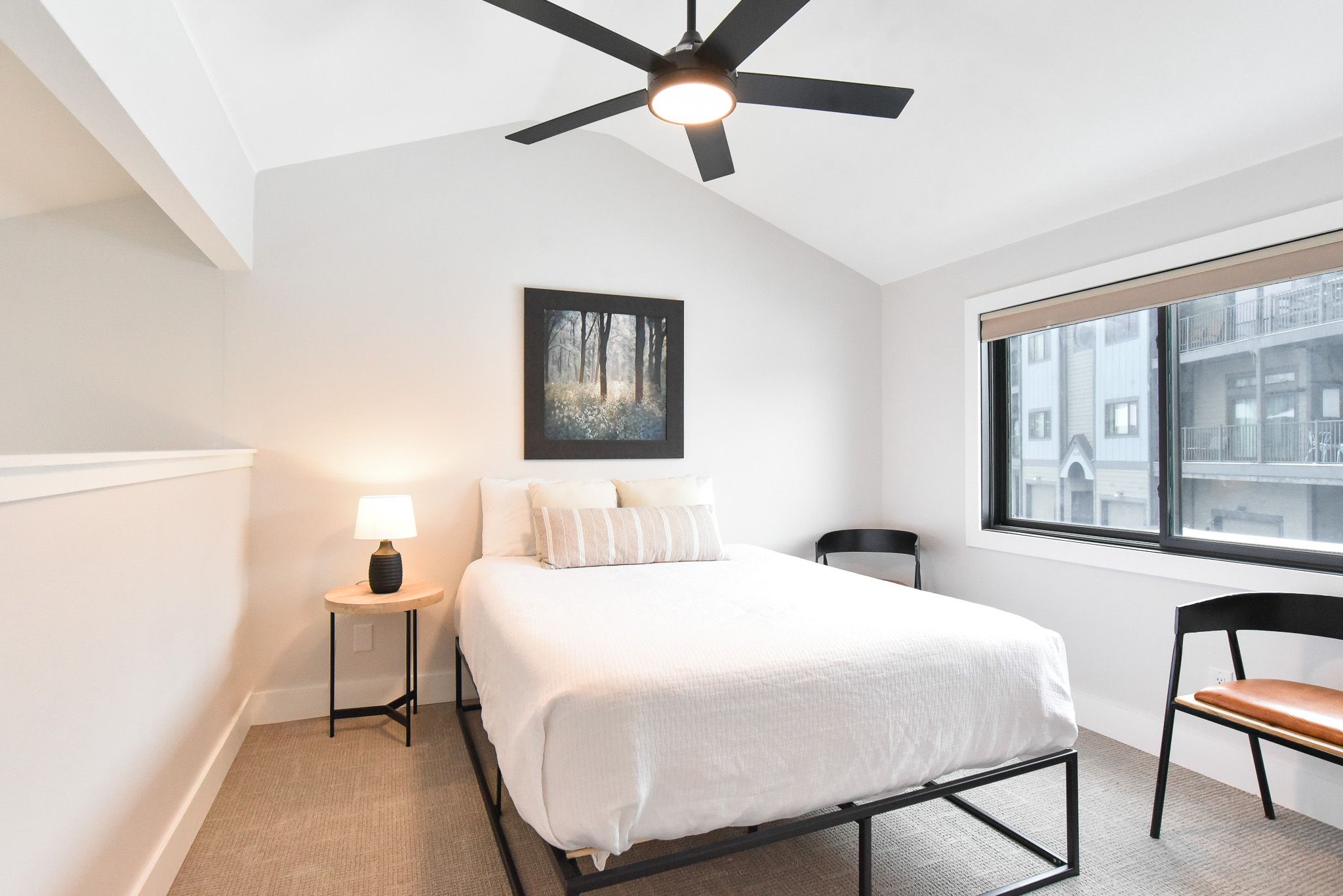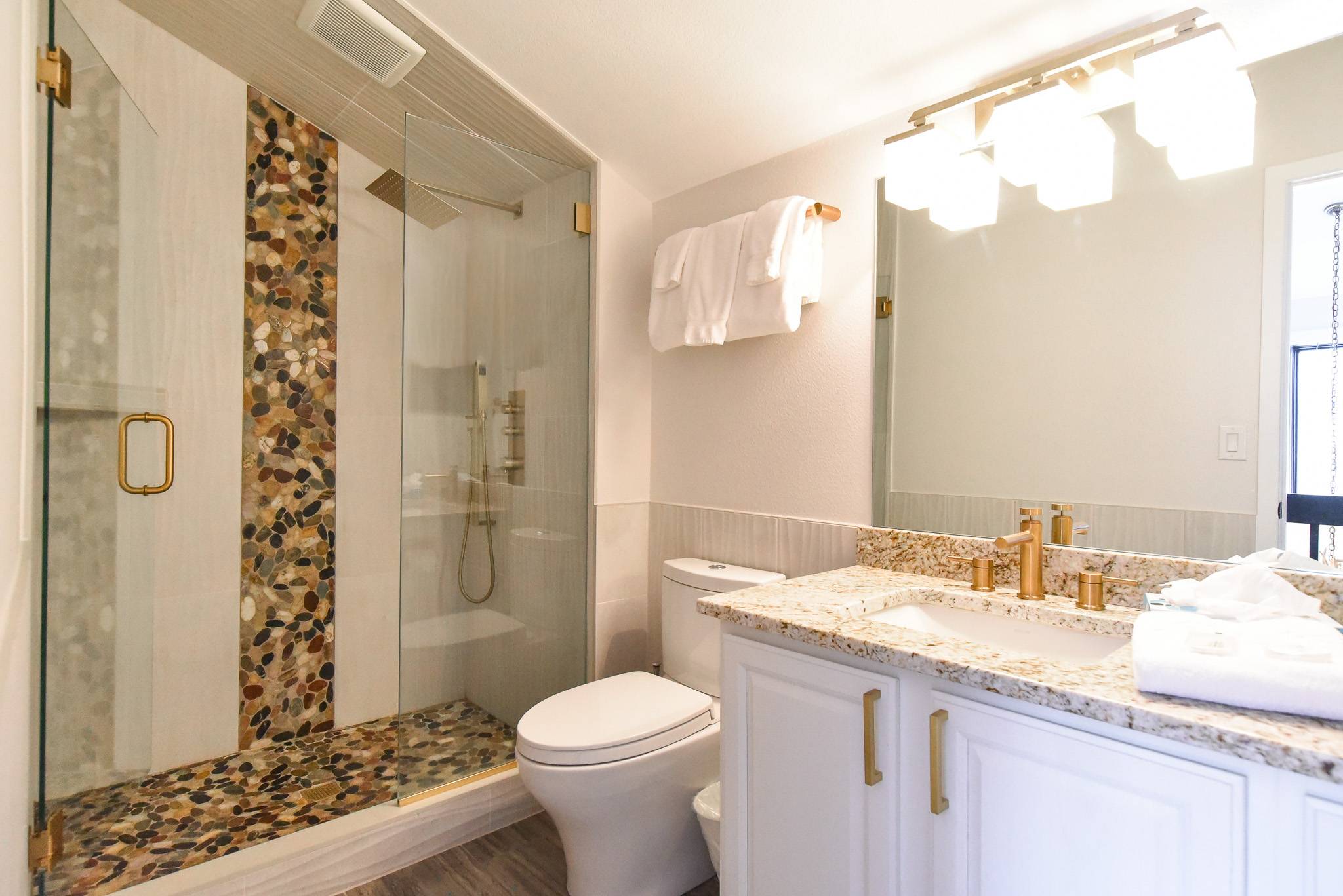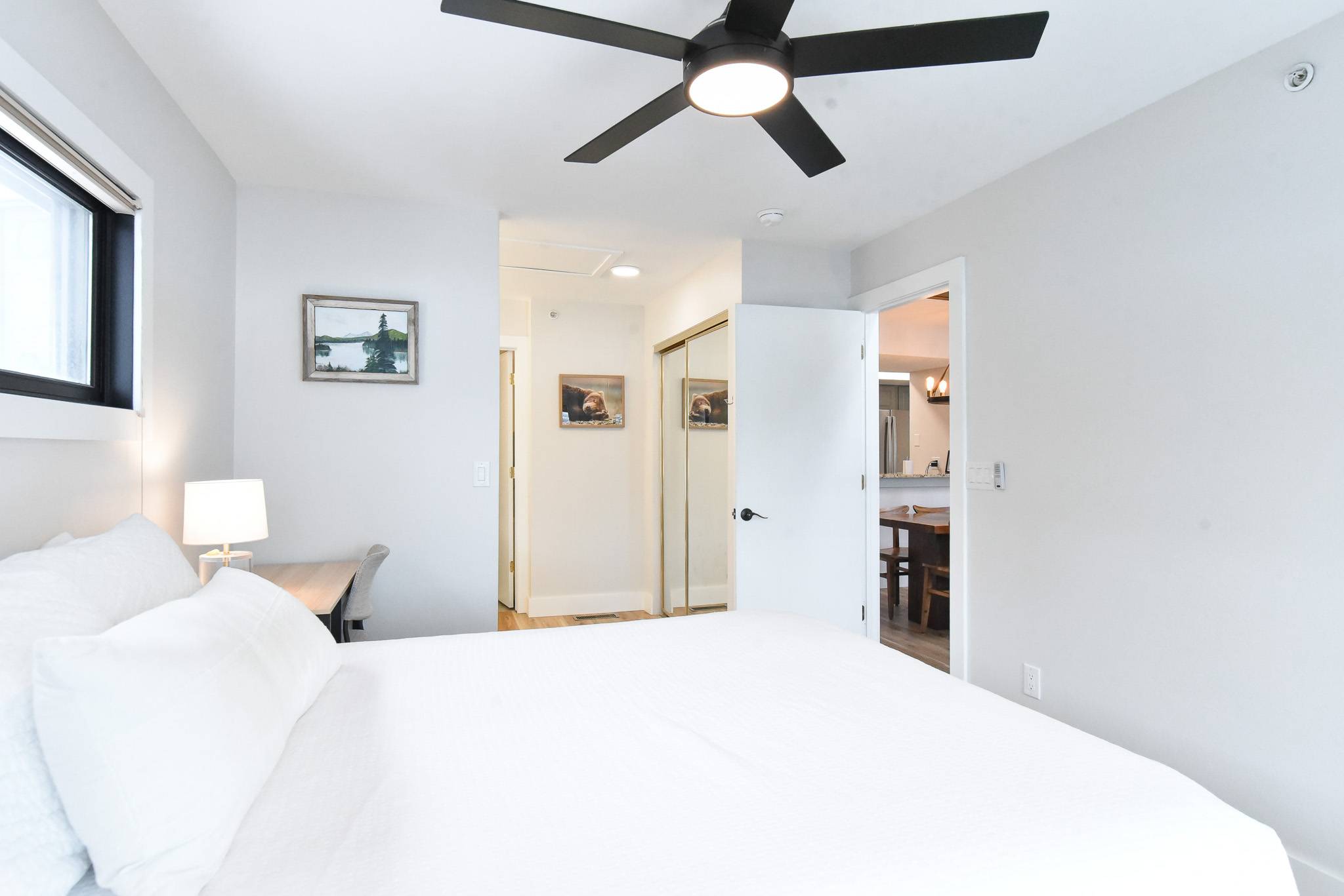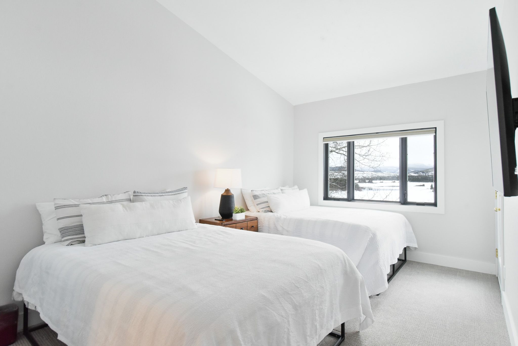 This condo is perfectly suited for families or groups, with dual master suites on the main level. One suite offers a queen bed, ensuite bathroom, direct patio access, and a dedicated desk area for remote work. The second suite includes two queen beds, patio access with lake and mountain views, and a spacious ensuite with dual vanities. Upstairs, the loft provides an additional queen bed and a third full bathroom with a walk-in tiled shower, offering both comfort and privacy for every guest.