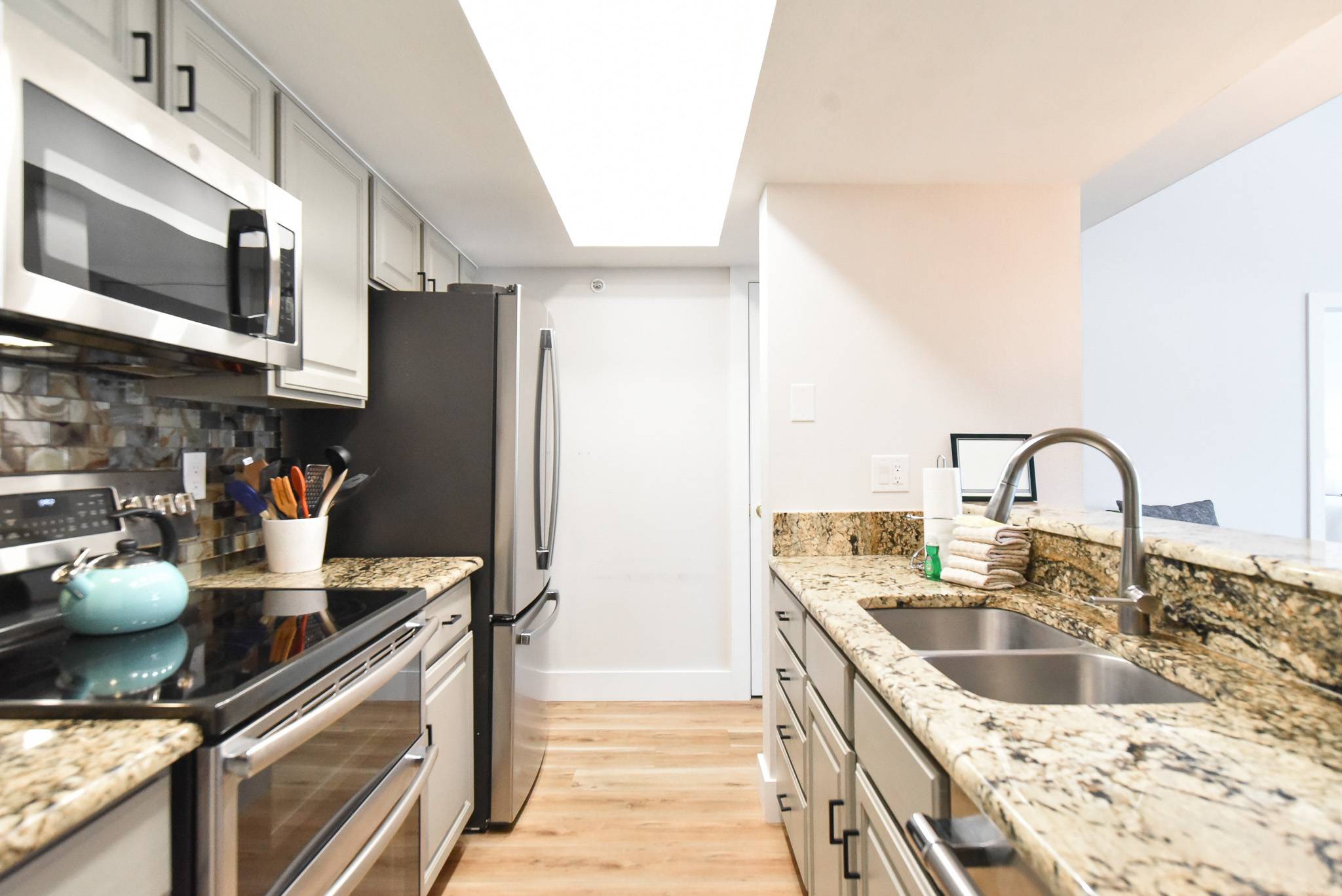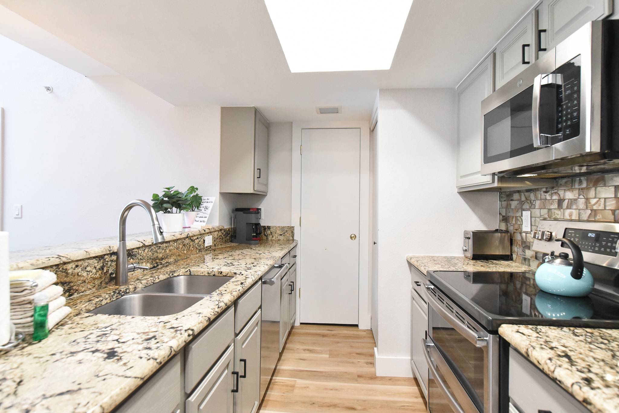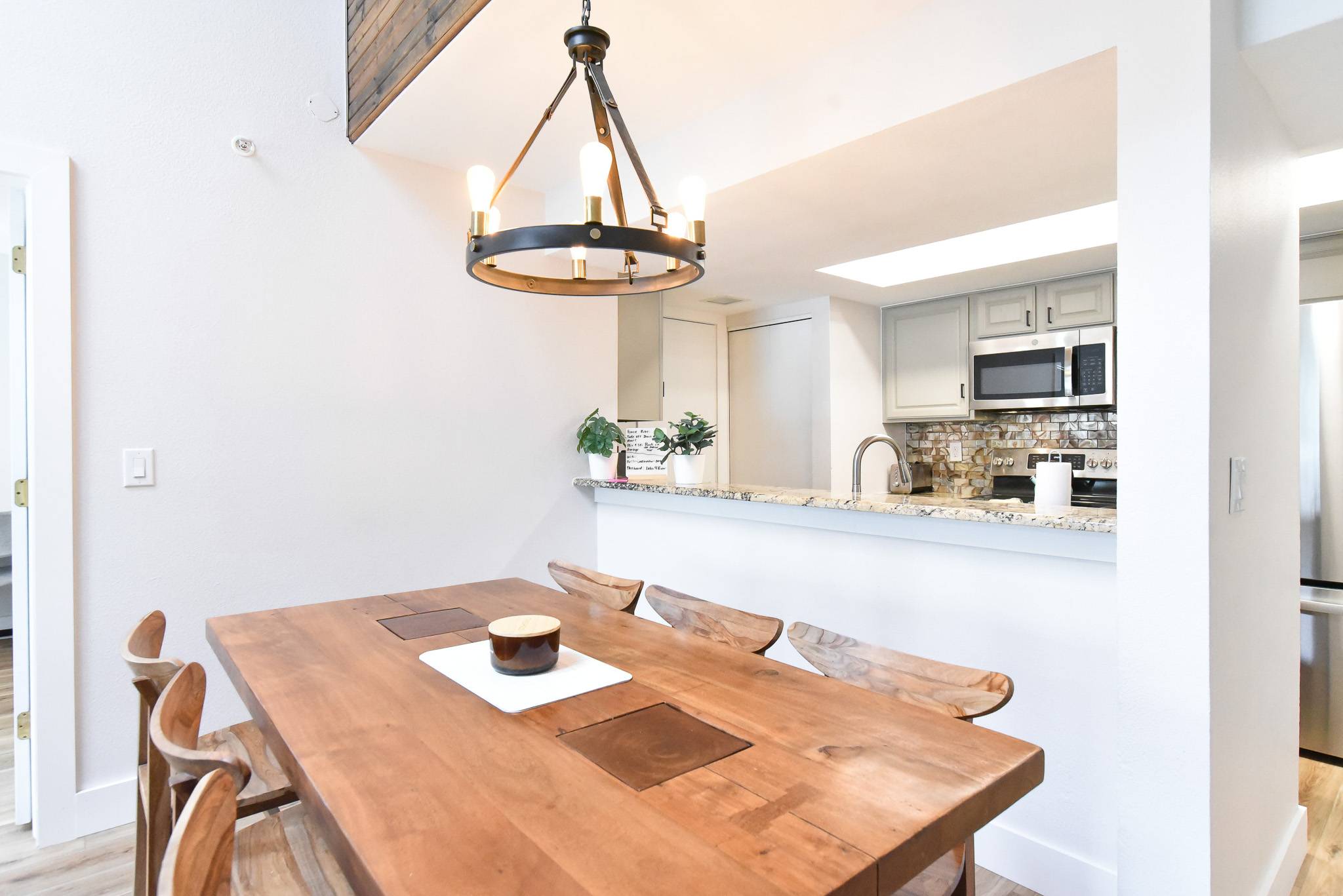 Step inside and you’ll find a bright, inviting living space with soaring ceilings and windows that flood the condo with natural light. The living room is anchored by a stone gas fireplace and features comfortable seating for gathering with family and friends after a day in the mountains. Just off the living area, the private patio provides a quiet place to take in the fresh alpine air. The kitchen has been recently updated with granite countertops, stainless-steel appliances, and all the gear you need to prepare meals, which can be enjoyed at the spacious dining table with room for everyone.