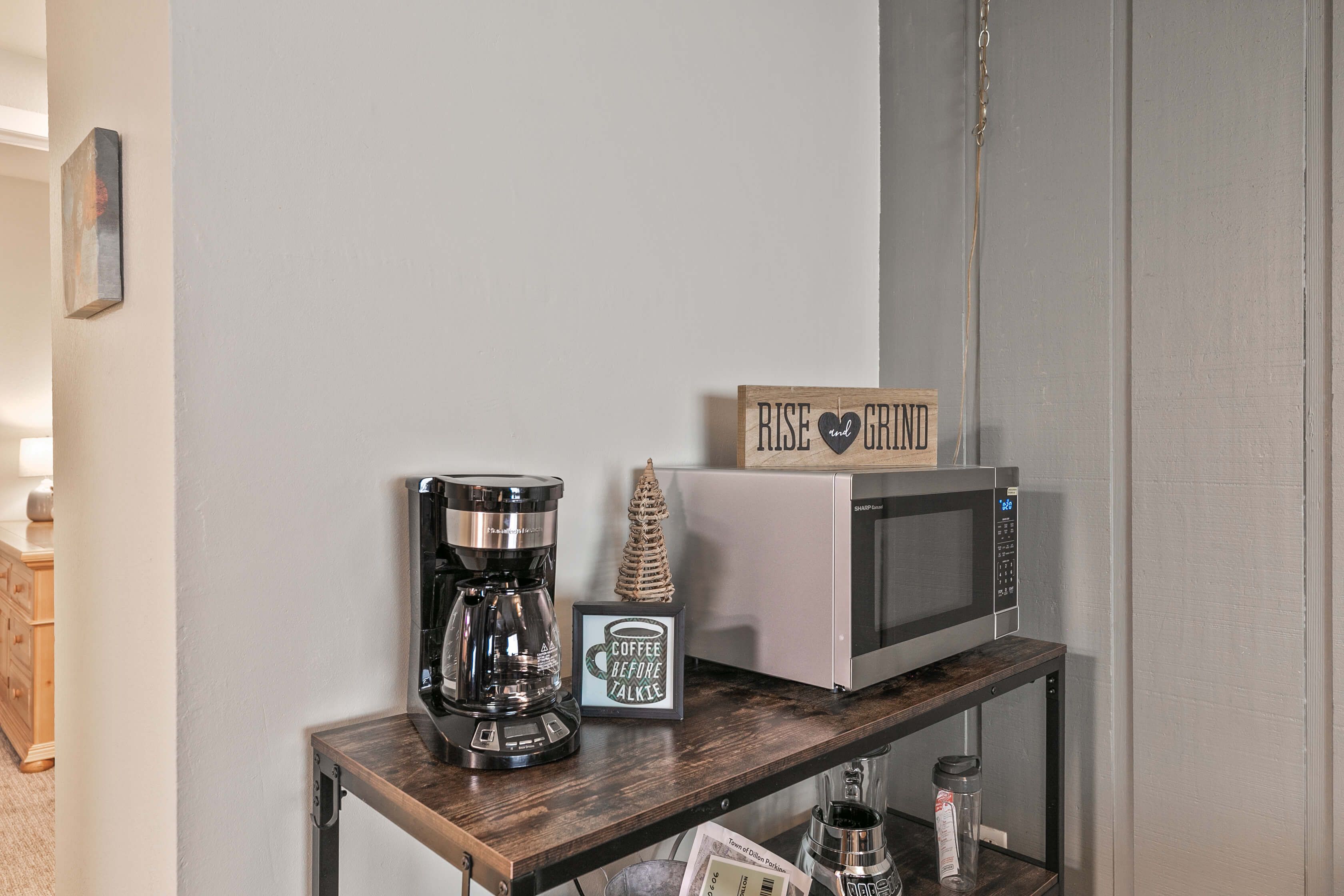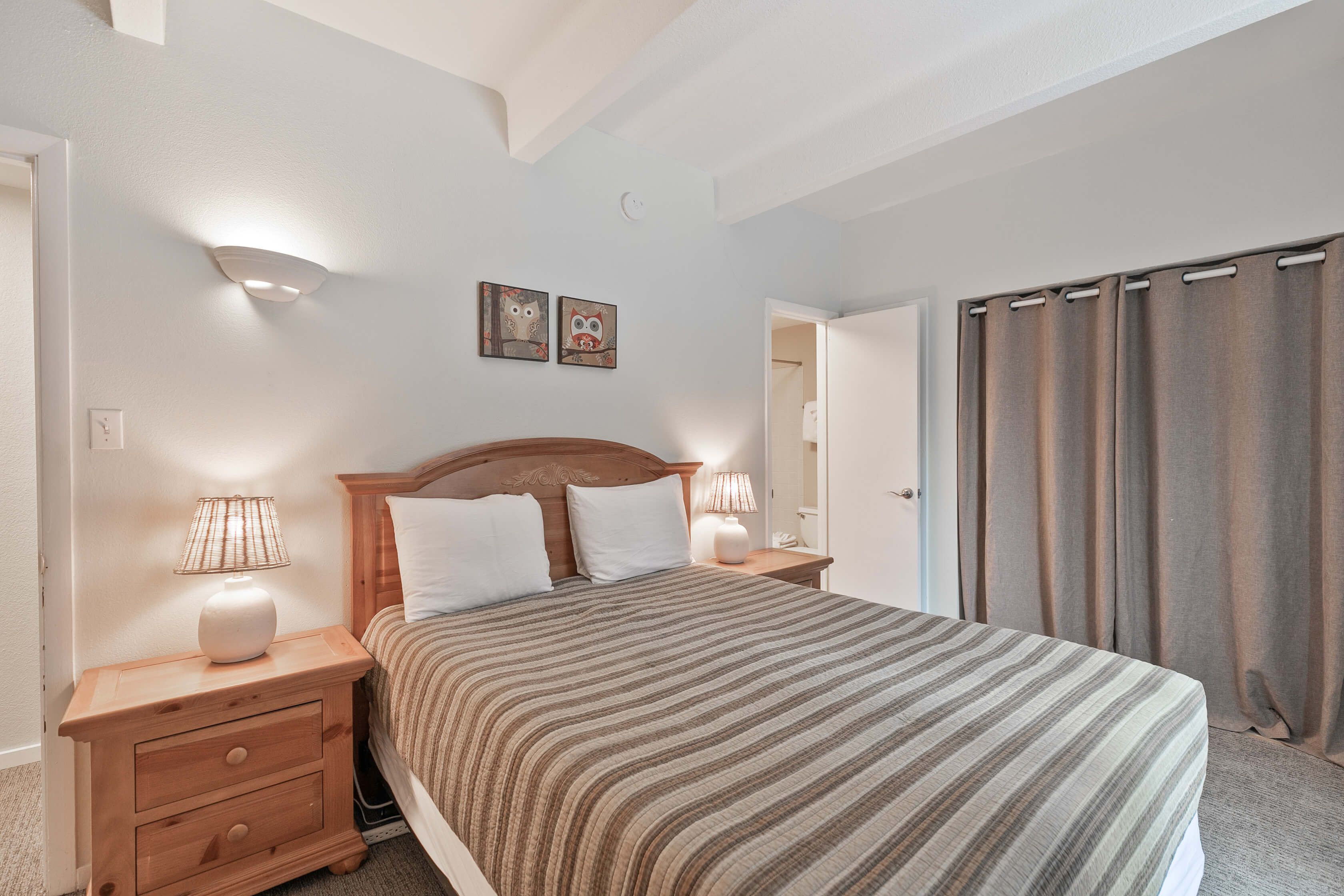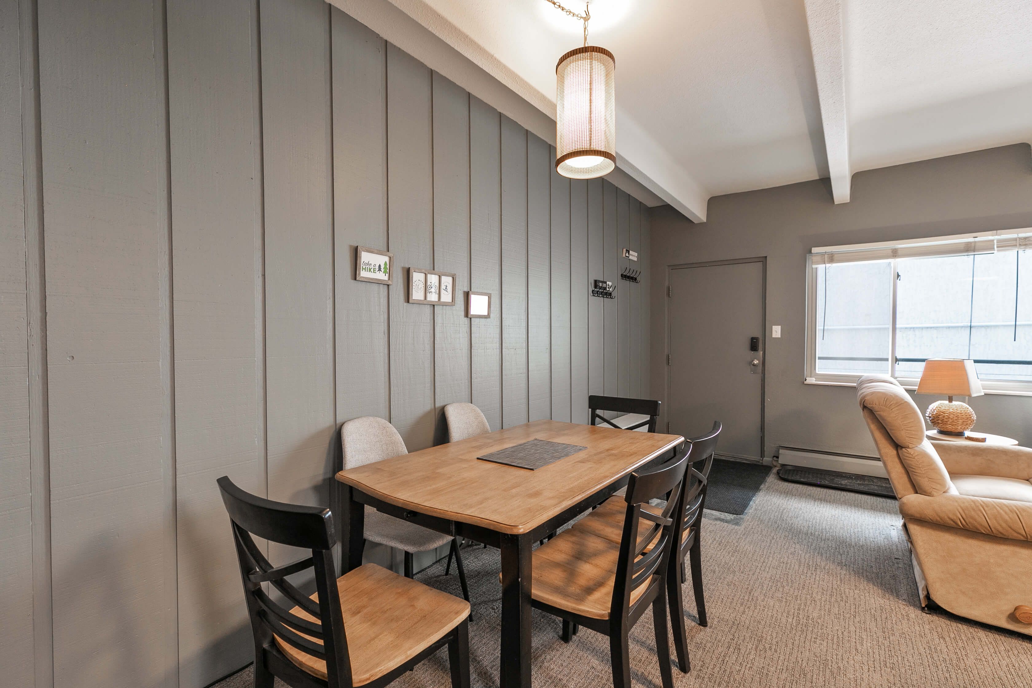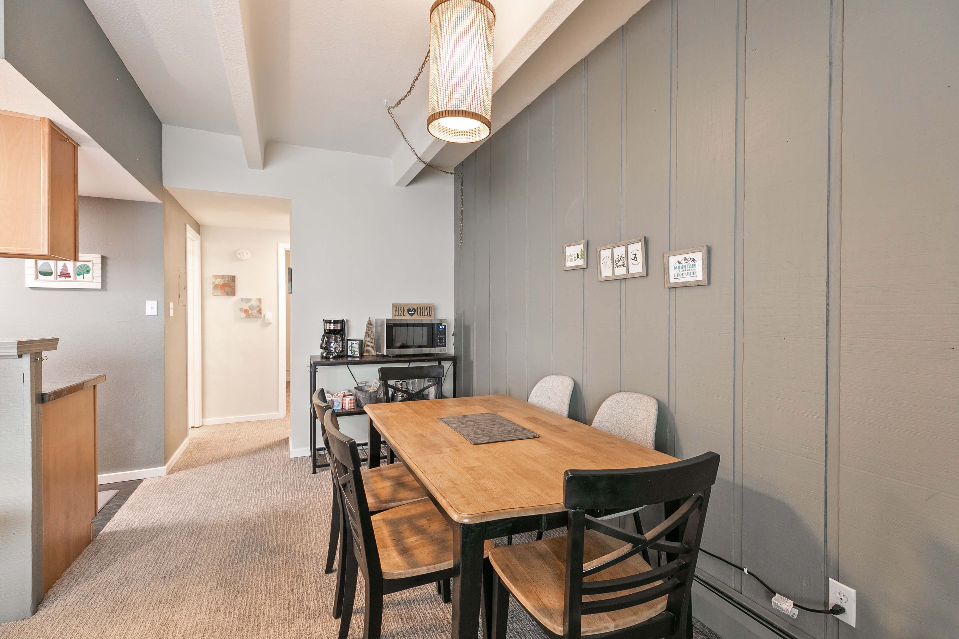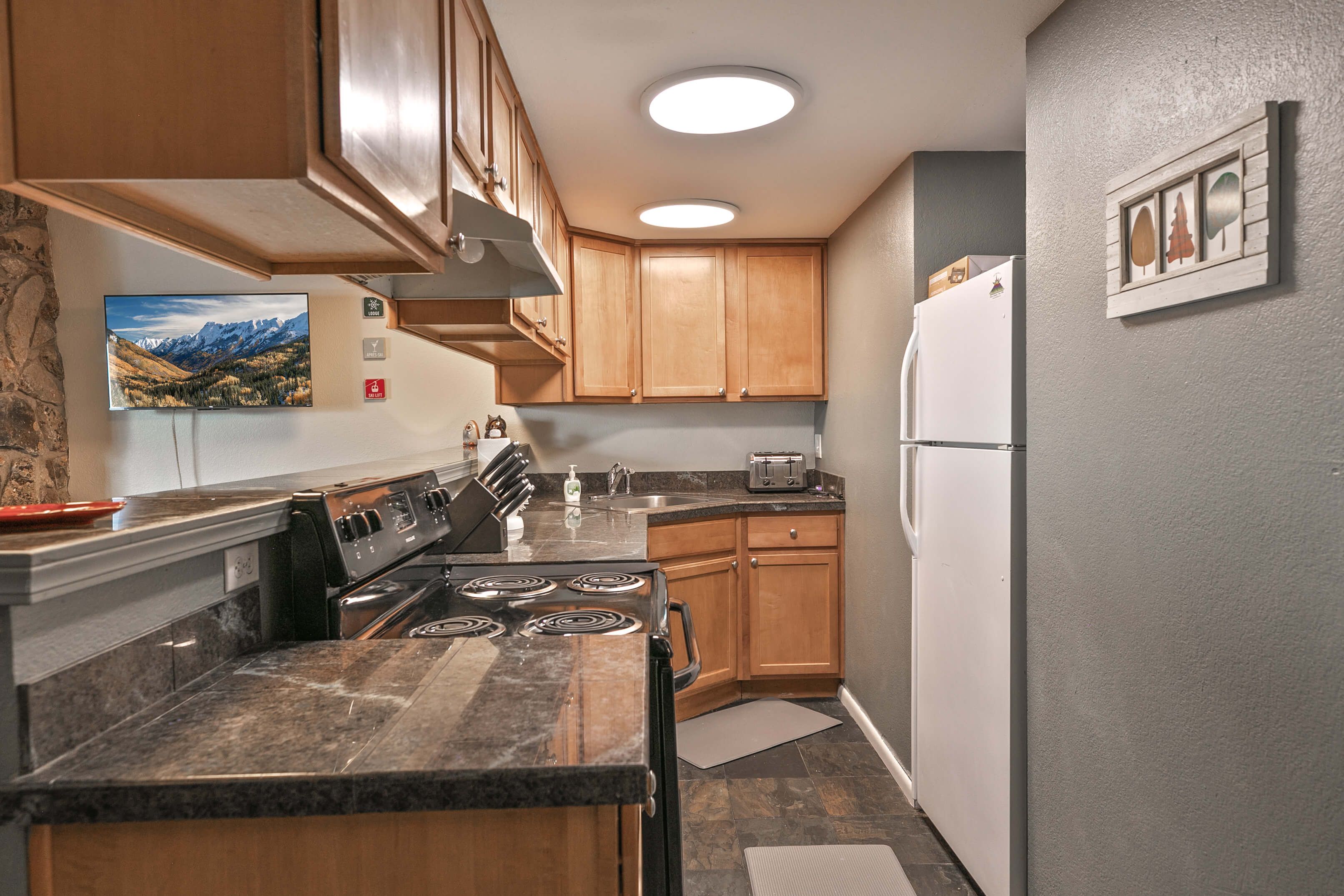 This 2-bedroom, 1-bathroom condo works perfectly for up to six guests. The living area features a stone floor to ceiling gas fireplace along with a flat-screen TV for relaxing after the day’s mountain adventures. The full kitchen has all the gear you’ll need to keep everyone happy and fed, including a dining table for six.