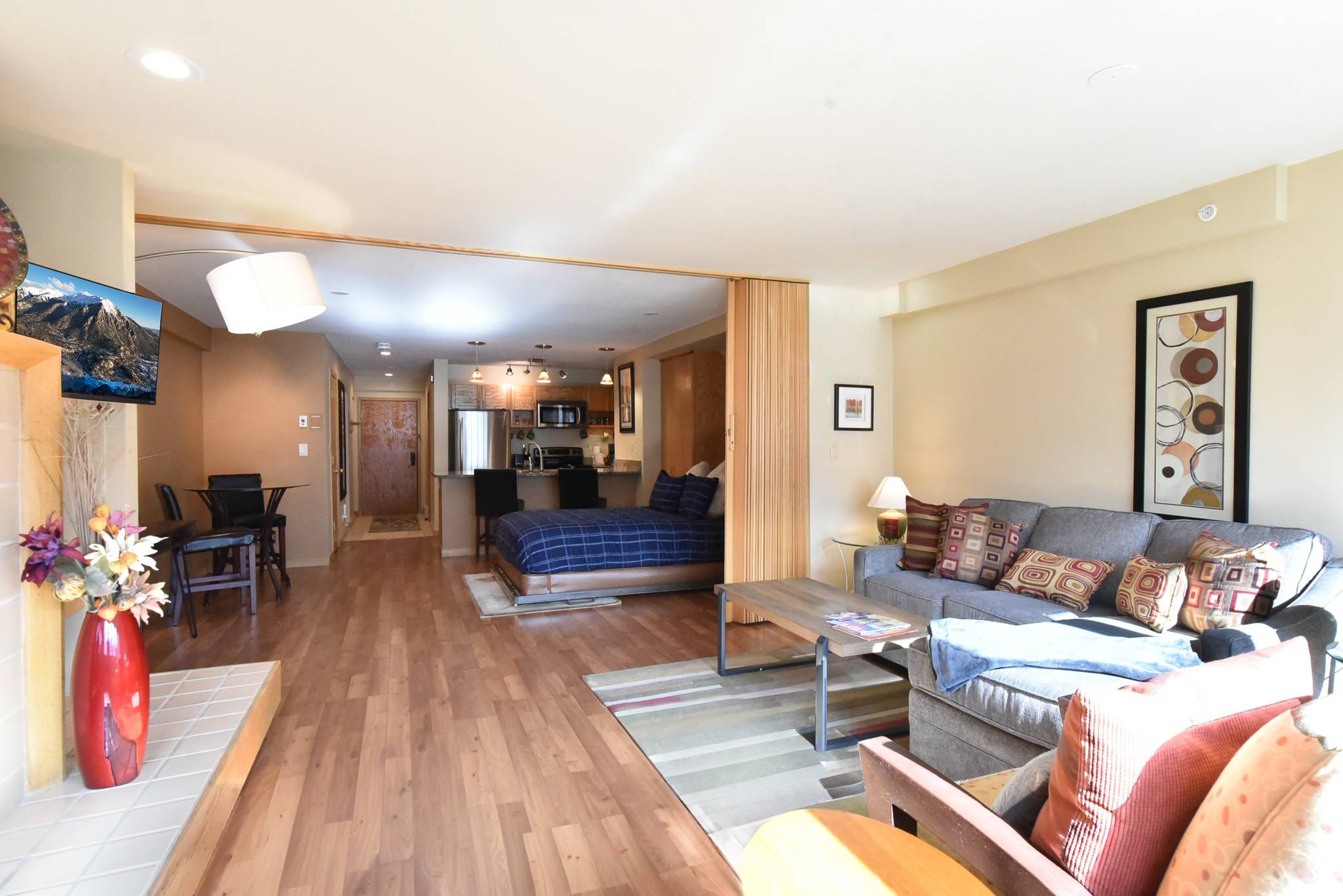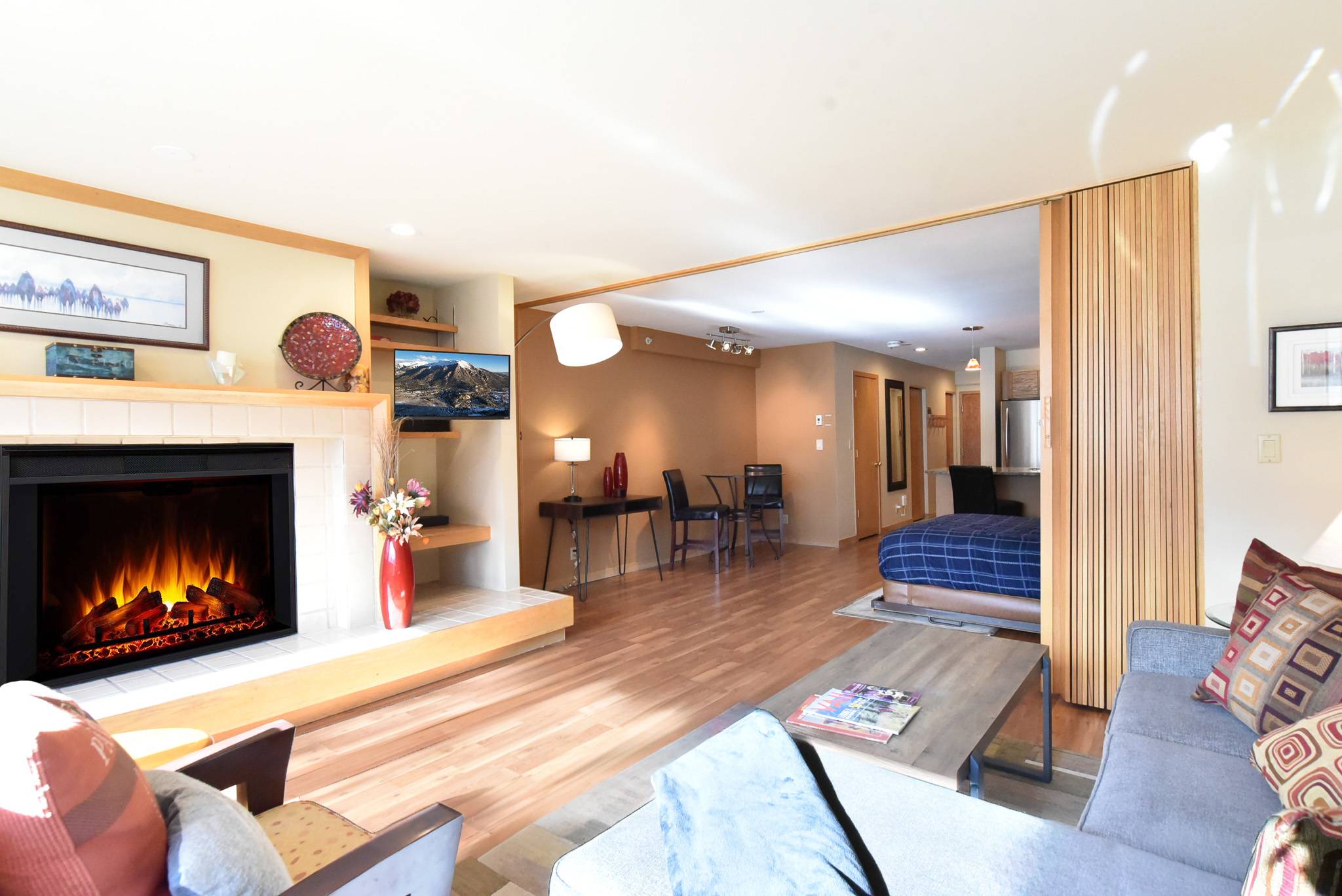 • Living Room: Queen Murphy Bed, Queen Sleeper Sofa, Wood Fireplace, Smart TV, Desk/Workstation. (Sleeps 4)