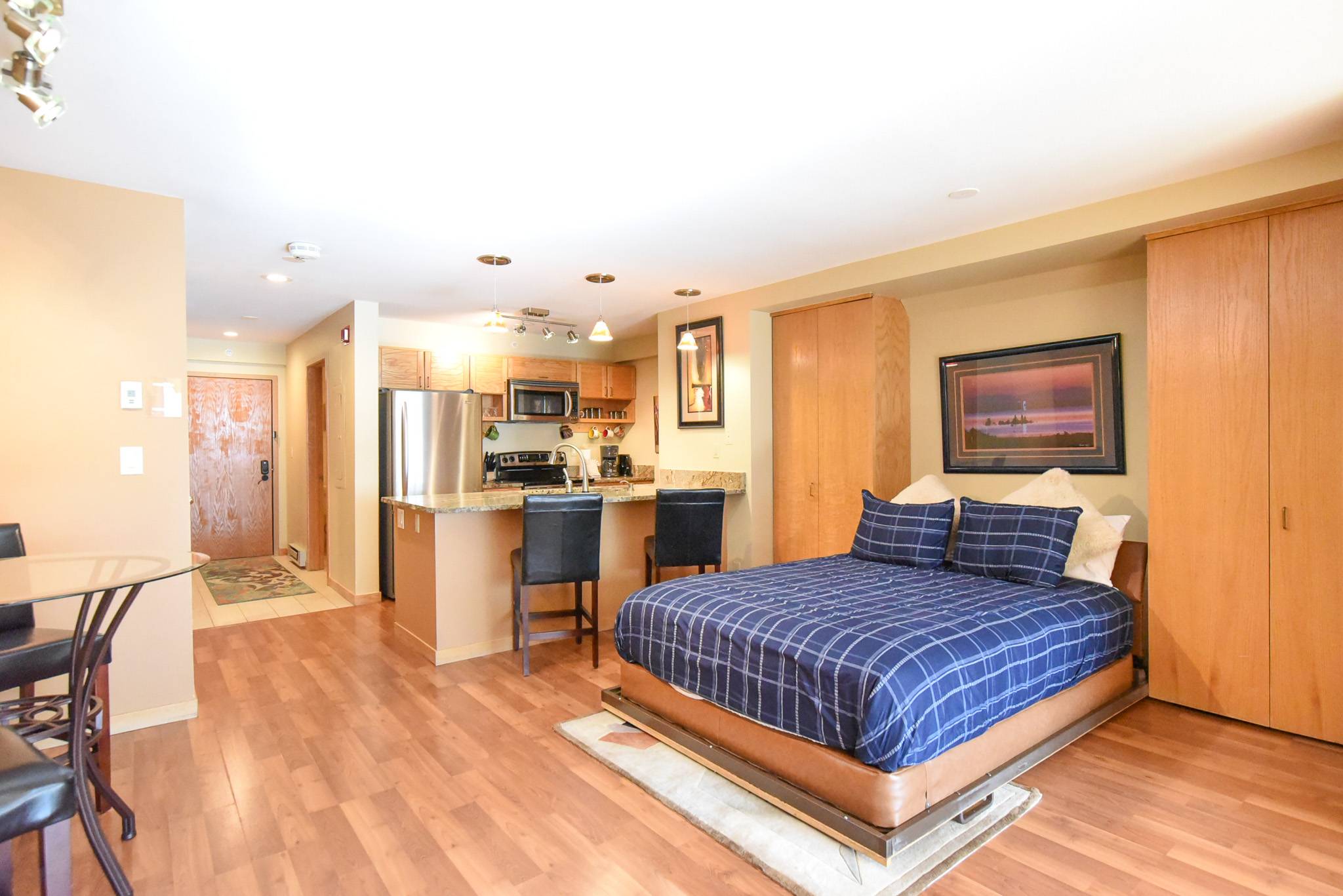 Inside, you’ll find everything you need for a comfortable visit. The full-size kitchen includes an oven, stove, refrigerator, and breakfast bar for enjoying meals at home, while the dining table offers space to gather after a day on the mountain. The living area is warm and inviting, with comfortable seating, a wood-burning fireplace (guests provide their own wood), a smart TV, and a convenient workspace for anyone mixing work and play. The queen Murphy bed folds up easily to open up the living area, and there’s also a queen sleeper sofa for additional guests. The full bathroom features heated tile floors and a shower/tub combination.
